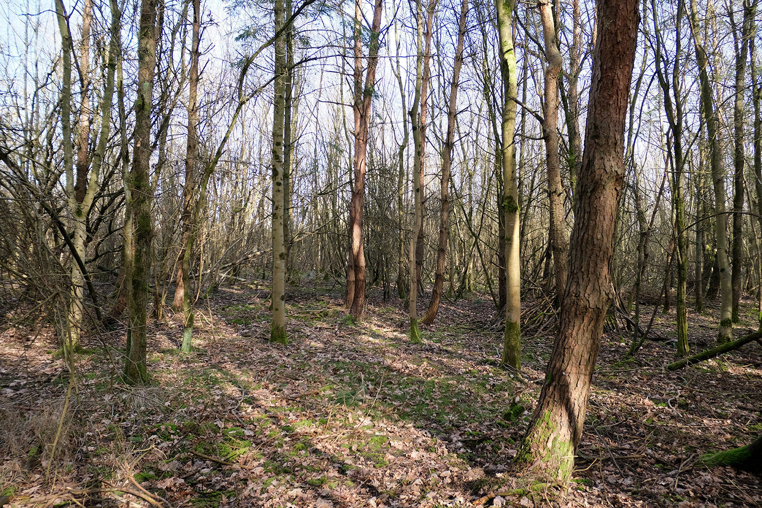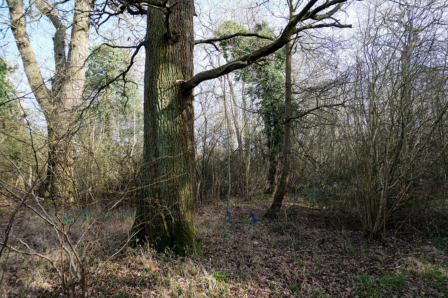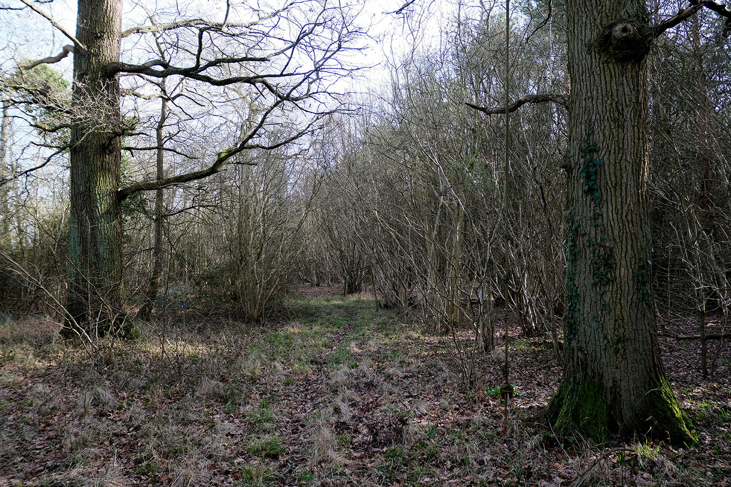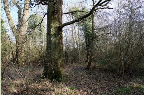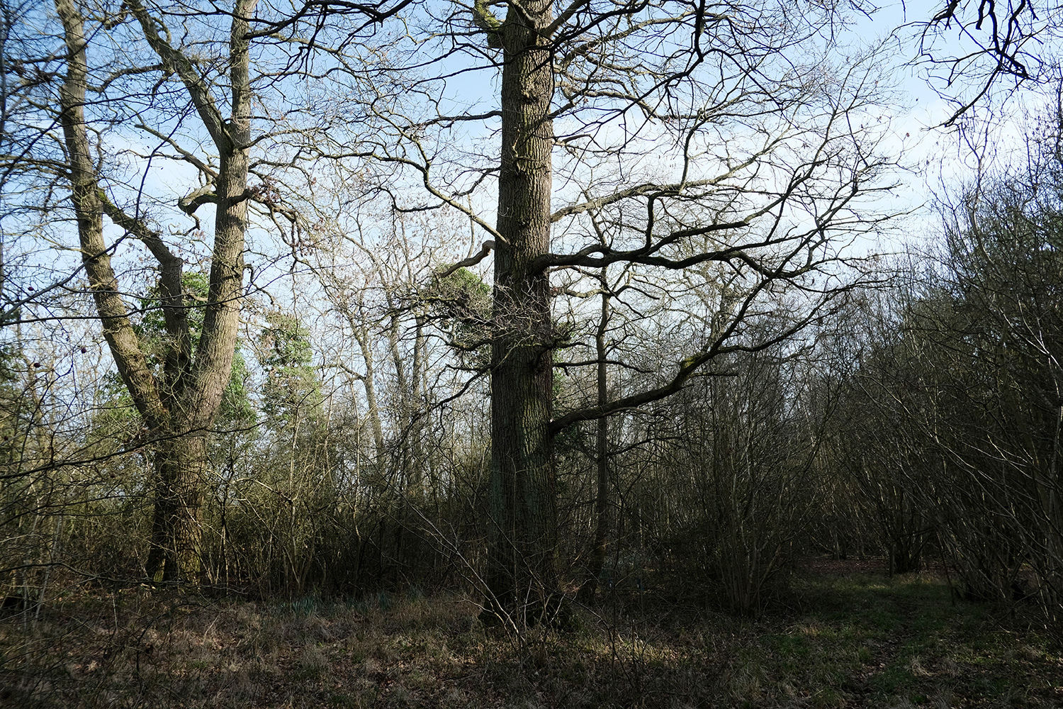 The woodland is predominantly oak, with trees of varying ages and a number of veteran specimens lining the main ride, creating an impressive sense of scale despite its modest size. Scots pine and hazel coppice form the majority of the stock elsewhere, interspersed with oak and ash, most of which are approximately 15–20 years old. Blackthorn, cherry and birch are also present throughout the site.