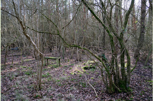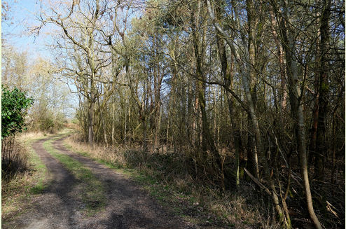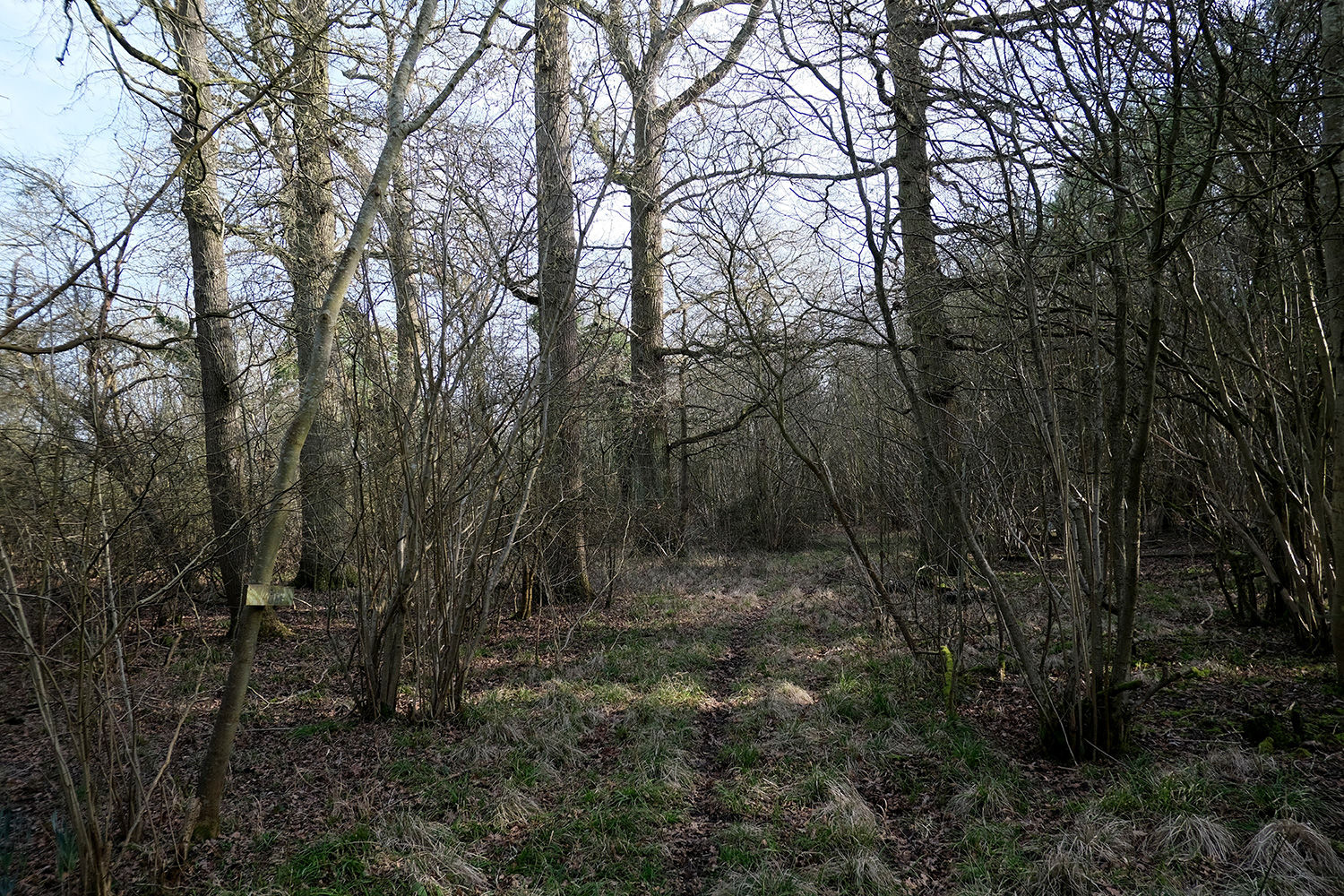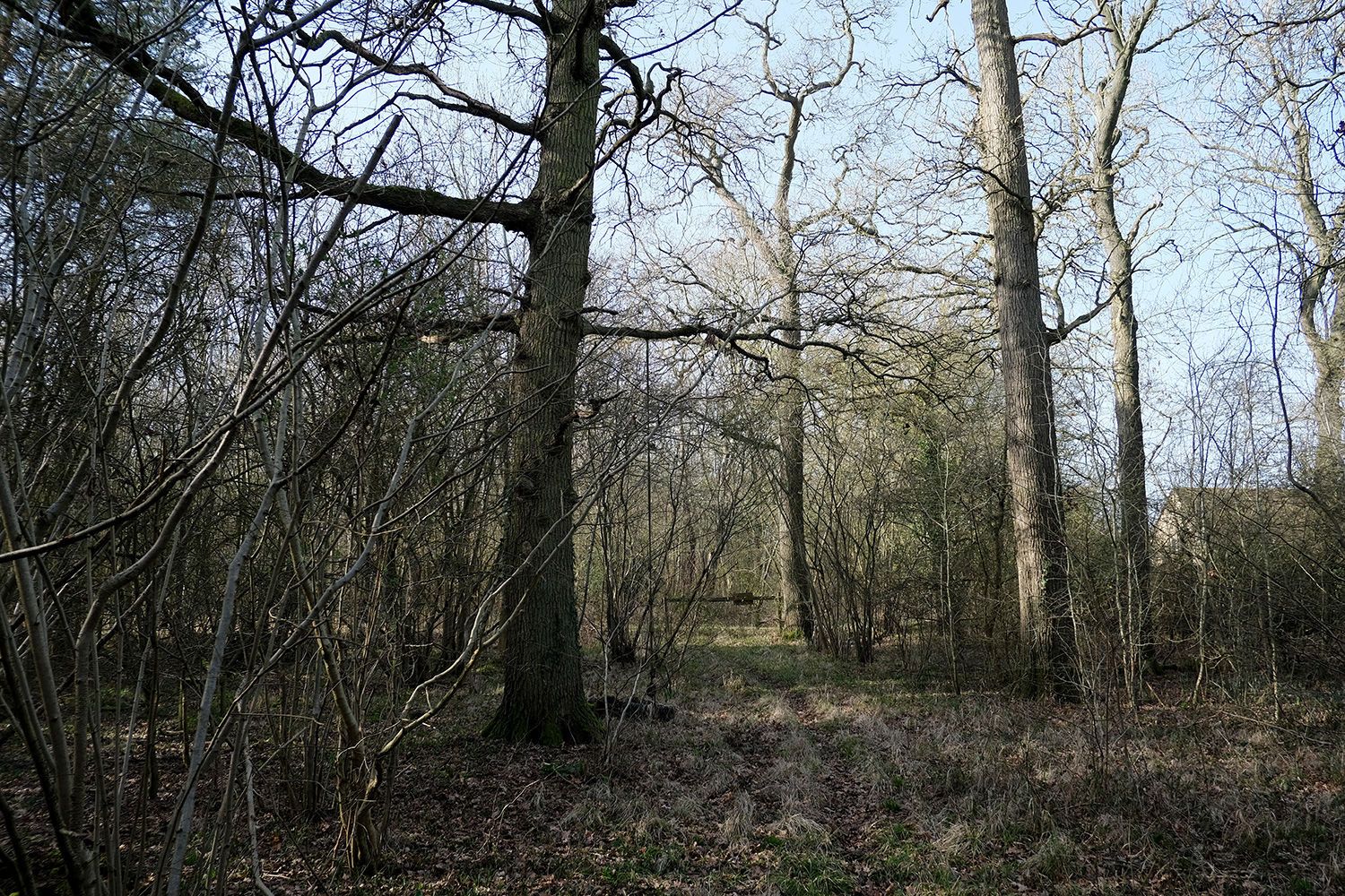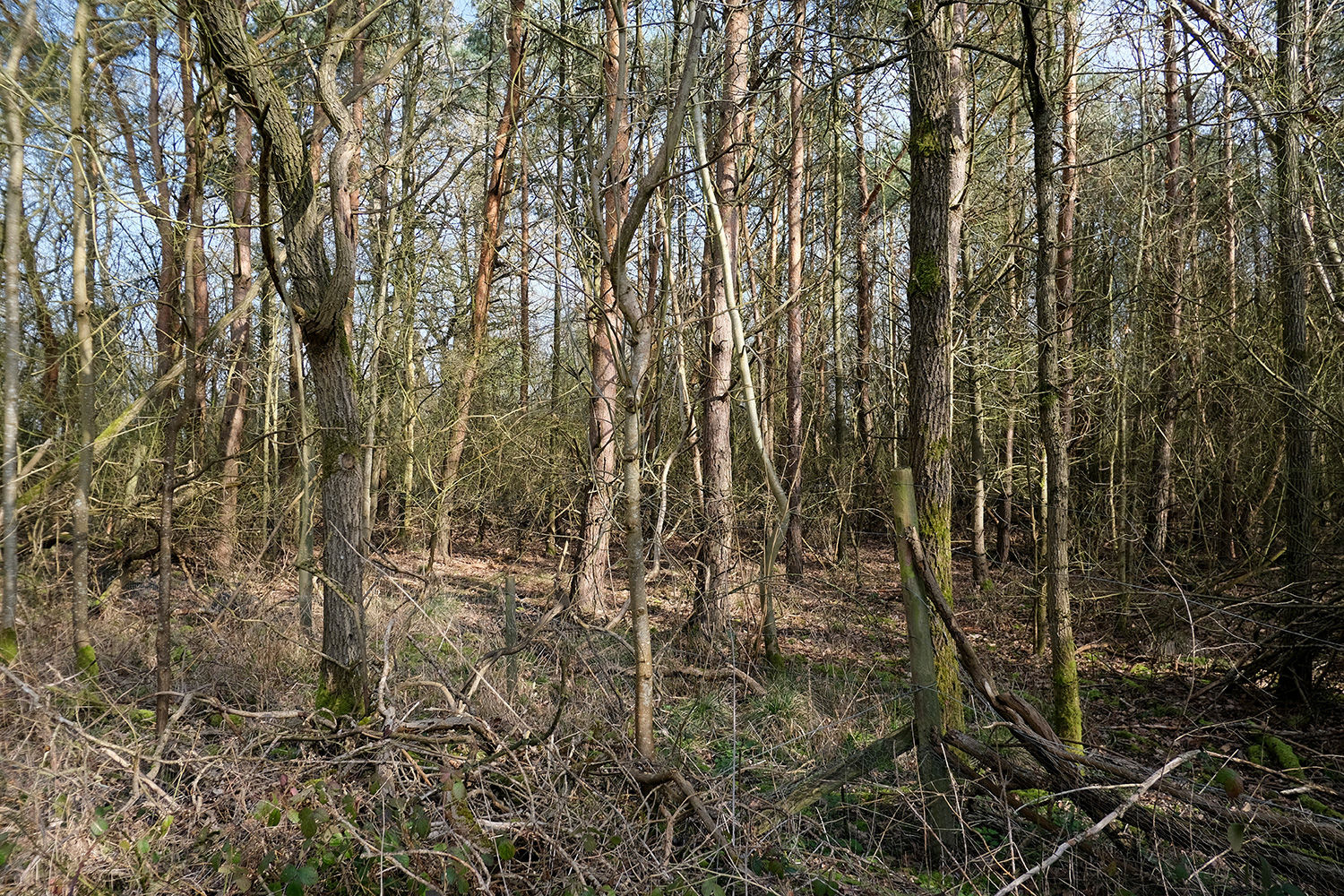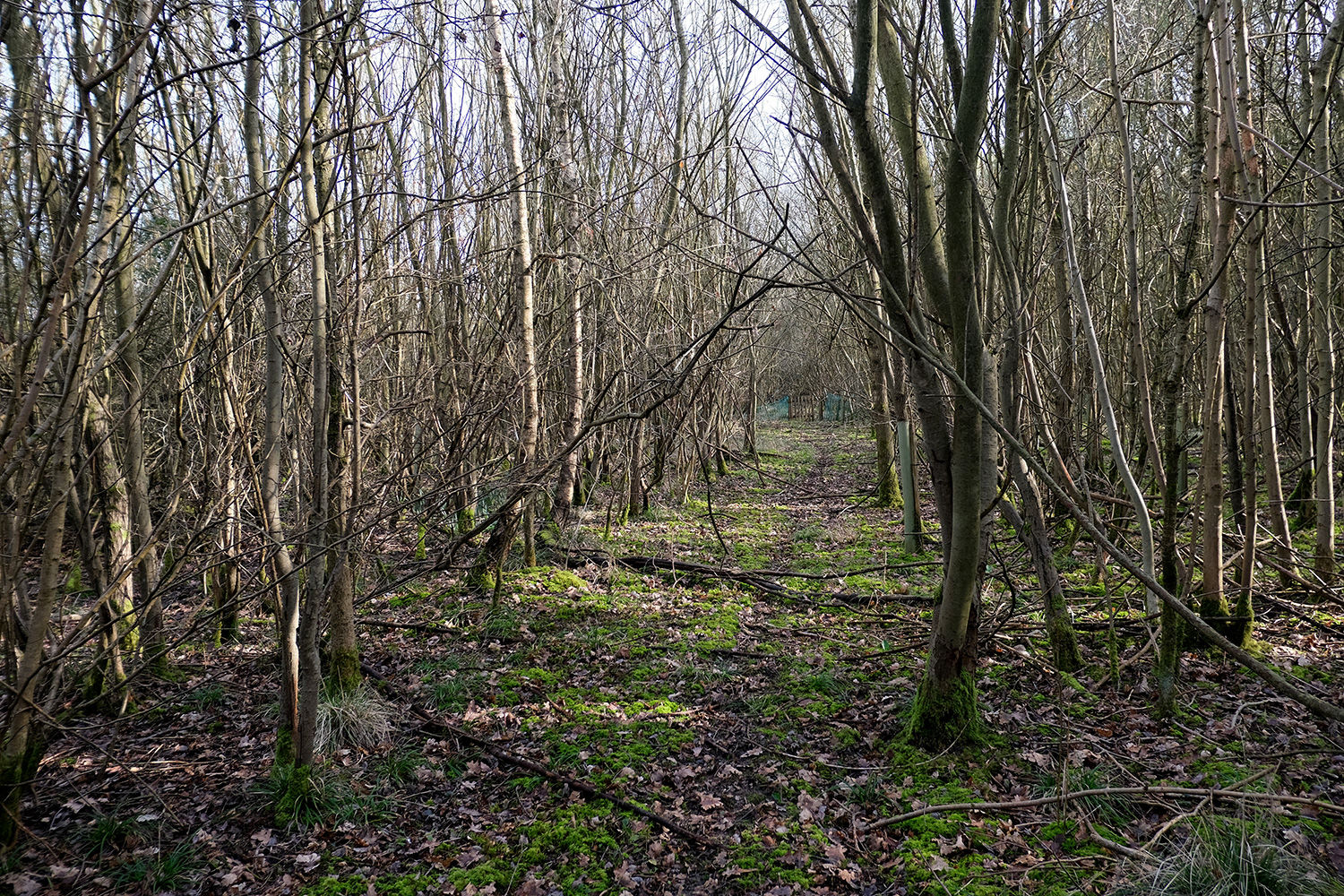 The woodland is predominantly oak, with trees of varying ages and a number of veteran specimens lining the main ride, creating an impressive sense of scale despite its modest size. Scots pine and hazel coppice form the majority of the stock elsewhere, interspersed with oak and ash, most of which are approximately 15–20 years old. Blackthorn, cherry and birch are also present throughout the site.