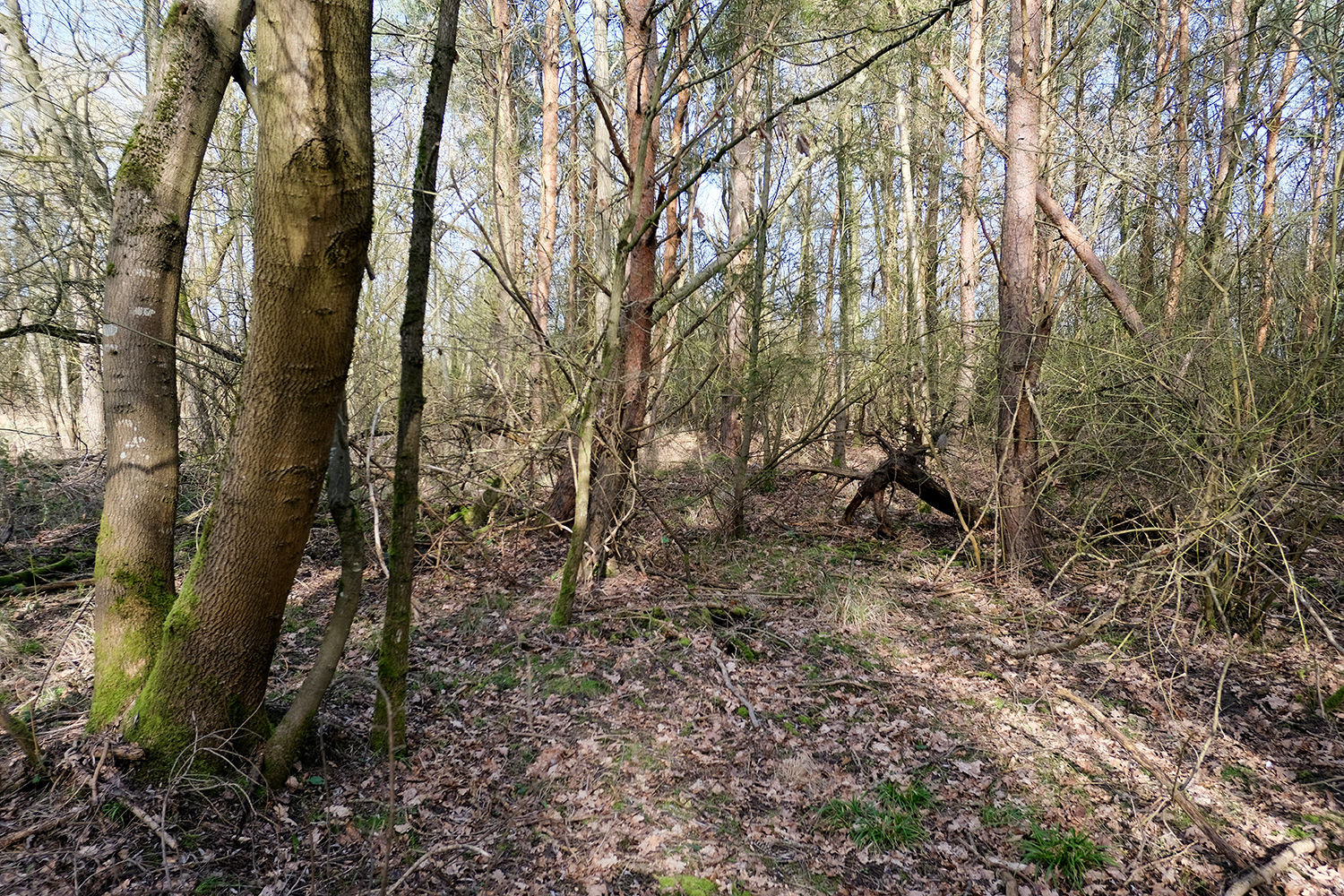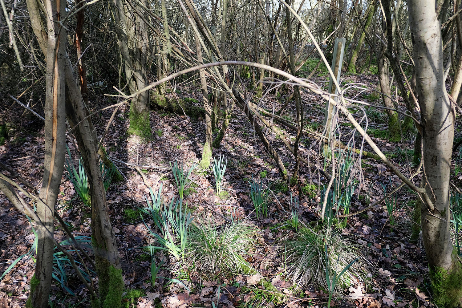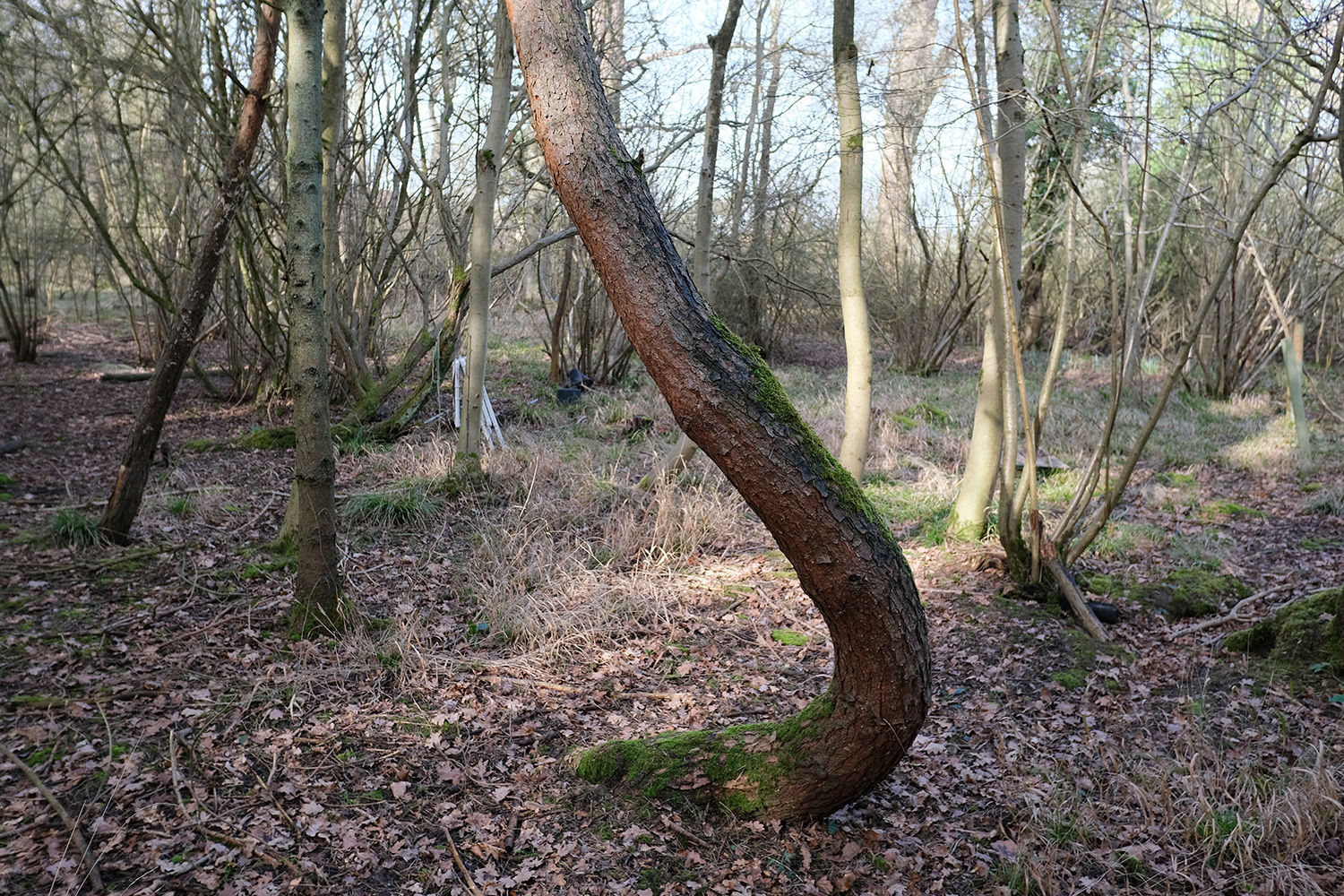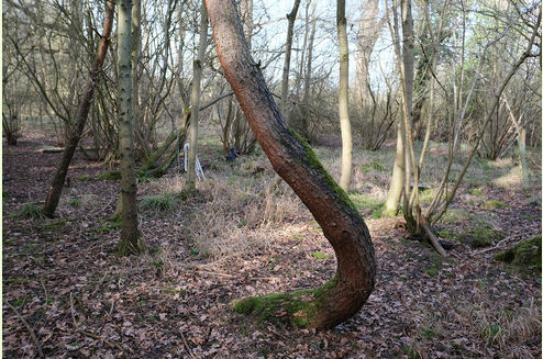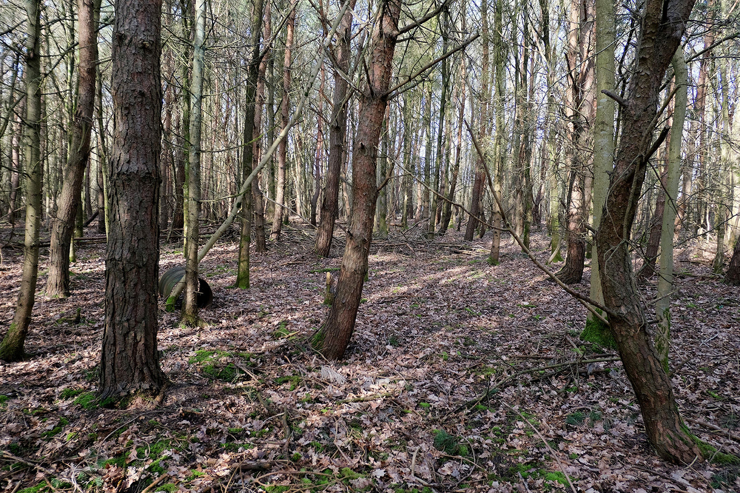 The woodland is predominantly oak, with trees of varying ages and a number of veteran specimens lining the main ride, creating an impressive sense of scale despite its modest size. Scots pine and hazel coppice form the majority of the stock elsewhere, interspersed with oak and ash, most of which are approximately 15–20 years old. Blackthorn, cherry and birch are also present throughout the site.