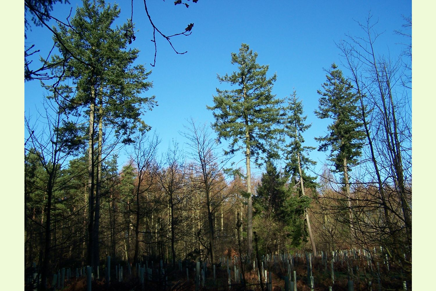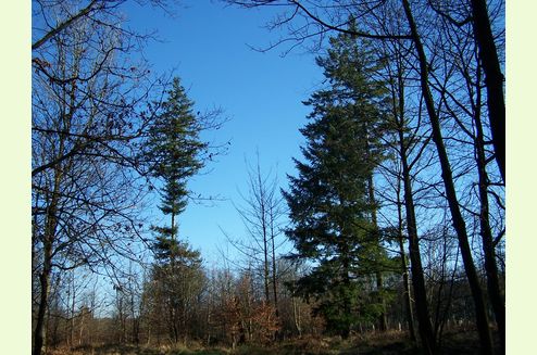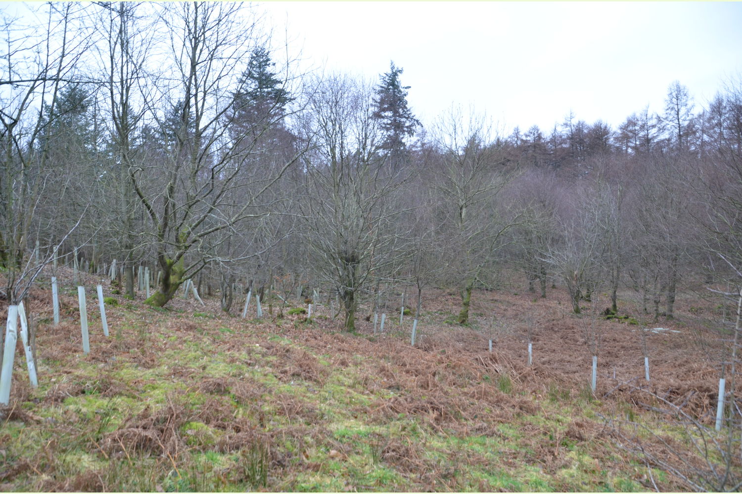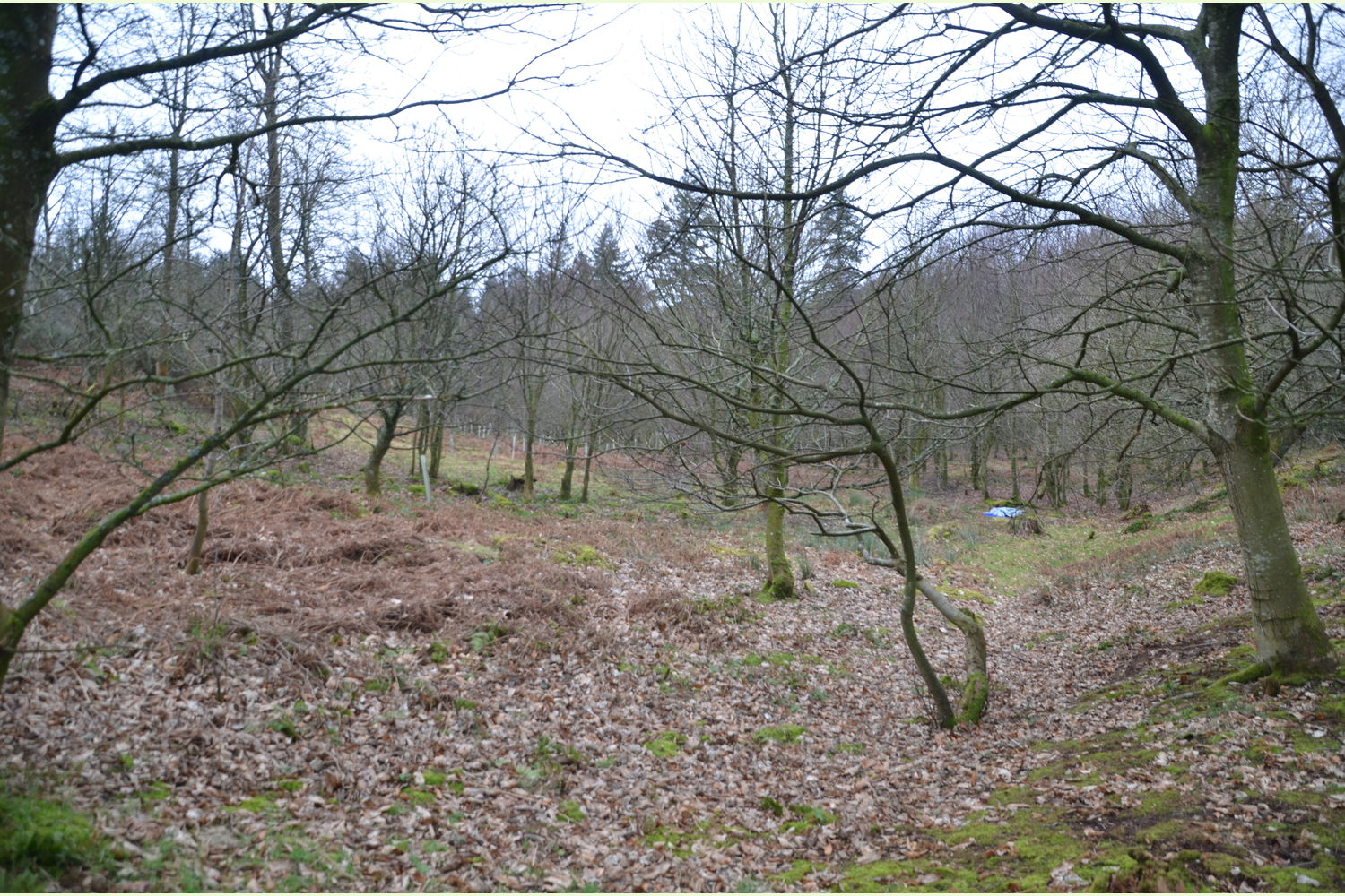 Trees: Noble fir, larch and spruce still remain from the woods plantation heritage. Replanted species include sweet chestnut, oak and sycamore and together with a natural regrowth of hawthorn, rowan and wych elm. Several mature beech trees, together with their progeny, can also be found throughout the wood.