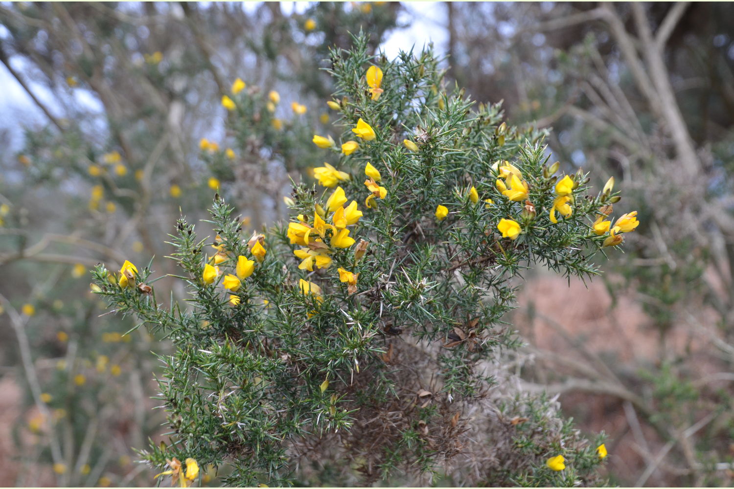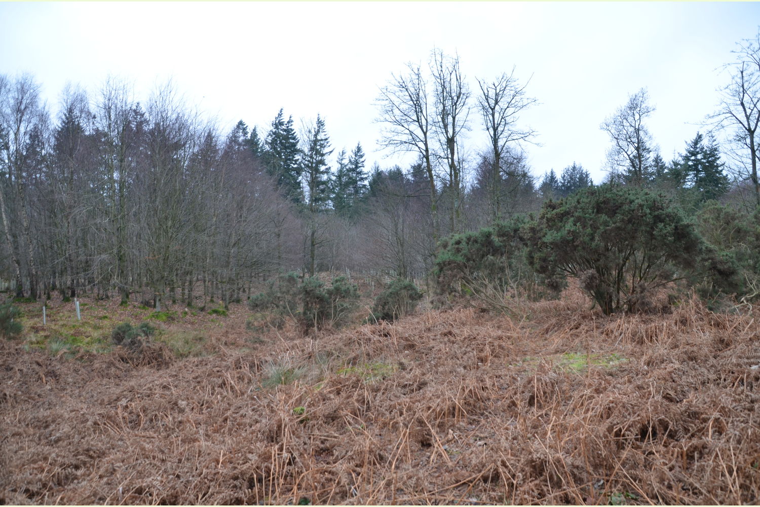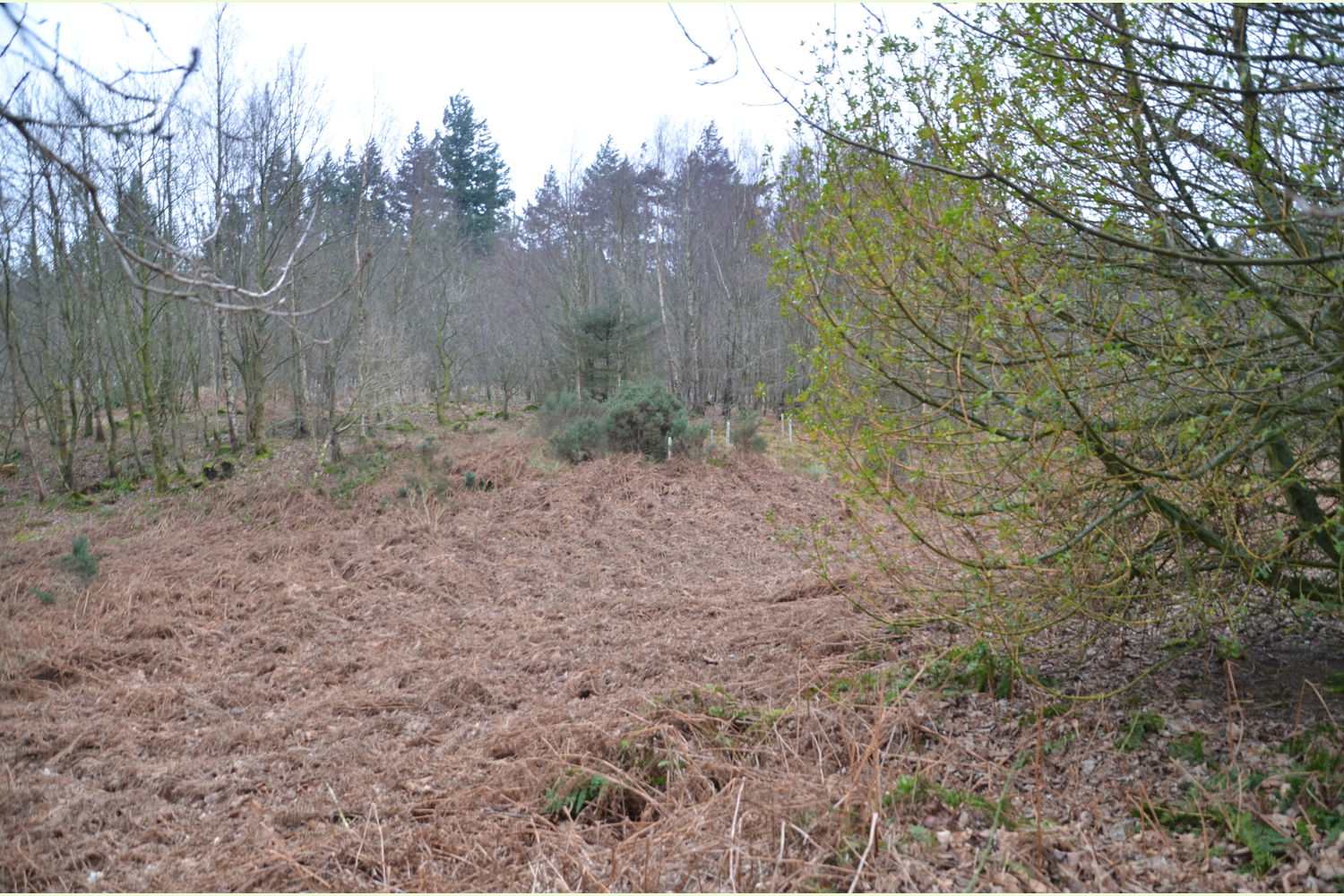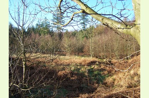 Formerly a plantation woodland, most of the last harvested trees of this agricultural practice have been replaced by a wide variety of native broadleaf saplings that are now thriving, giving the wood a more wild and natural feel that belies its previous use. Of particular note are the impressively majestic fir trees that grow along the southwestern boundary; beneath these, the ground is carpeted with mosses, wood sorrel and bugle. Where space and light allow, broom and gorse provide splashes of yellow flowers and contrast with the pinks of wild raspberry and foxglove.