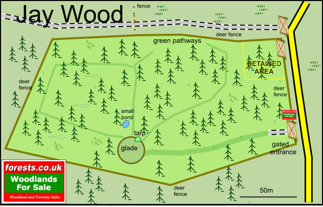 The boundaries of the wood are defined by a deer fence as marked on the detail map. A small area is to be retained by the current owner. This is marked on the ground by fence posts and a yellow string line.
