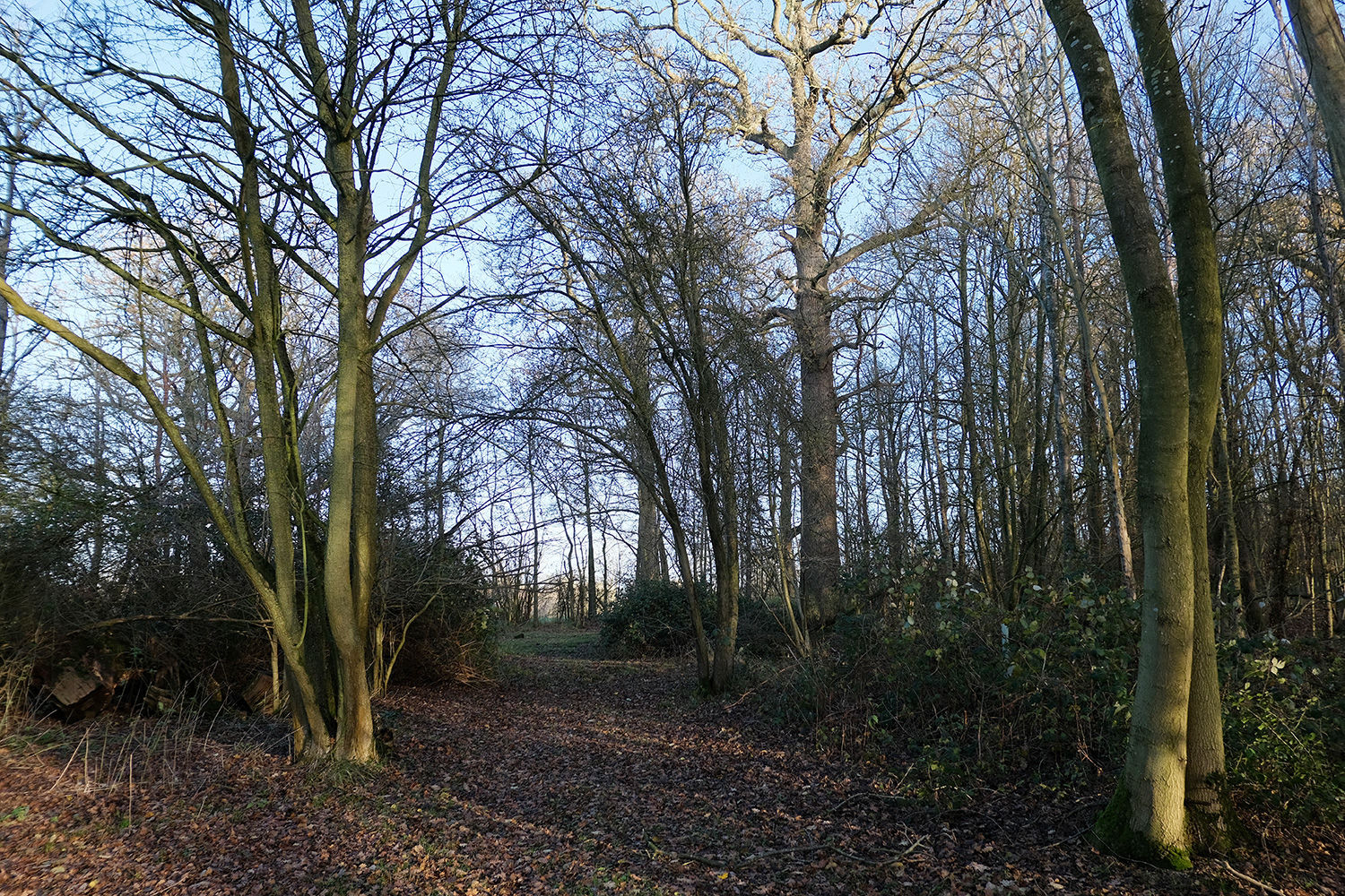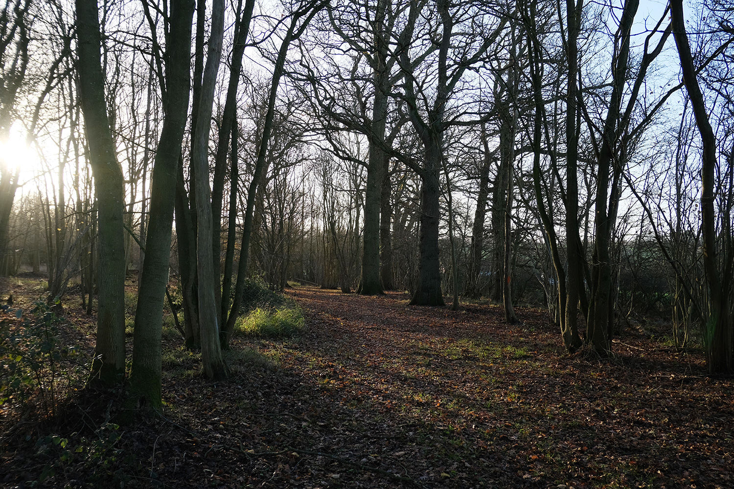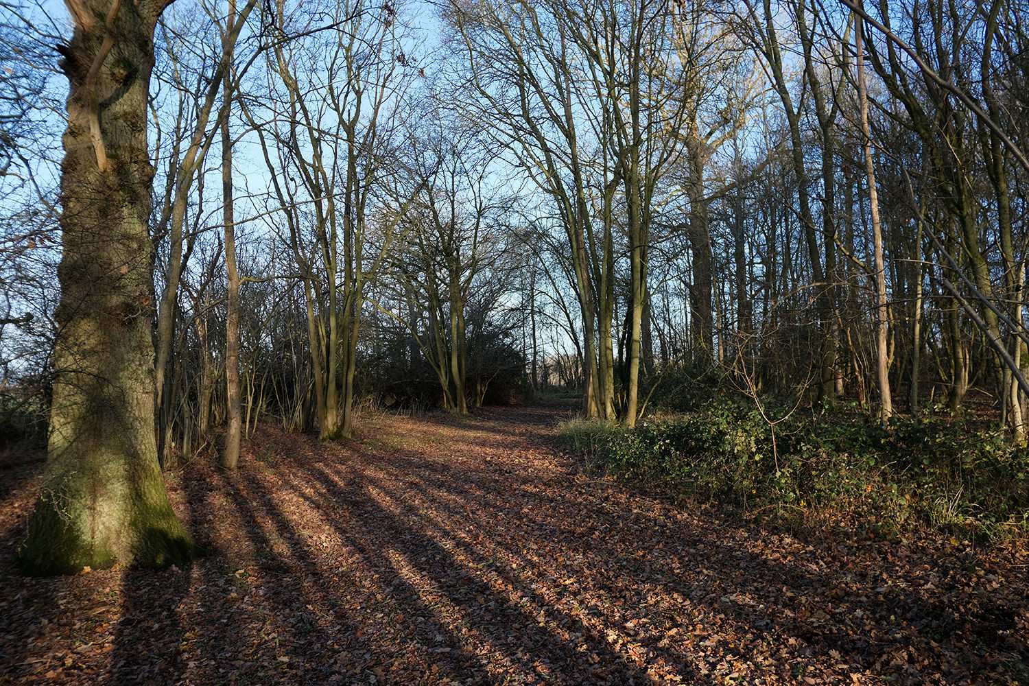 The land is flat and easy to walk throughout. In spring, daffodils and bluebells bring seasonal colour in the northern section. Open fields border the woodland to the west and south, creating pleasant views and allowing light to filter through the trees.