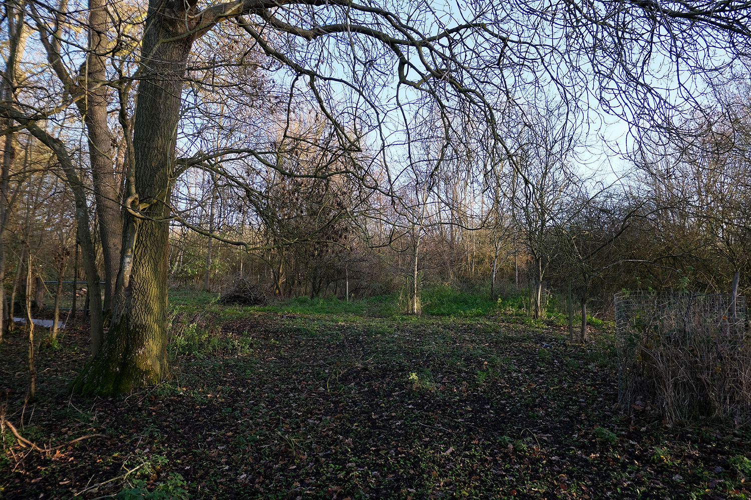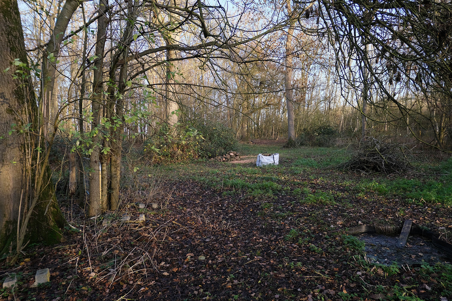 The woodland is thoughtfully varied. Around the central camp area are established fruit trees including Cox apple, pear, Stella cherry and plum, all approximately ten years old. The northern section features a wide ride that loops around the perimeter, allowing excellent access for woodland management. This area is characterised by striking veteran oak alongside younger broadleaf trees, with the occasional elm.