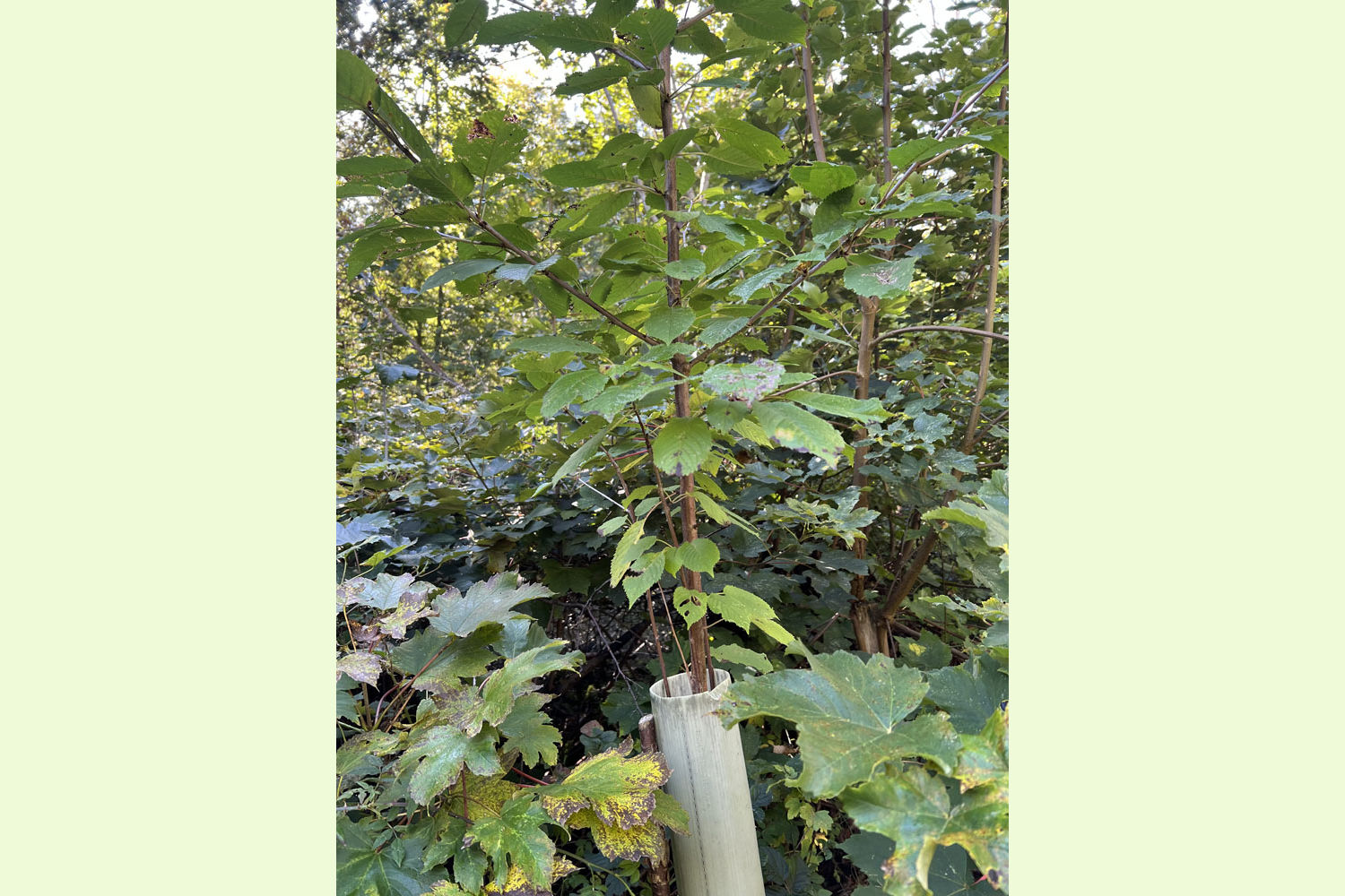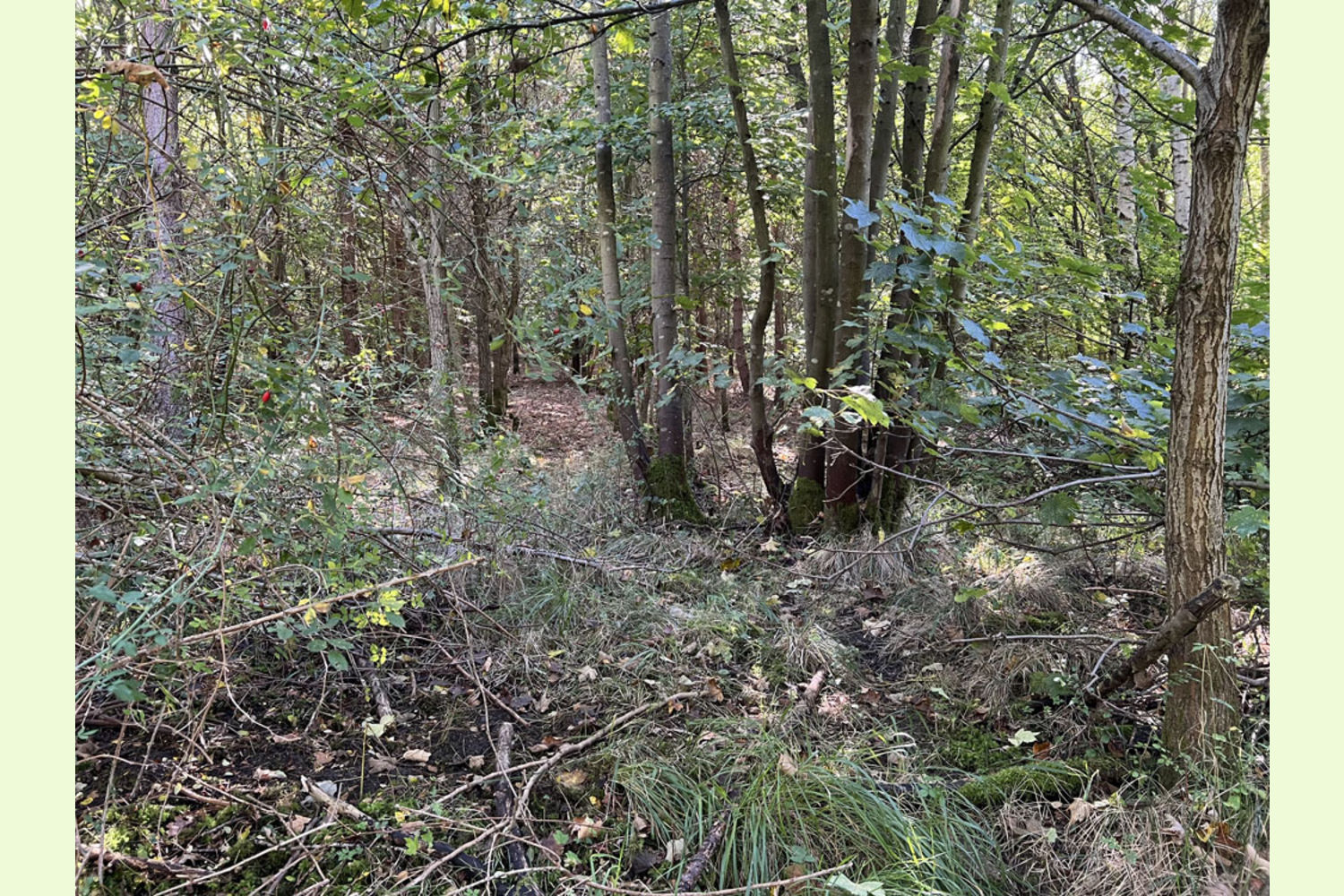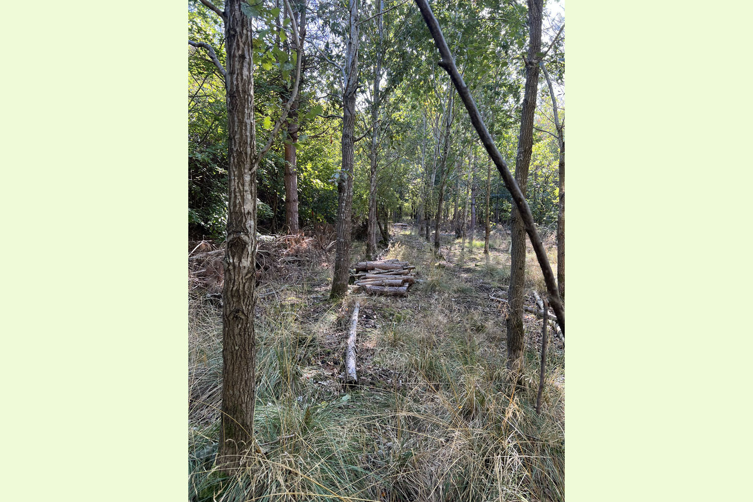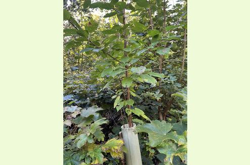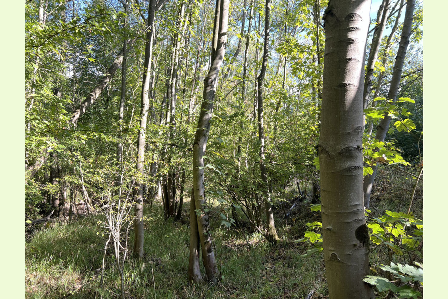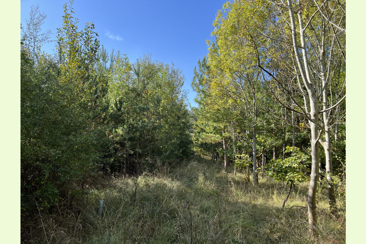 Made up of planted areas of two different ages, there is a diverse mix of trees. The younger area towards the top of the woodland has been growing for around 20 years, planted with beech, hazel, sweet chestnut and some oak. These trees are now very well established and growing well and the canopy is now closing in. The more mature area, of around 25-30 years, has similar species but also alder and pine, along with numerous self-seeded trees including birch, willow and sycamore. Like the more recent planting, these trees are doing very well and are adding substantial timber volume.