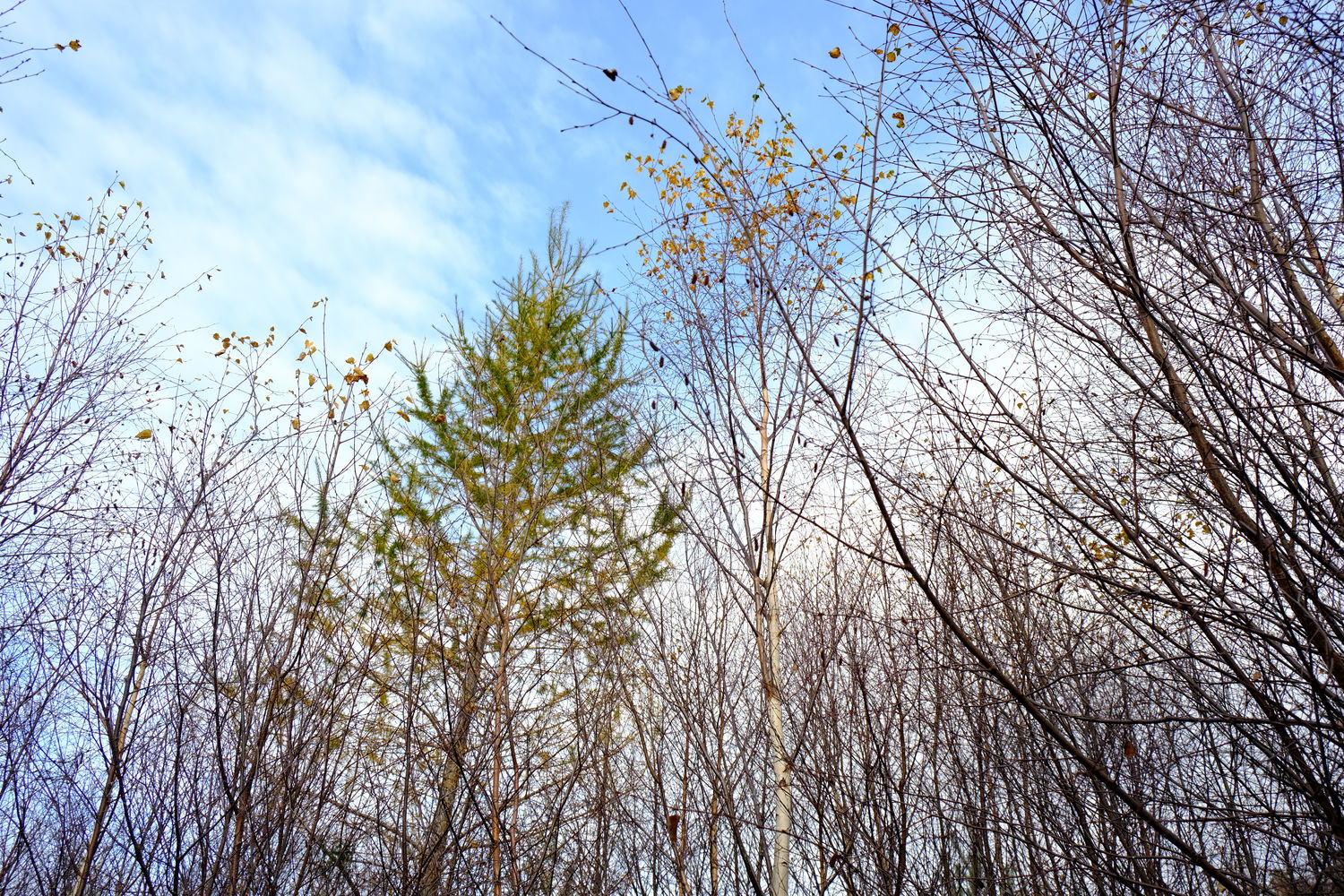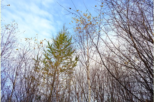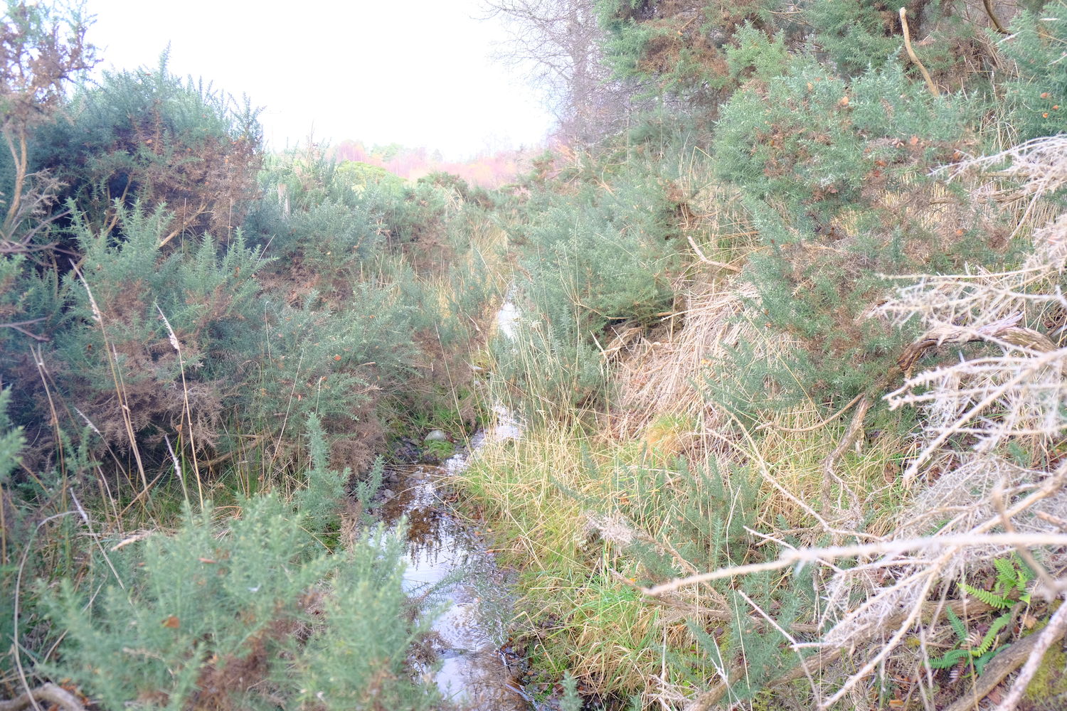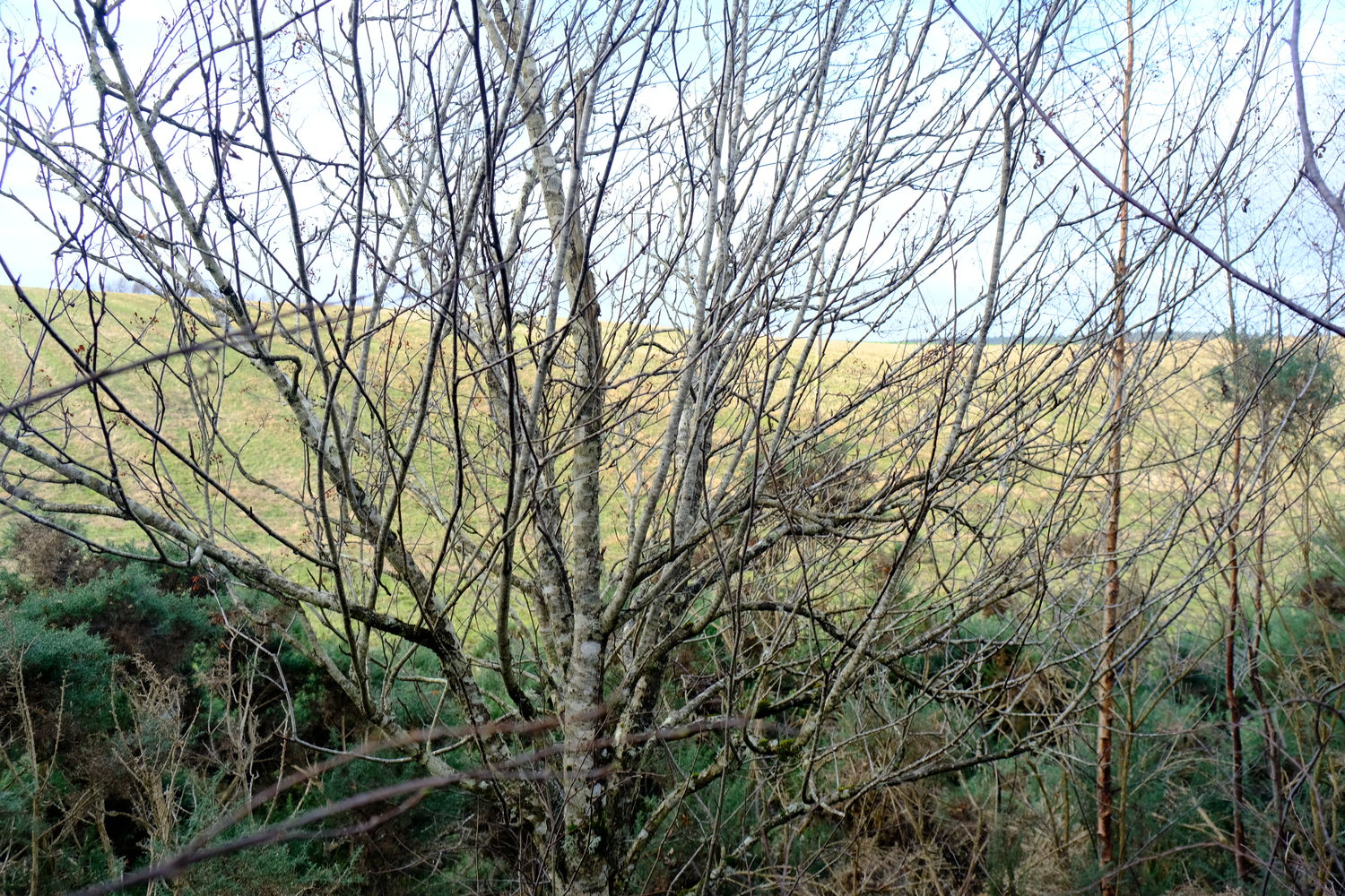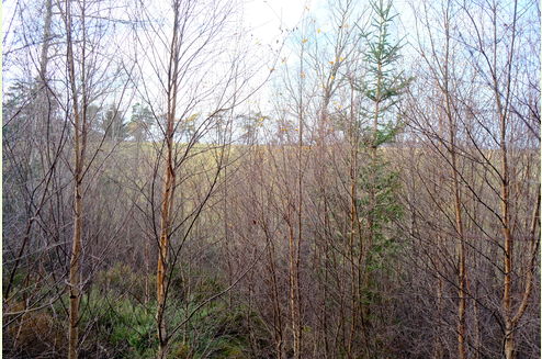 The regeneration of the woodland and wildlife habitats after the previous clear felling is apparent everywhere, with young birch and some rowan, willow, alder, spruce, pine and larch, mixing with gorse, ferns, broom, heather and some large brash piles. There are also some older remnant trees mainly along the west boundary. Previously dormant seed banks including of ancient oak, ash and Scots pine have activated, though it is the birch that is beginning to dominate in some areas.