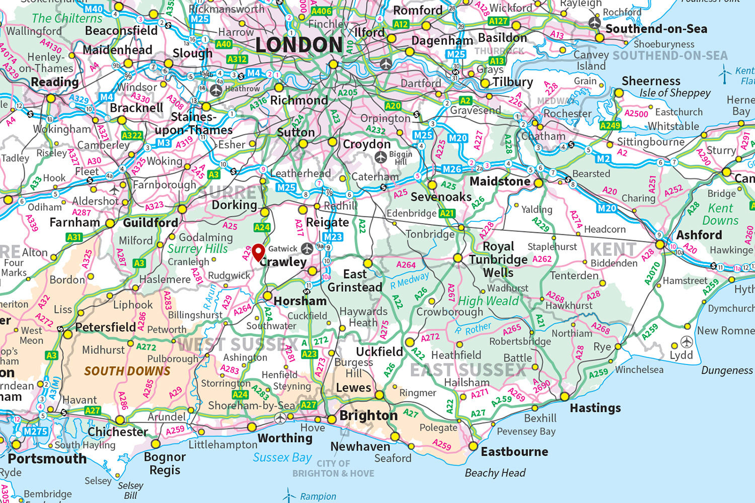 The nearby village of Ockley is easily reached on foot via a public footpath and offers a small shop and a welcoming pub. For more extensive amenities, Dorking lies to the north and Horsham to the south—both just a five-minute drive away. With the A24 nearby, central London is approximately an hour and a half by car.