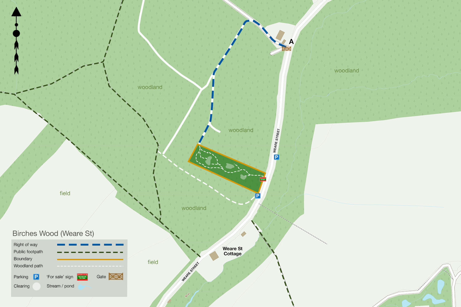 Boundaries: The boundary is open on all sides and marked with orange paint on trees. N, W and S are bordered by neighbouring woodland, E follows Weare Street.
