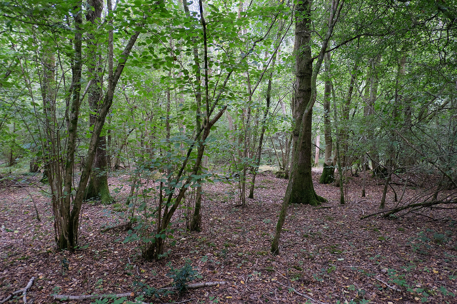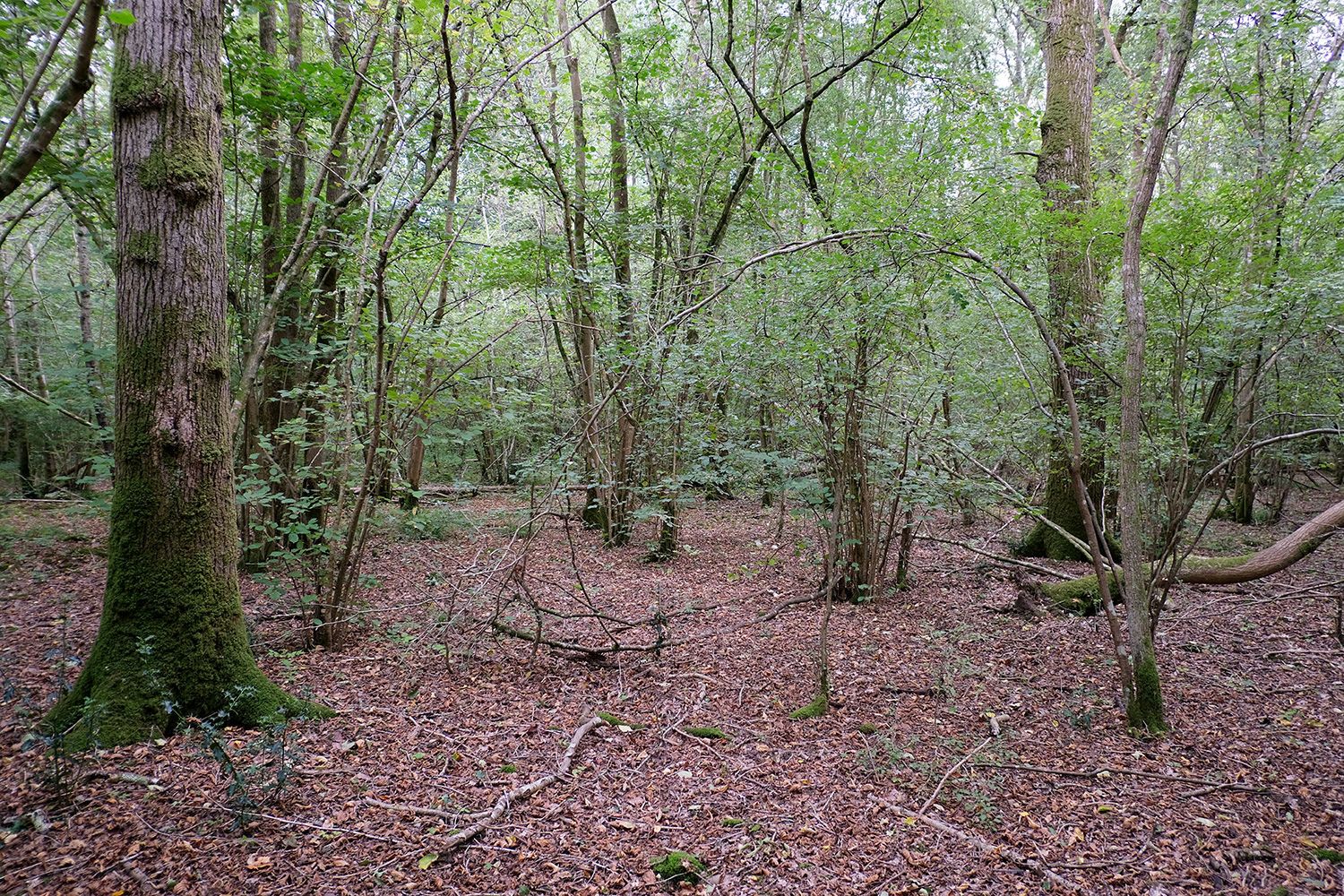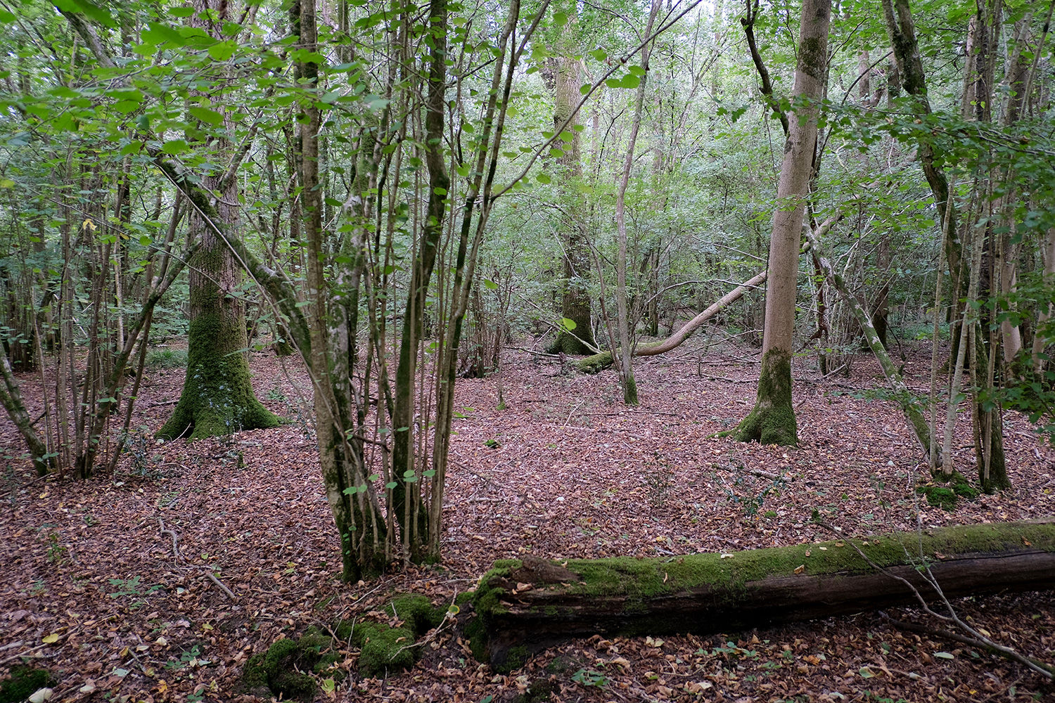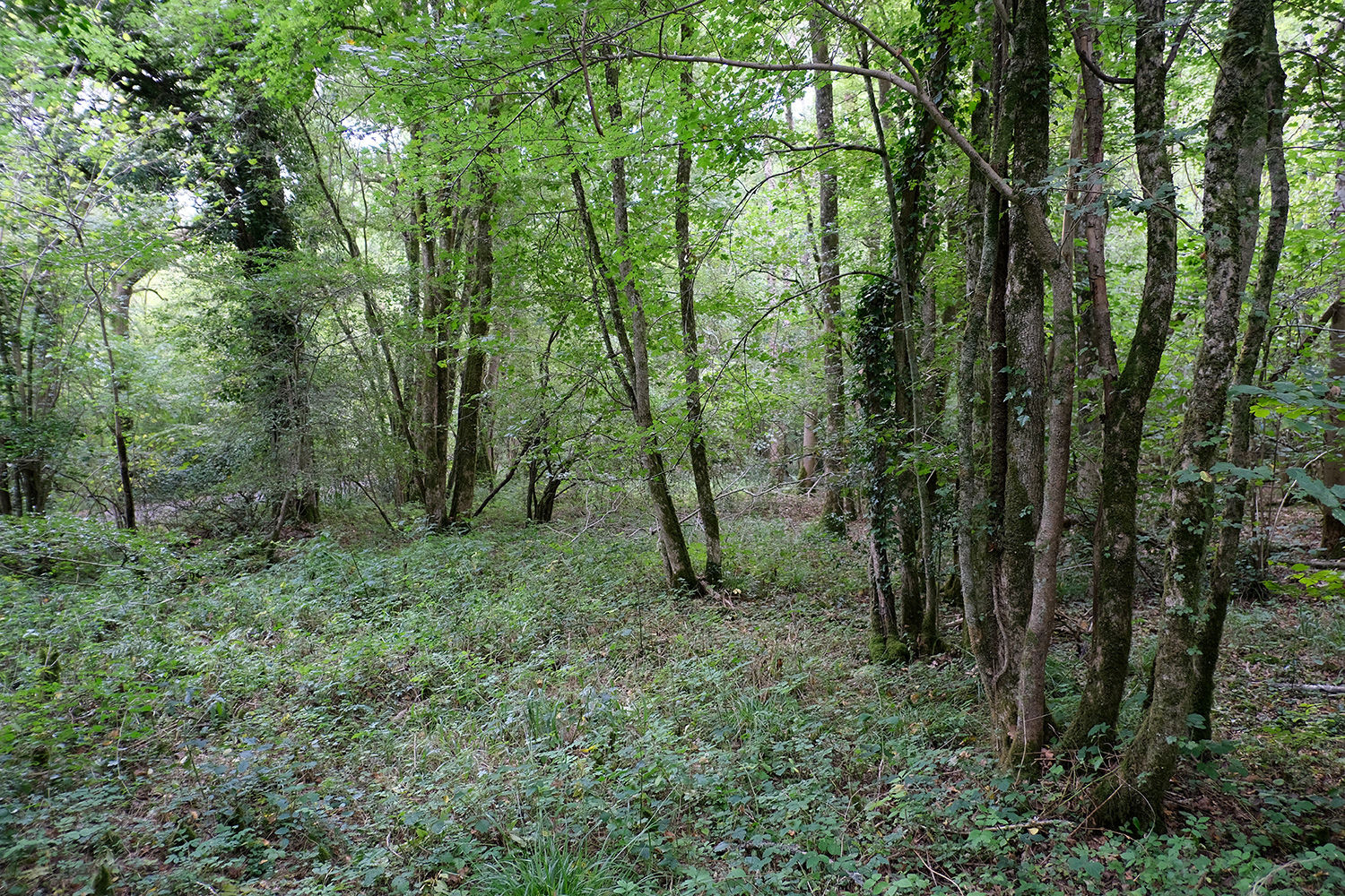The terrain is level and bramble-free, making exploration easy. Numerous clearings can be found dotted throughout the site, perfect for establishing a base for woodland activities. The canopy is made up of oak, chestnut and ash with an understory of birch, hornbeam and hazel, hawthorn, and holly, adding to the variety. In season, the woodland is carpeted with bluebells and primroses.