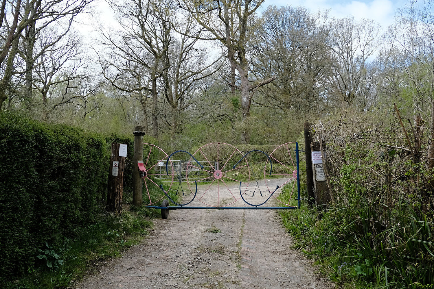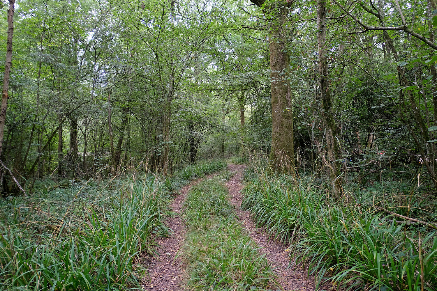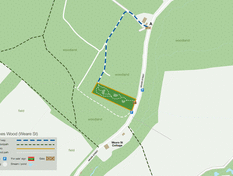 Pass by the gate (A) and follow the track, marked in blue on the map to enter at the northwest corner of the woodland.
