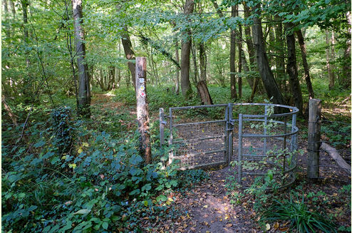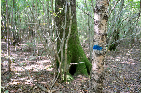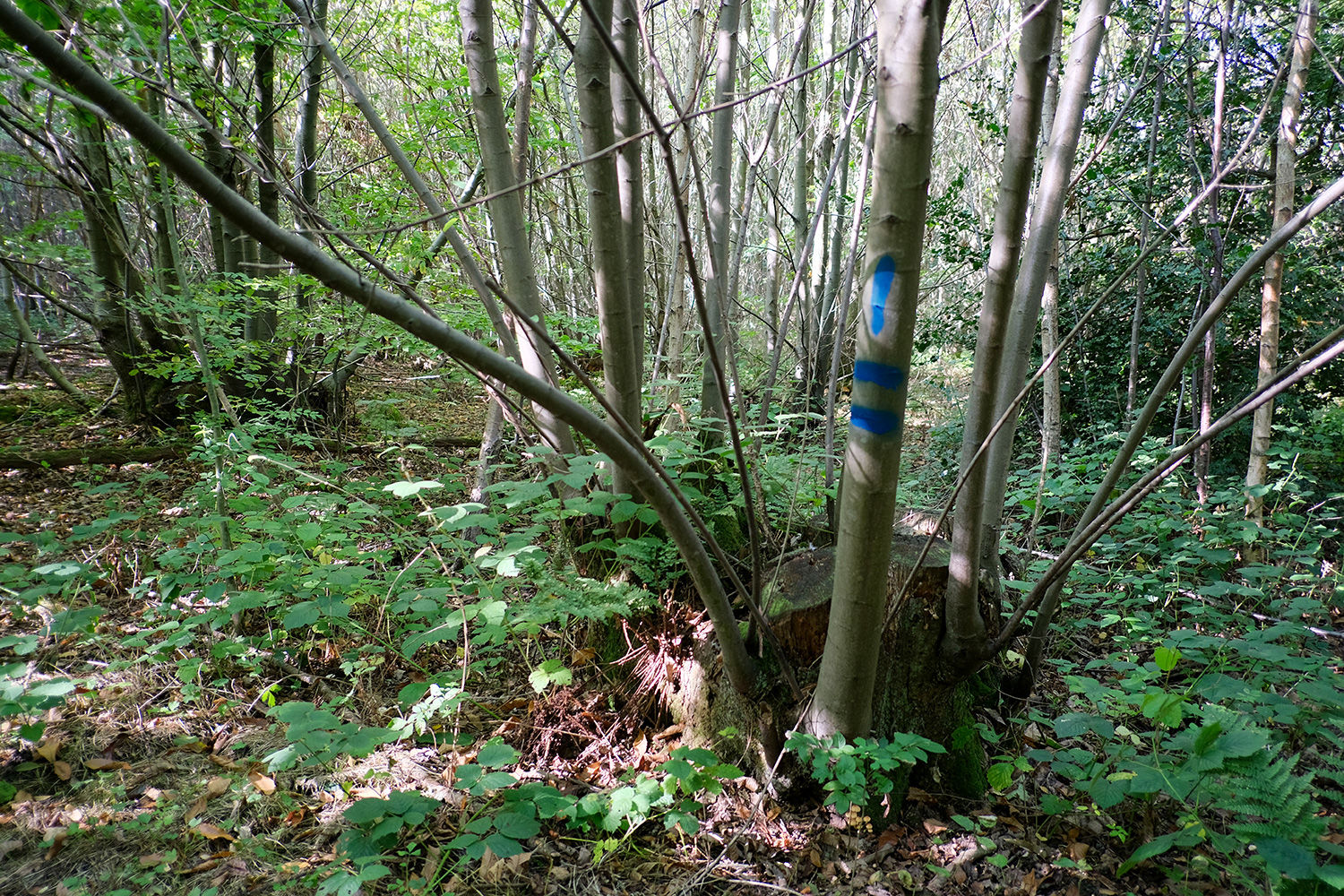 Boundaries: The boundary is open on all sides and marked with blue paint, W and S. To the west and south, the boundary follows the access tracks. The NW corner is marked by a large beech tree in the centre of the track and marked with three lines in blue paint. The SE corner is marked by three blue lines on a large chestnut, as shown in the images. North and east border neighbouring woodland.