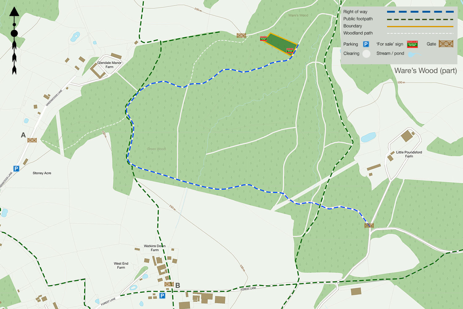 - For viewing purposes, park on the verge on Greenwoods Lane as marked (A) on the map. Please don't block the lane or private driveways. There are other parking areas if needed.