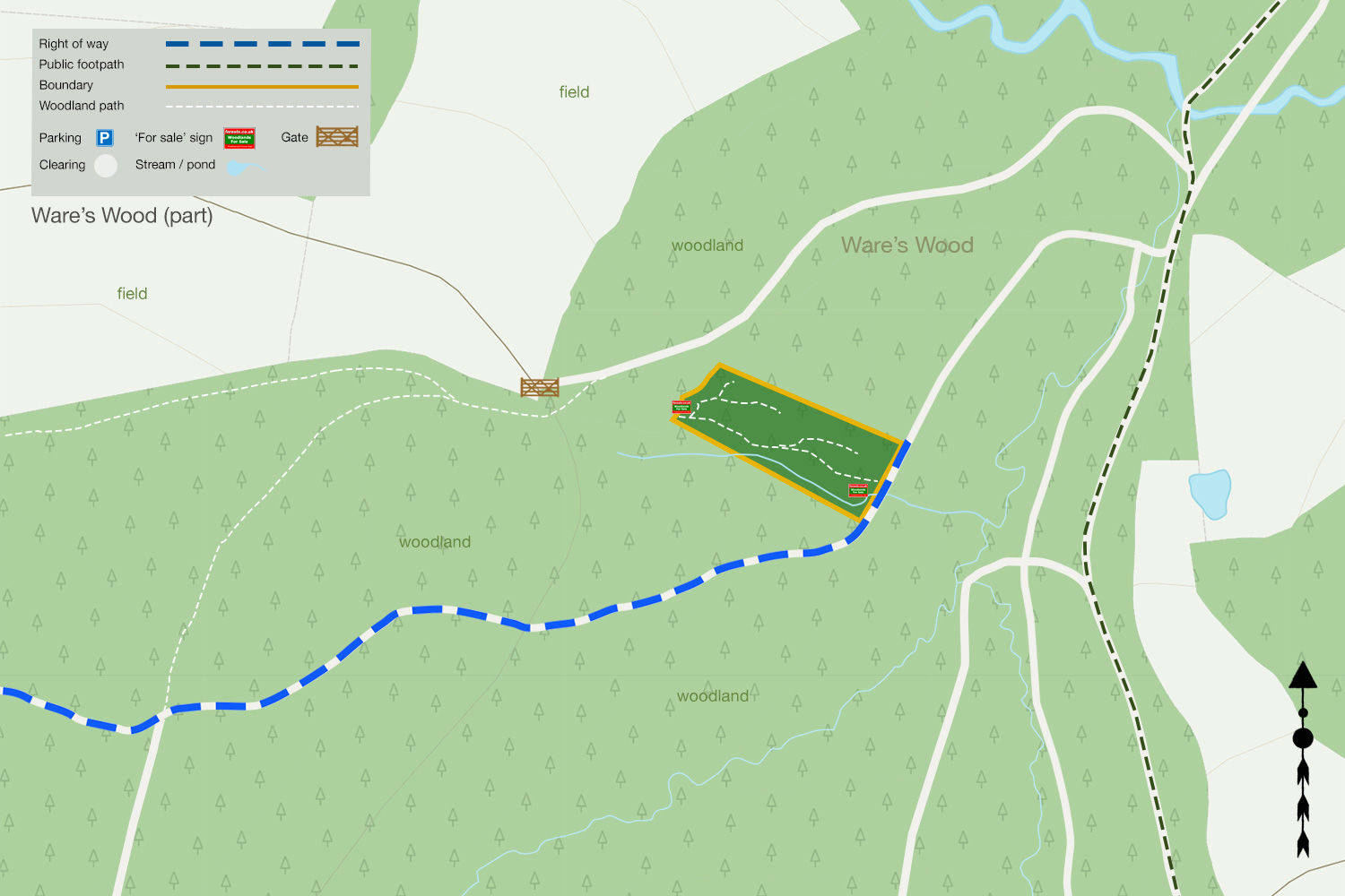 - Follow the path bearing right up into the woods. Continue along the main track along the edge of the field and bear left at the junction. Stick to the path and continue for approximately 500m until you reach the southeastern corner of the woodland, marked with blue paint and our 'For Sale' sign.