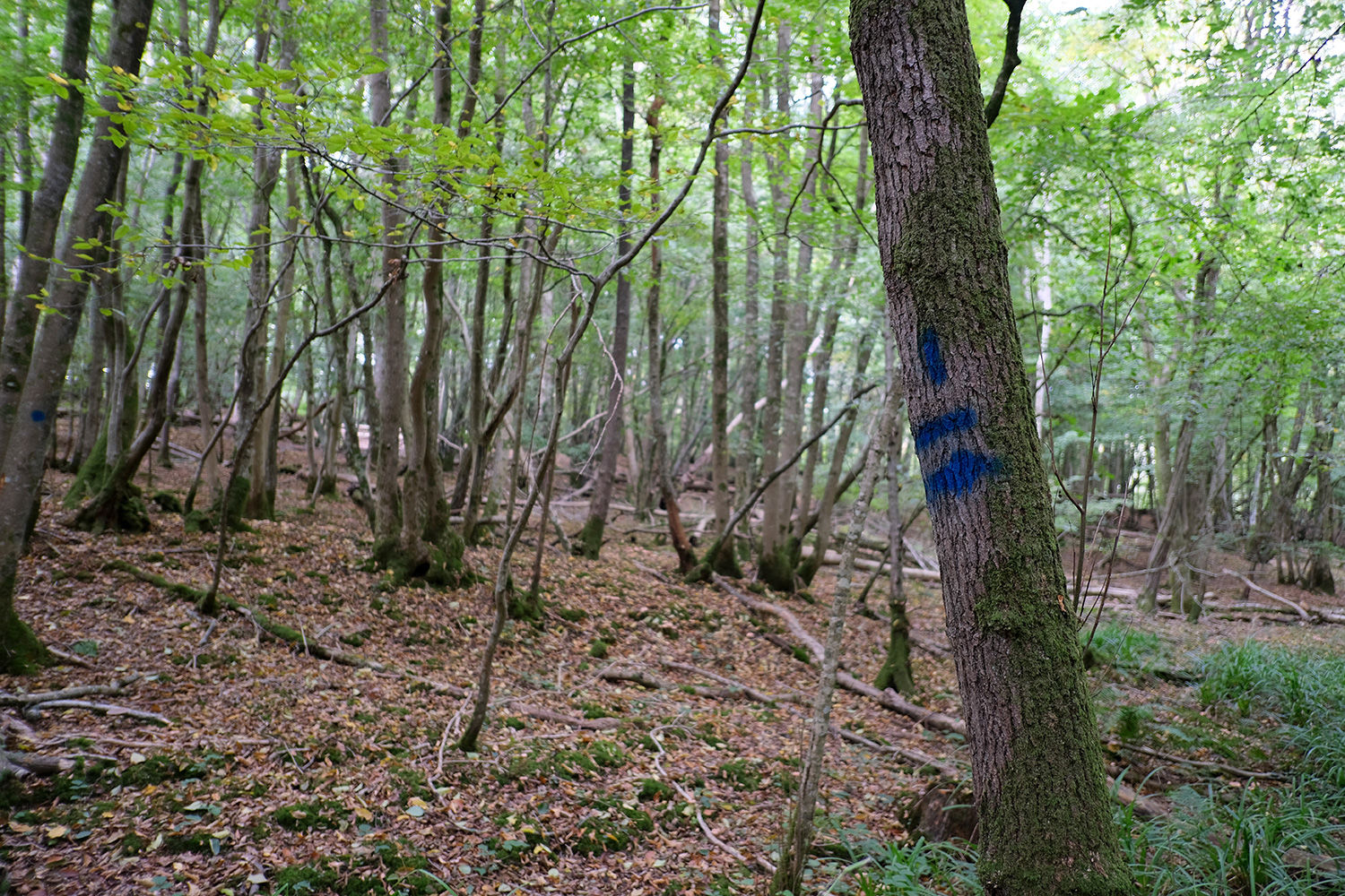 Boundaries: The boundary is open on all sides and marked with blue paint. To the west, the boundary follows a wide footpath and a woodbank, and east follows the main access track. North and south border neighbouring woodland.