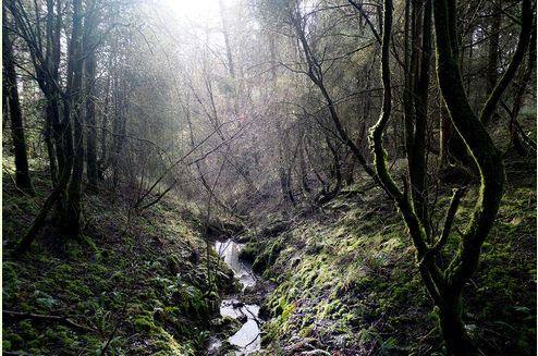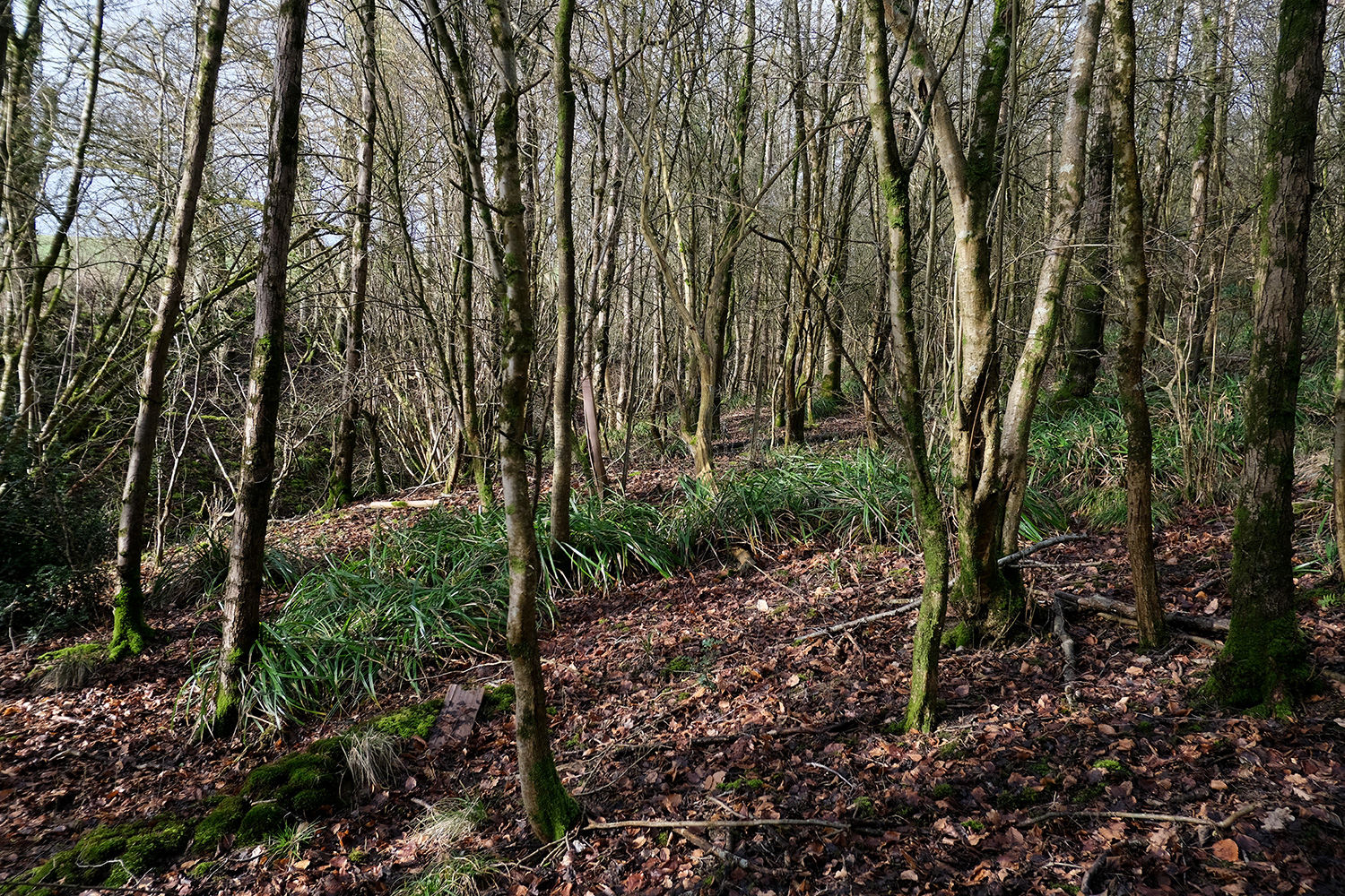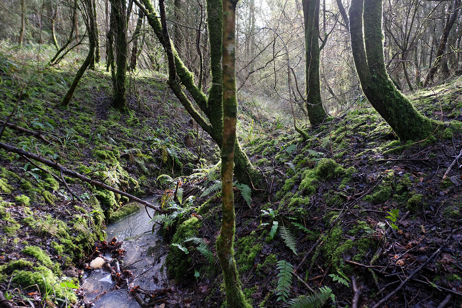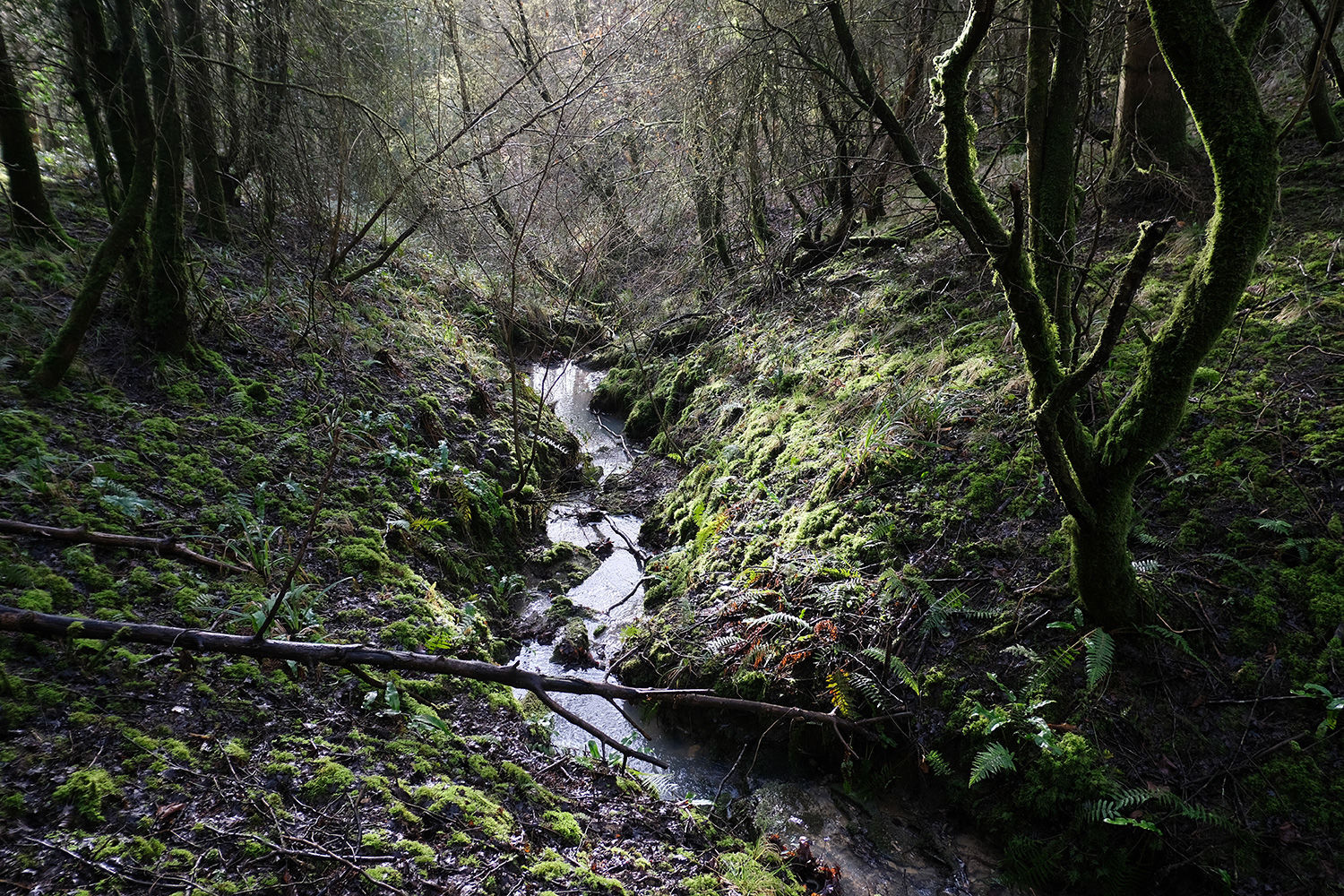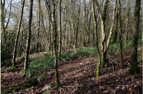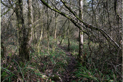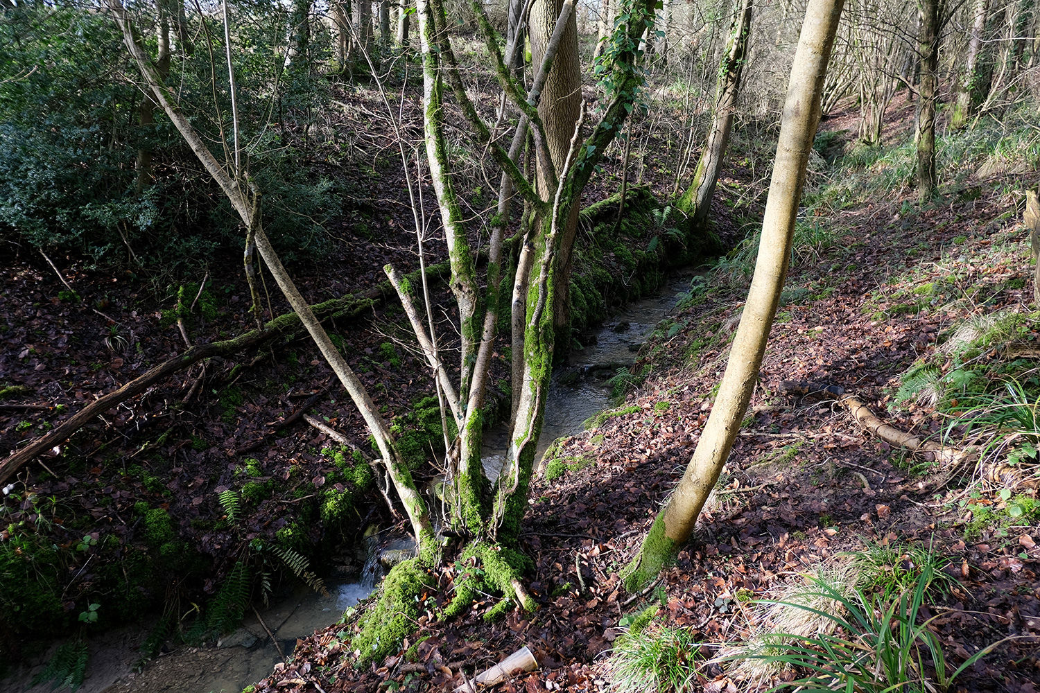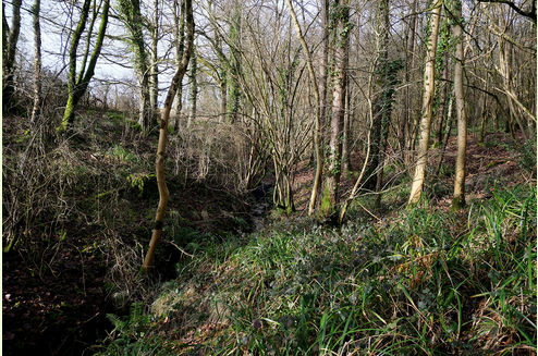 Moving south, oak and beech are more common, hazel, ash, birch and chestnut are also present. While the stream gully is steep in places, there are numerous points where it can be crossed with ease. The southern boundary adjoins open fields, allowing sunlight to flood into this part of the woodland.