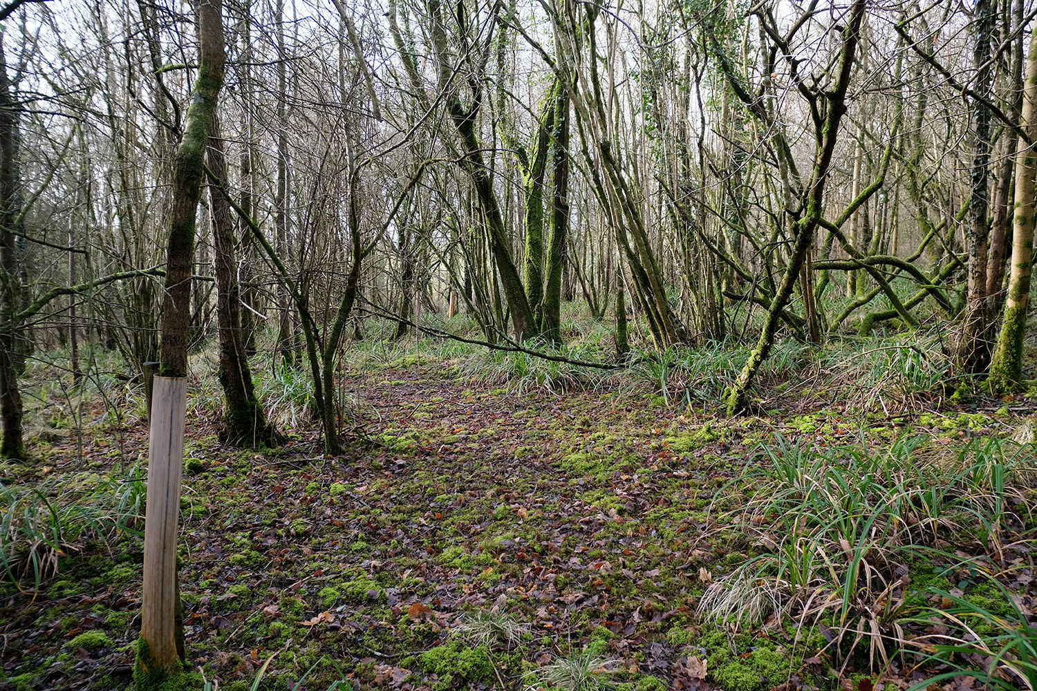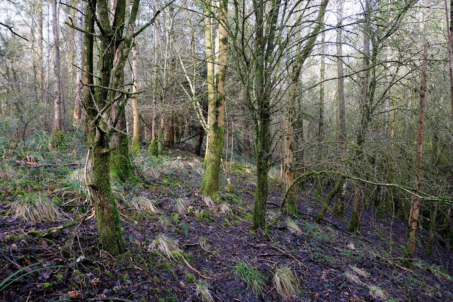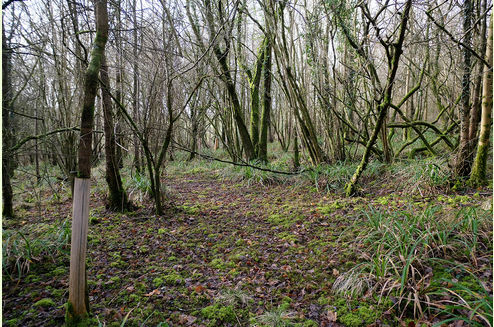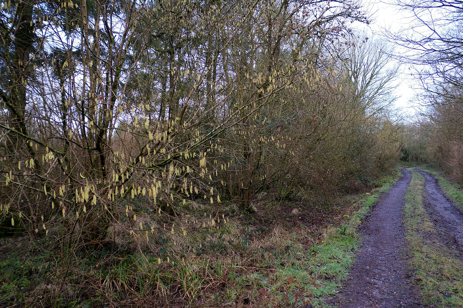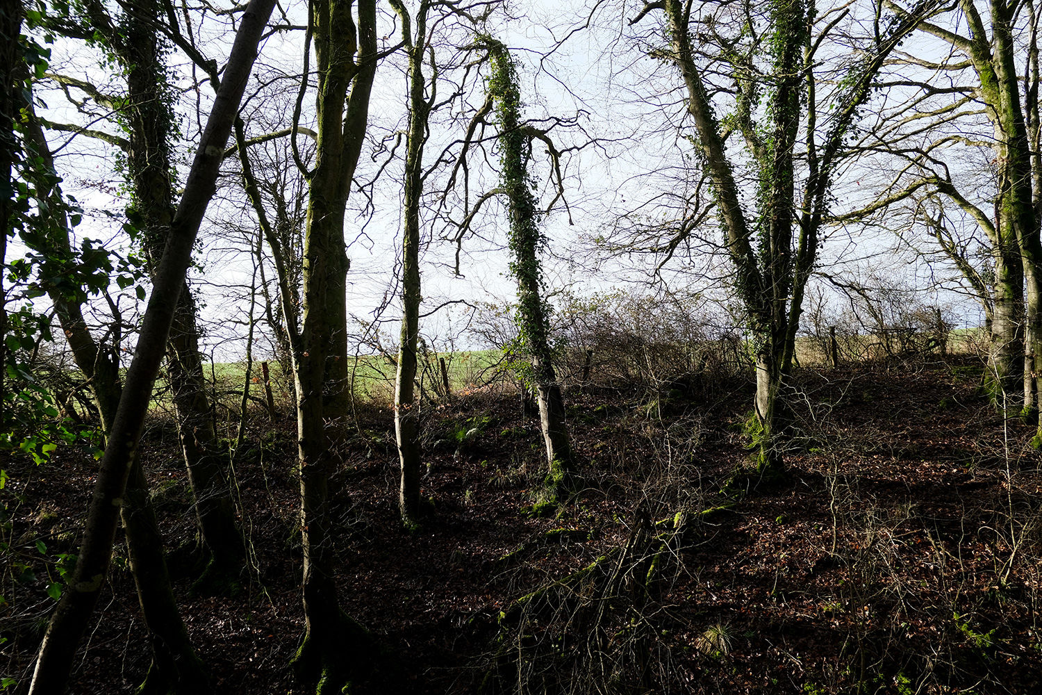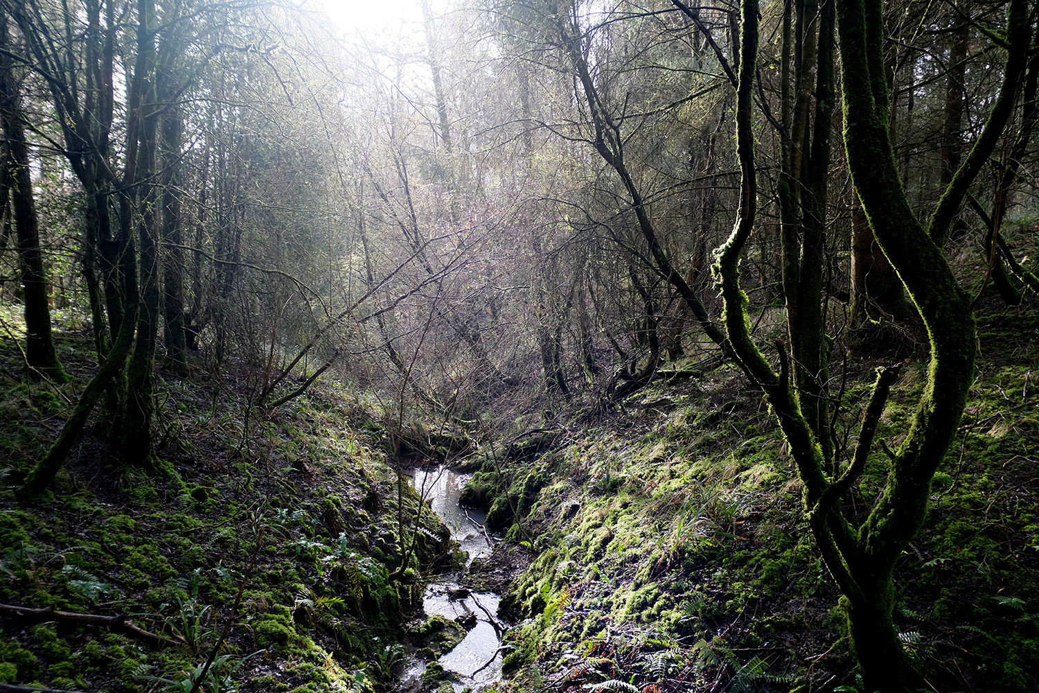 Moving south, oak and beech are more common, hazel, ash, birch and chestnut are also present. While the stream gully is steep in places, there are numerous points where it can be crossed with ease. The southern boundary adjoins open fields, allowing sunlight to flood into this part of the woodland.