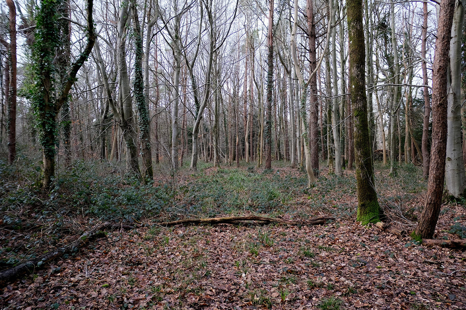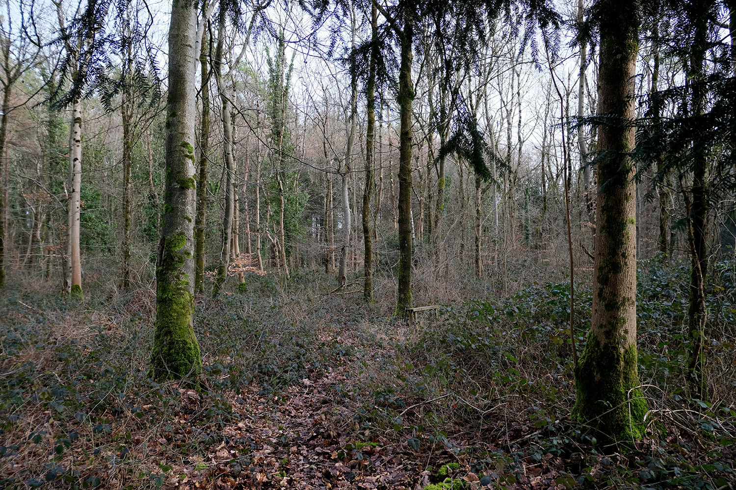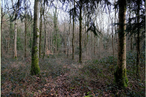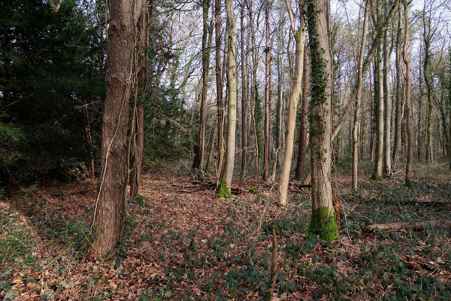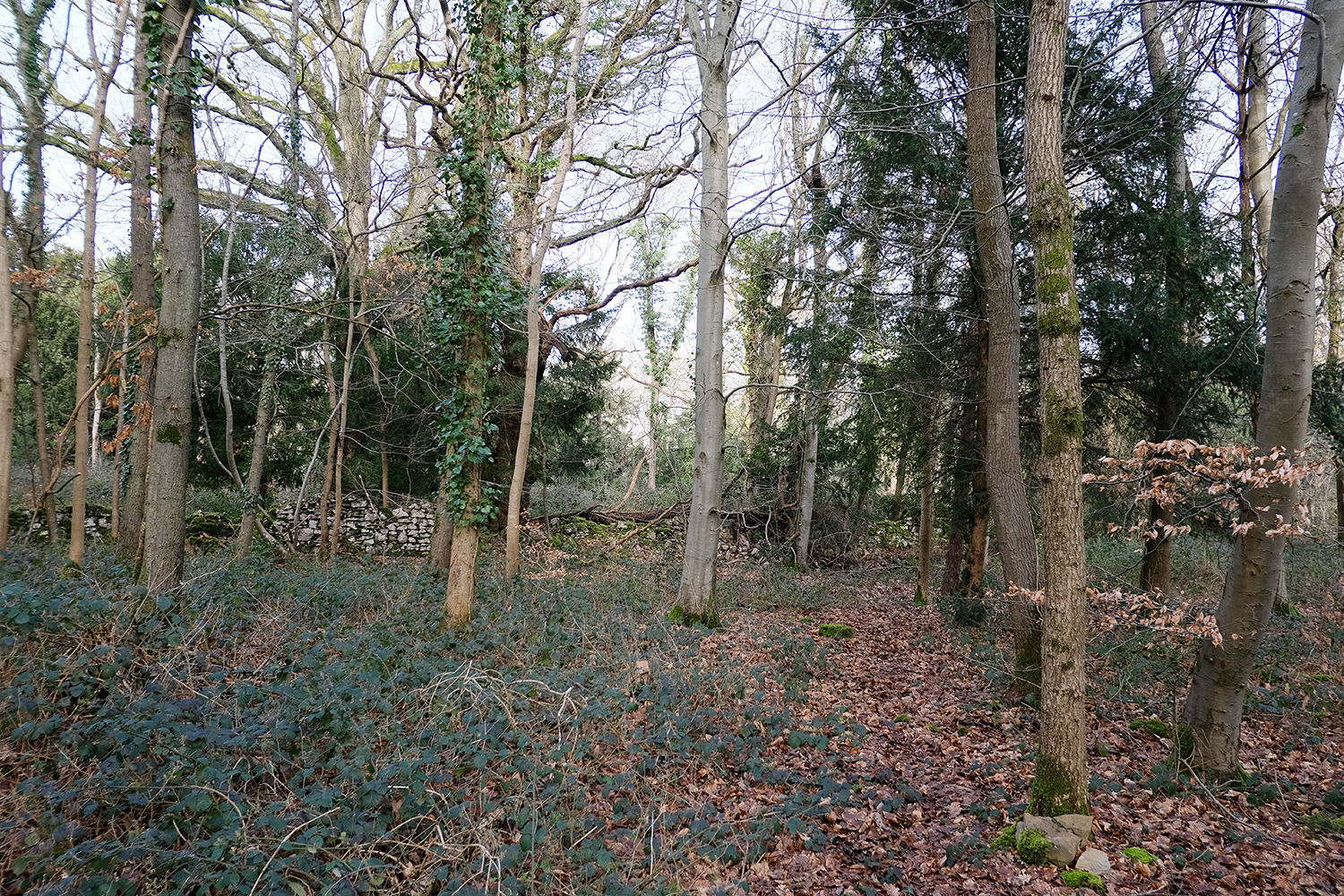 The woodland is attractively mixed, with impressive oak and beech dominating the central areas, with a scattering of ash, hawthorne and holly at lower levels. To the east, an open ride runs north to south framed by tall conifers providing striking contrast while providing additional access for management purposes. The occasional yew can also be found dotted throughout the wood and alongside the old stone wall that marks the northern boundary.