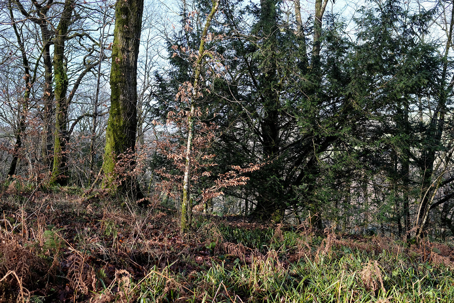 The woodland is dominated by majestic veteran oaks, interspersed with beech, sycamore, birch, hazel, holly, and the occasional yew. In spring, a vibrant carpet of bluebells blankets the forest floor. Deer frequently roam the area, as evidenced by the many tracks weaving through the trees.