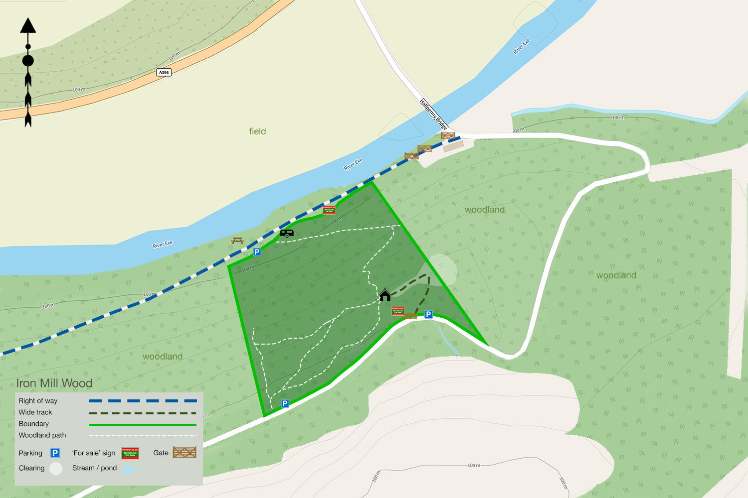 Access: There are two access points at Iron Mill Wood, one at the northern side, via a shared locked gate and a hard track that runs along the river. There is also a large turning and parking area. The second access is situated on the southern side of the wood which is accessed via a private gate along the country lane. There is also a third entrance to the southwest, which can be accessed by 4x4 or on foot.