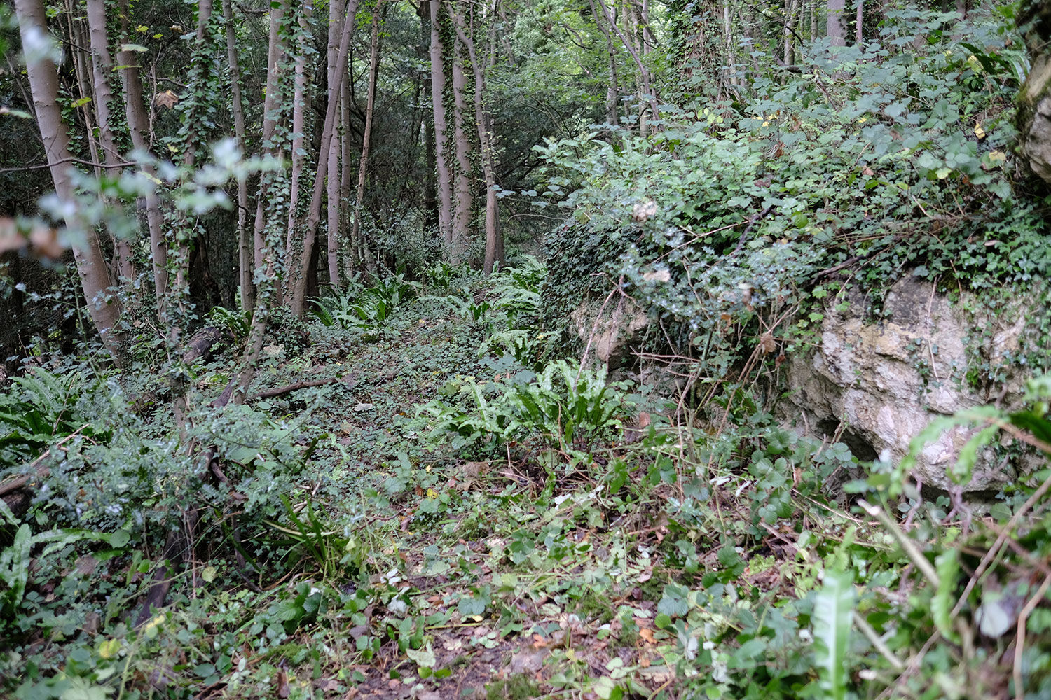 The variable terrain is likely to have led to the diverse ground flora (at least 102 species have been recorded) which includes the luxuriant hart's tongue fern, dog's mercury, stinking iris, bluebells and ransoms. Even the elusive Bath asparagus has been spotted. The woodland hosts a wealth of wildlife and Roe deer are often seen and the dormouse is believed to inhabit the area along with many species of bat including the rare Bechsteins bat. Seventeen different species of bird have been recorded including buzzard, chiffchaff, treecreeper and goldcrest.