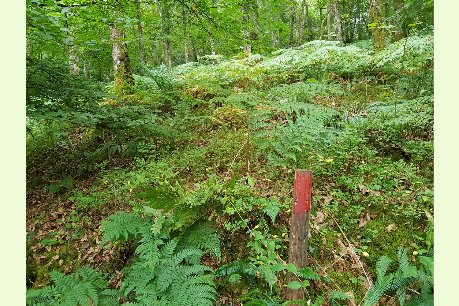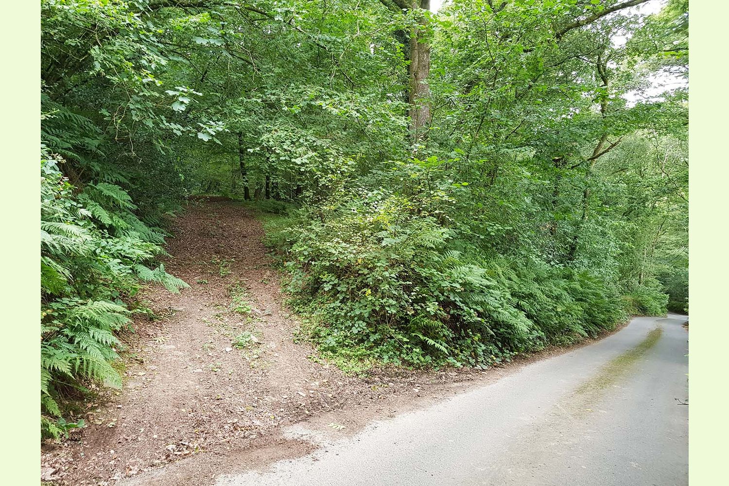 Walk up the road until the next track entrance, the boundary of the wood along the lane is between these two tracks. Walk into the wood, there are red marked stakes to help identify the boundary.