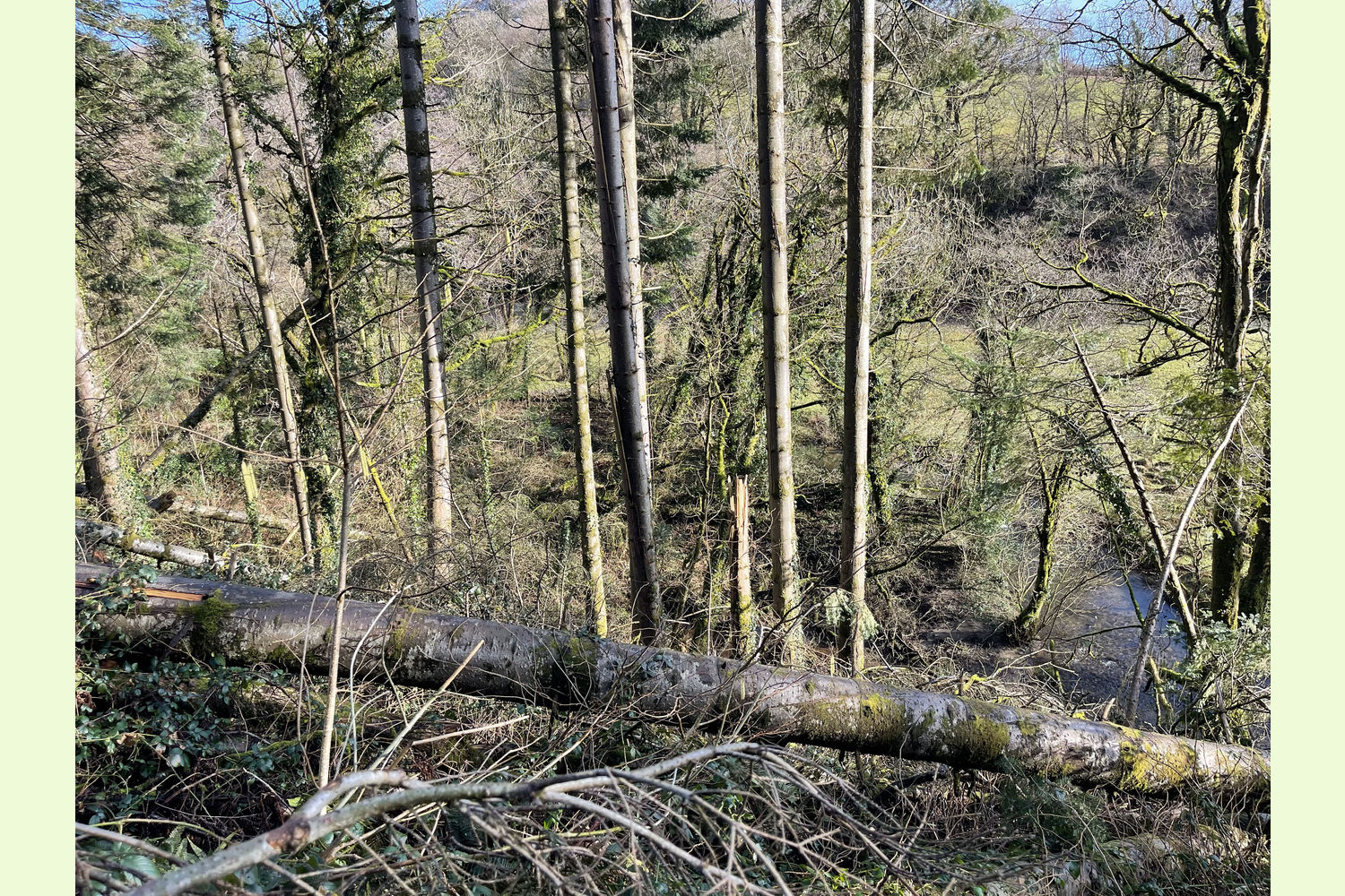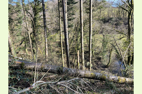 Allt Dol-felfed is a mixed woodland, partly ancient woodland, with oak, beech, ash, sycamore and other mixed broadleaves, and with about half planted with Norway Spruce and other conifers. Access to this wood is slow going in places, and harvesting the conifer crop, if desired, would best be described as “challenging”!