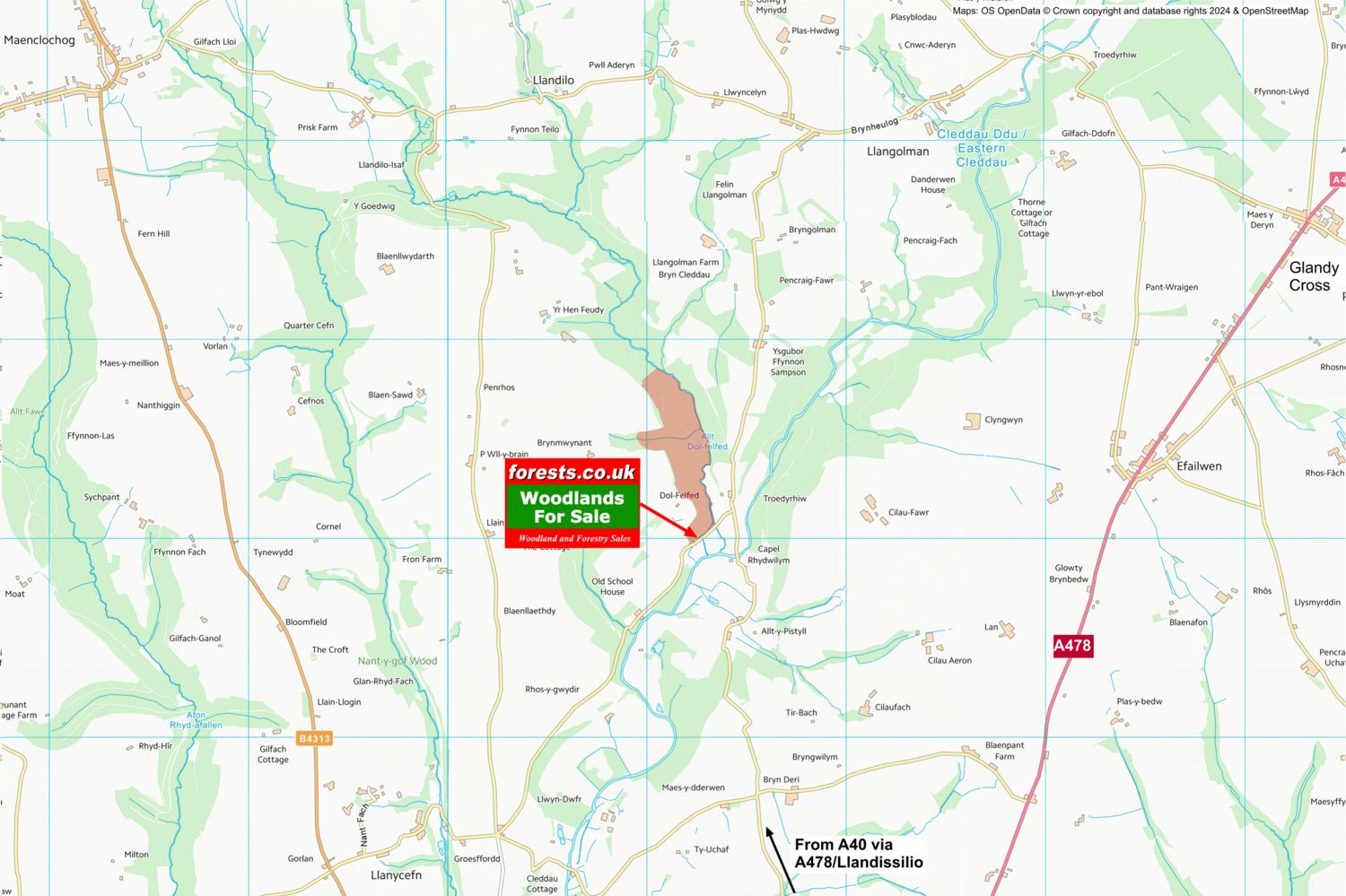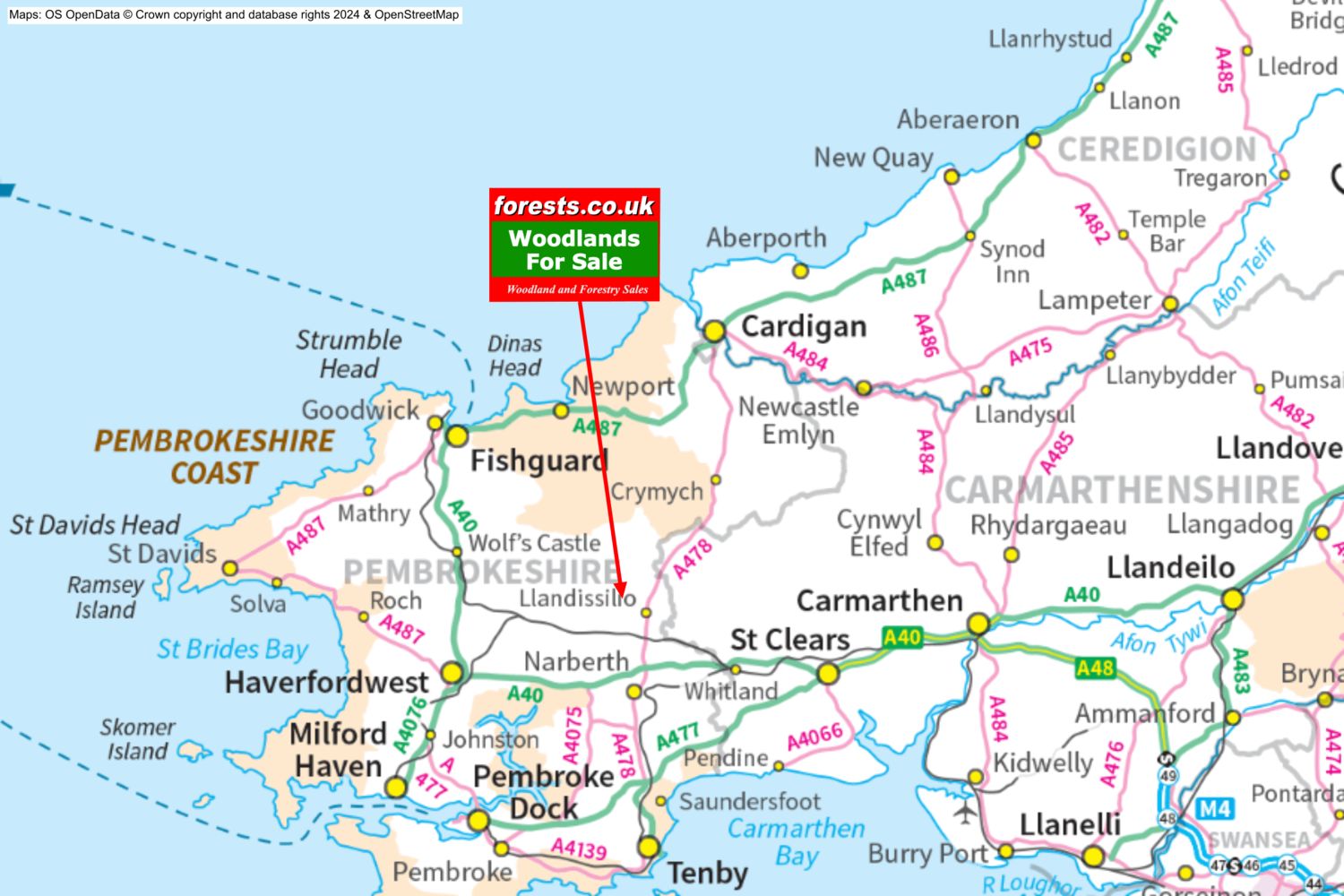 Local area: the wood is just 6 miles north of the A40, Narberth is just over 7 miles to the south and Haverfordwest is 14 miles to the south-west. Tenby is 19 miles away.