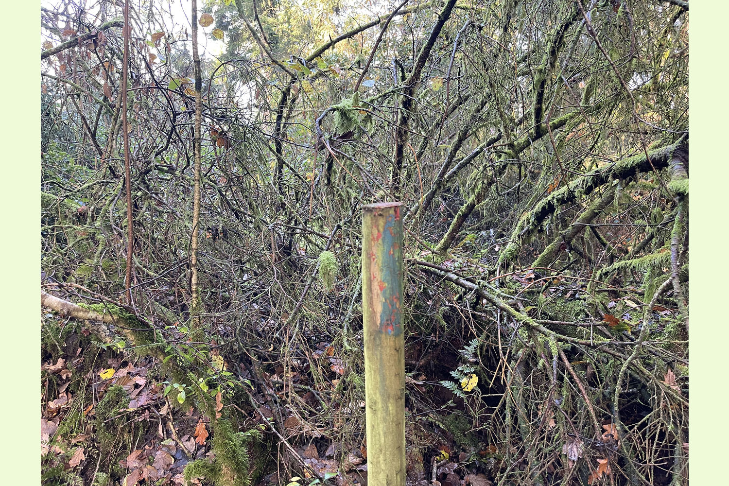 Boundaries: The western and northern boundary are fenced from adjoining farmland. The southern boundary is marked with (fresh) mauve paint on wooden marker stakes and trees (see photo 16). The southern half of the eastern boundary is the stream; the northern half of the eastern boundary is an earthbank, with marker posts painted mauve on the Coed Ffordd Pererin side and blue on the opposite side (very faded – see photo 17)