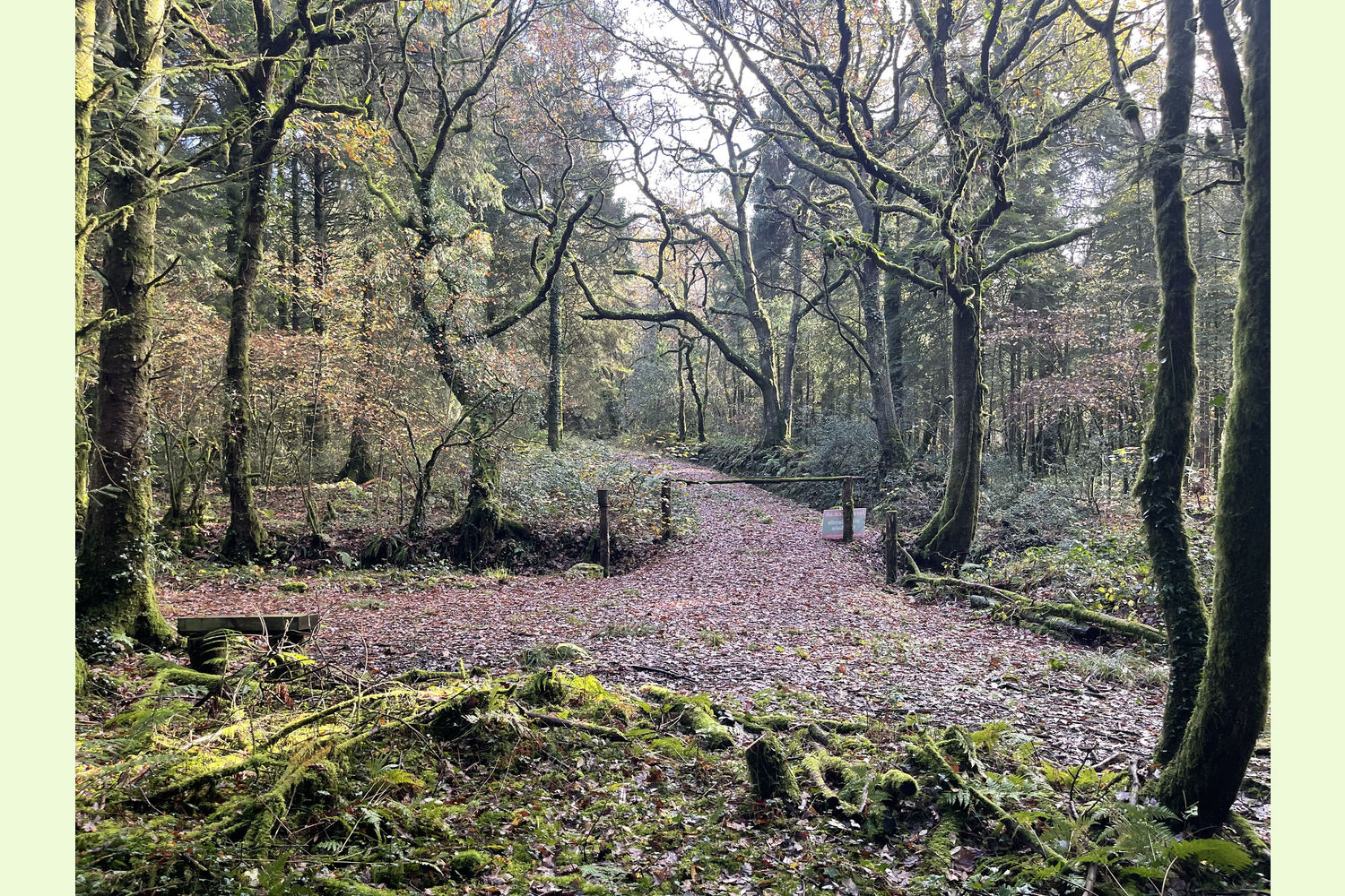 Access: A good stone track, steep in part, gives access to Coed Ffordd Pererin from the locked gated entrance off a minor public road.