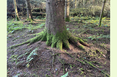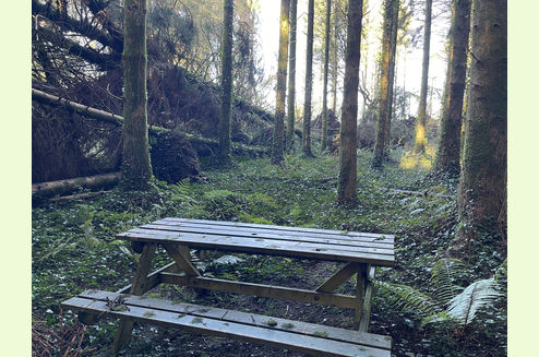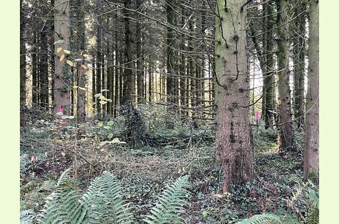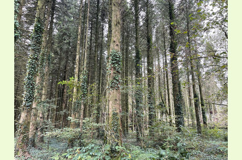 Trees: Coed Ffordd Pererin is predominantly spruce. Planting records, unfortunately incomplete, suggest that it was planted with mainly Norway Spruce in 1962, but there are no records of subsequent planting. The planting is dense and would benefit from thinning, but the benefit of this planting is the shelter and privacy it provides, which could be made use of to shelter areas of new planting in diversifying the woodland. There are a lot of windblown trees in the wood at the moment, but these would provide an easily accessible source of timber or firewood.