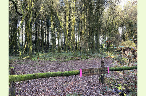 Take this left (westerly) fork and follow this track until you come to the entrance to Coed Ffordd Pererin at the end of the track, marked by a ride stop with a wooden name board and a Forests.co.uk Woodlands for Sale sign.