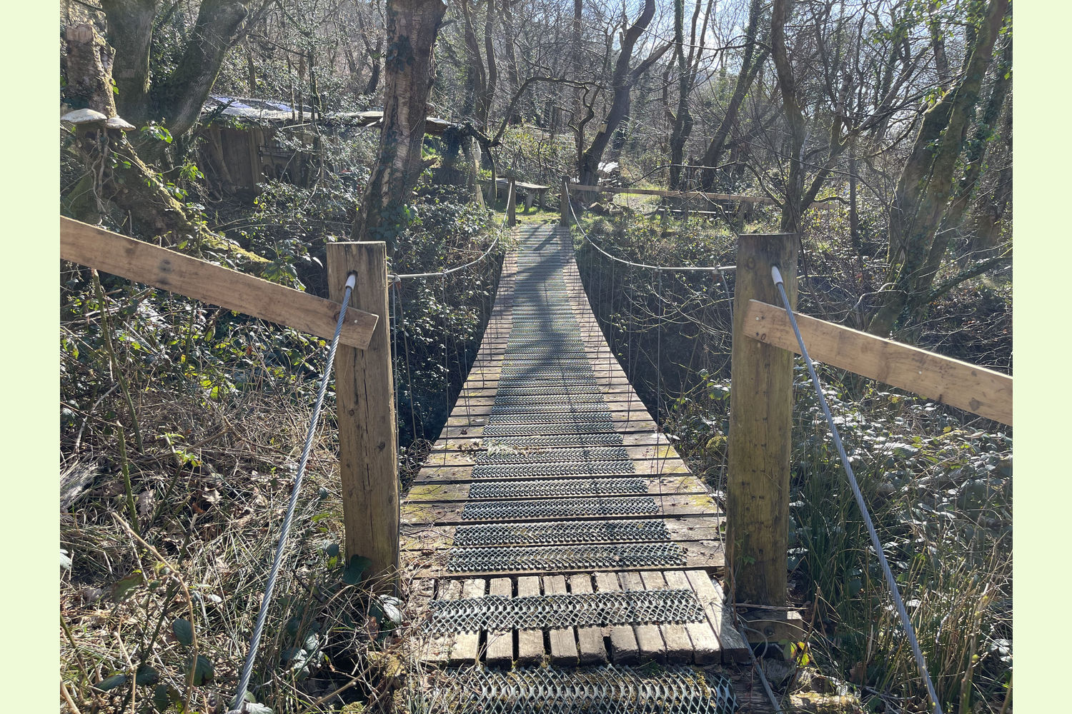 The eastern end of the wood is the other side of a deep ravine carrying a small stream and is accessed via a suspension bridge; the end of the suspension joining a loop path which encircles this side of the woodland.