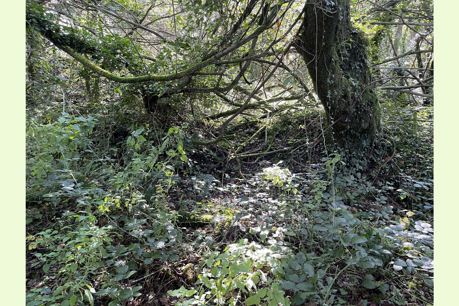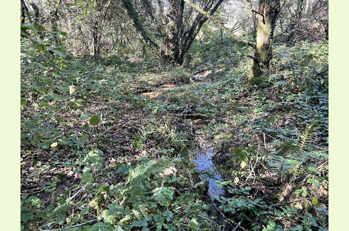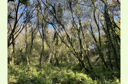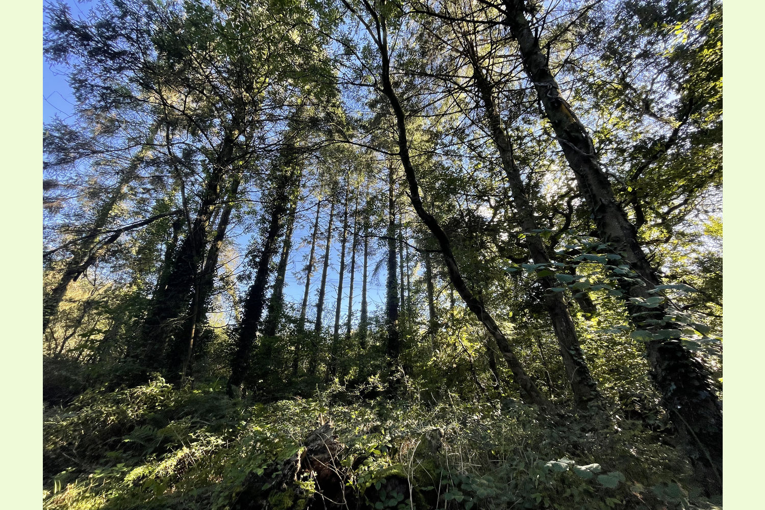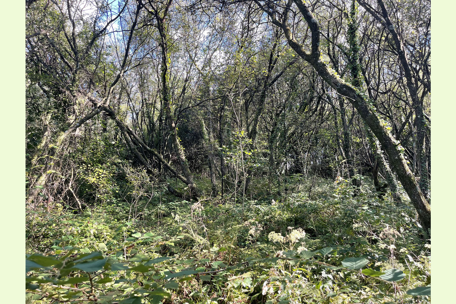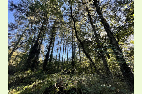 Coed Wern Uchaf is a mixed broadleaf woodland with a wide variety of tree species. It is a wood of two halves: just over half is reasonably mature trees; the canopy is sufficiently complete that there is very little undergrowth, and it is easy to walk around. Just under half is underneath the power lines, and here there is much younger broadleaf tree natural regen. This is much more dense, but a new owner would be free to cut paths or clearings in this area if they wish. A stream that runs through a deep, steep-sided ravine marks most of the northern boundary that separates it from Coed Wern Isaf. Just to the right of the main entrance gate there is a small area of coniferous woodland.