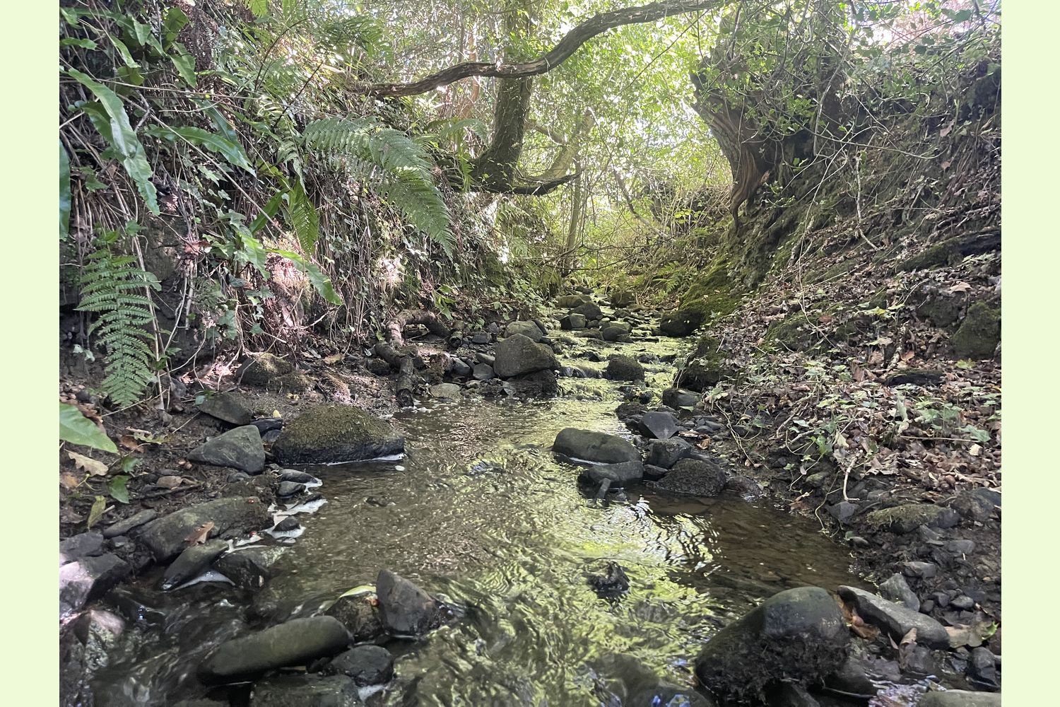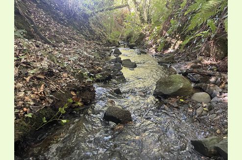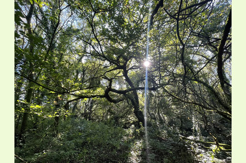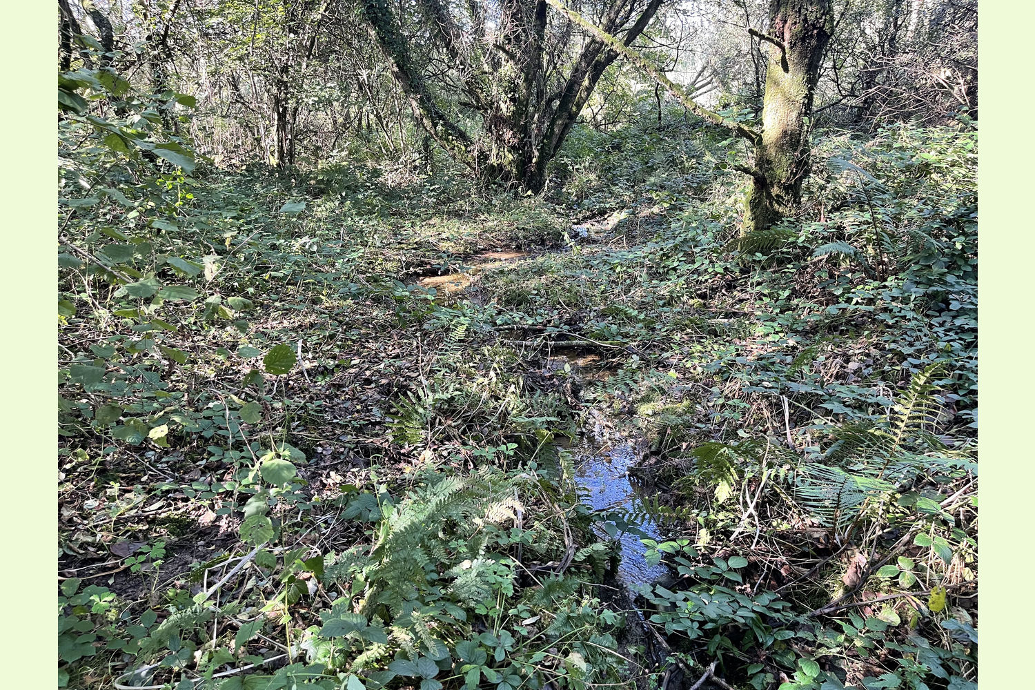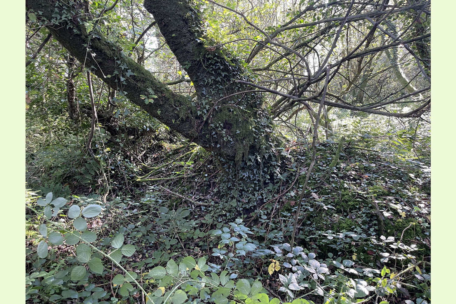 Coed Wern Uchaf is a mixed broadleaf woodland with a wide variety of tree species. It is a wood of two halves: just over half is reasonably mature trees; the canopy is sufficiently complete that there is very little undergrowth, and it is easy to walk around. Just under half is underneath the power lines, and here there is much younger broadleaf tree natural regen. This is much more dense, but a new owner would be free to cut paths or clearings in this area if they wish. A stream that runs through a deep, steep-sided ravine marks most of the northern boundary that separates it from Coed Wern Isaf. Just to the right of the main entrance gate there is a small area of coniferous woodland.