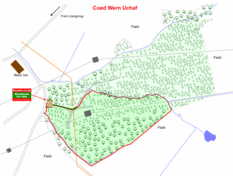 Boundaries: The western and south-eastern boundaries are fenced from adjoining farmland. The first 75 metres of the northern boundary runs down the middle of the main access track, and then for a further 60 metres follows the south-eastern edge of the track. The remainder of the northern boundary is a stream that runs through a steep-sided ravine. Please note: the boundary between Coed Wern Uchaf and Coed Wern Isaf is not fenced, or marked on the ground in any way apart from the stream.