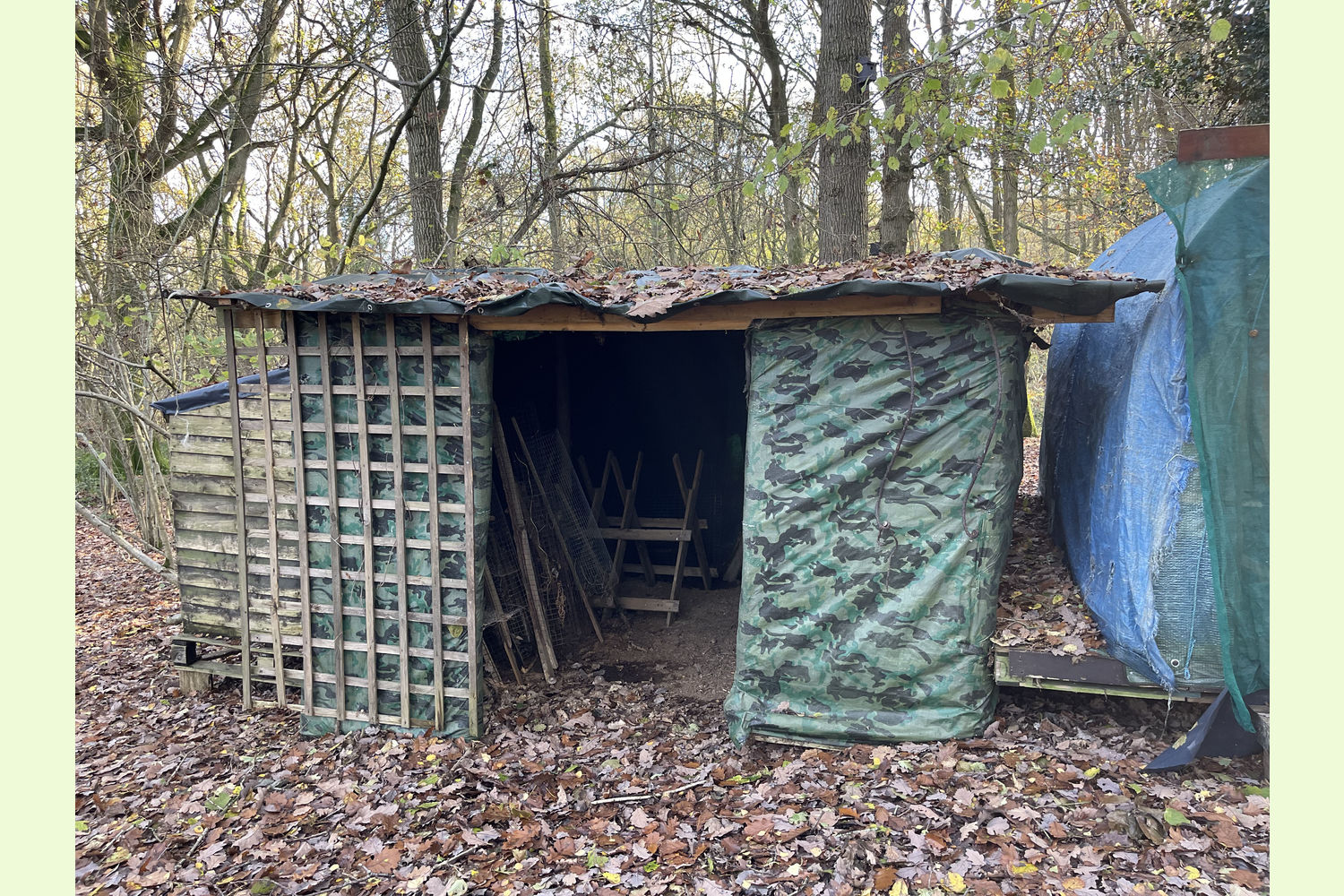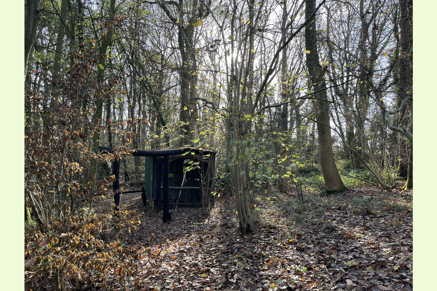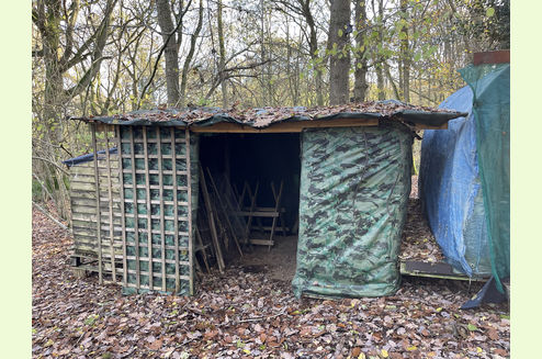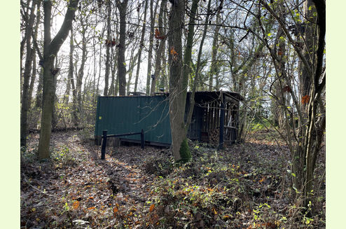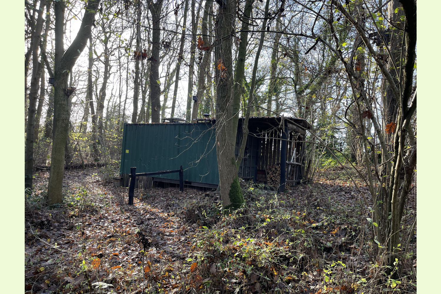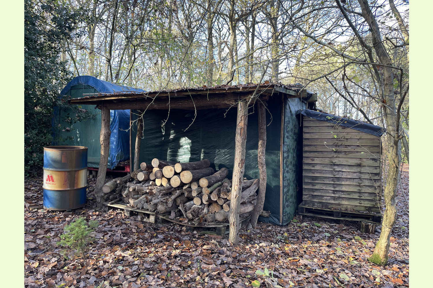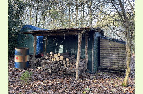Shelter: there is a shipping container next to the main track, for storage, which is also equipped with a wood burning stove. A little further into the wood there is an open fronted wood store and shelter.