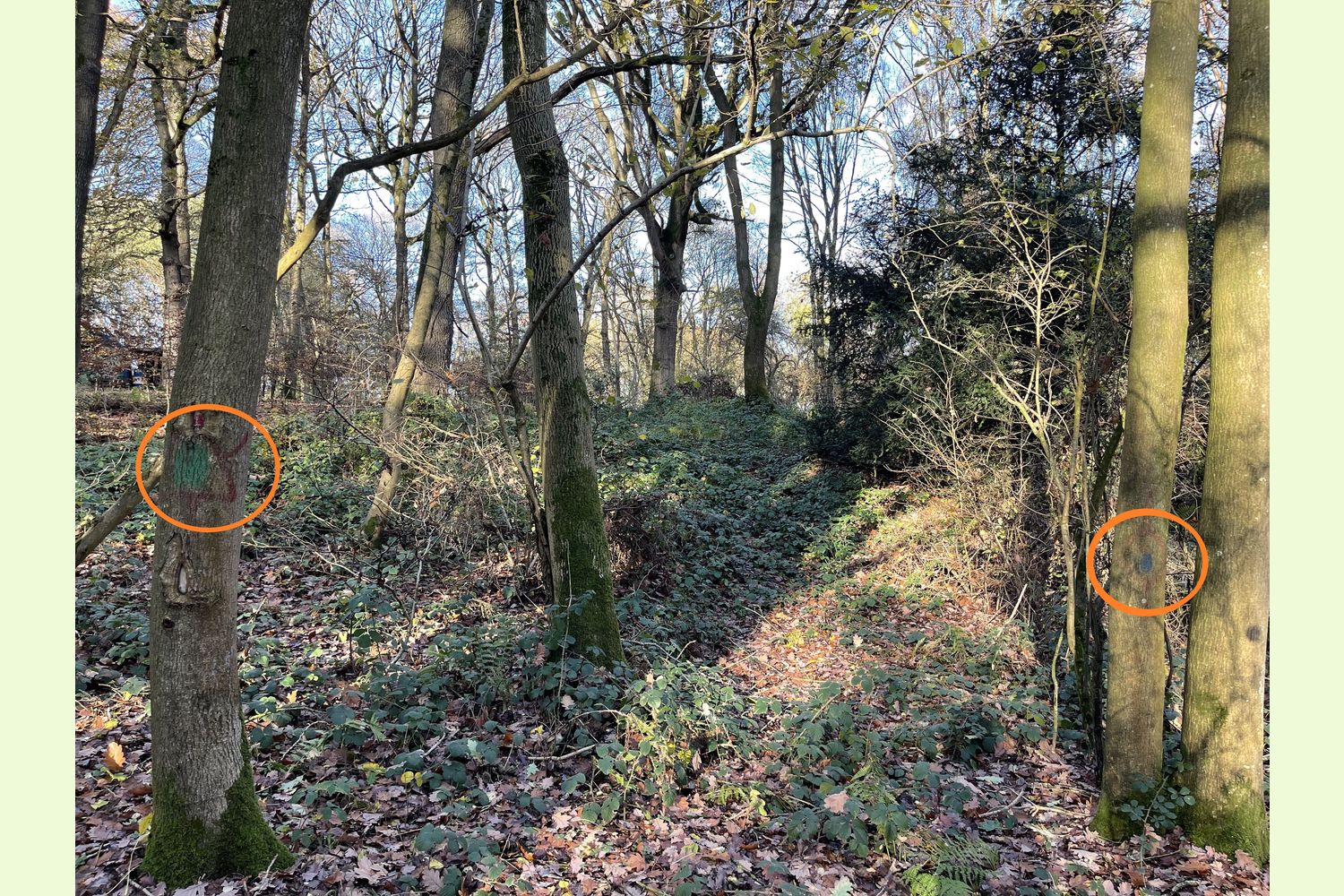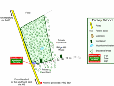 Boundaries: The boundaries of the wood are defined by the hardstanding area and track on the southern edge, by the road on the western edge, by fields on the northern edge. The eastern boundary is a straight line from the main track to the fenceline at the edge of the field. The starting point on the track is between the green painted tree (Didley Wood) and the blue painted tree (Ridge Hill Wood) (See photo 8). There should be similarly painted trees along the boundary, but they are hard to find!