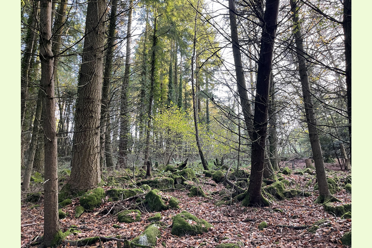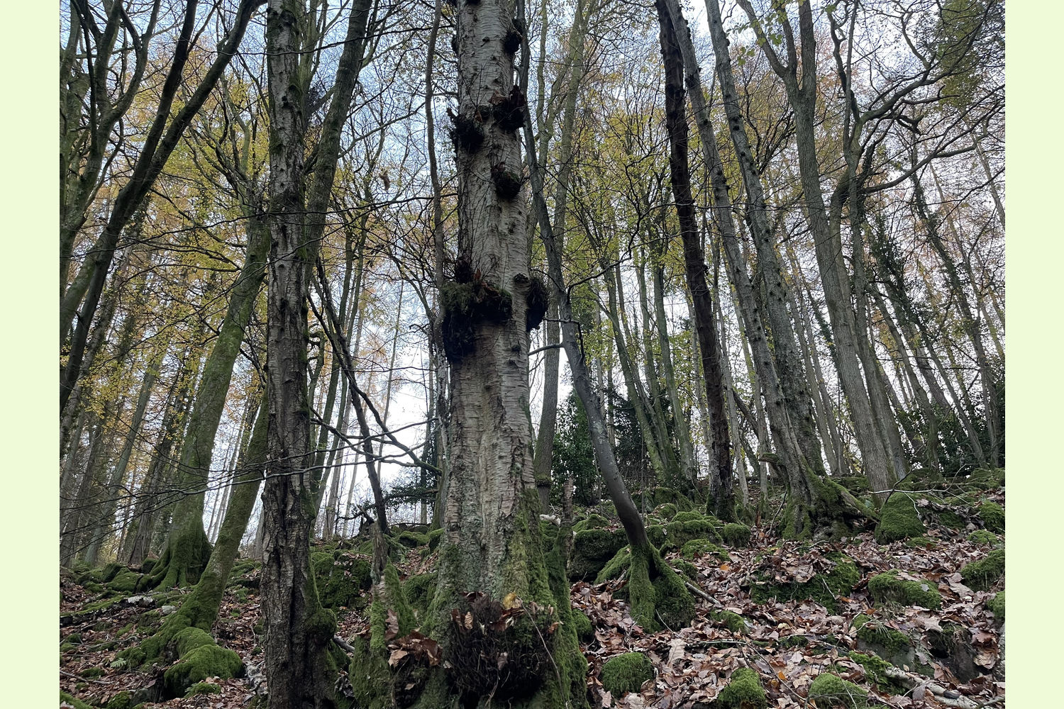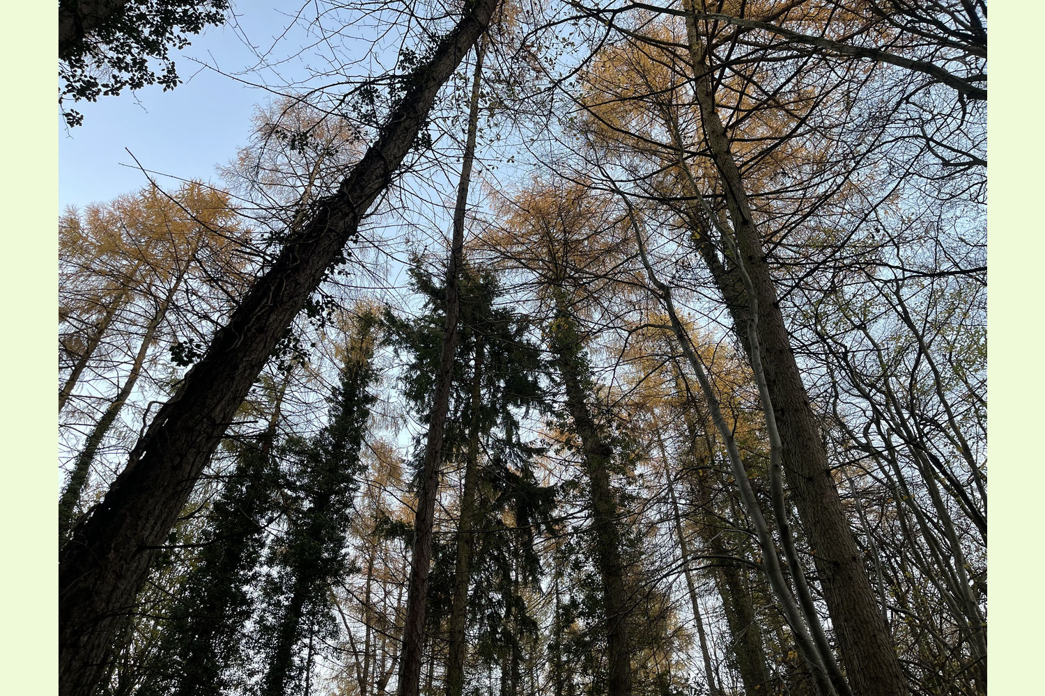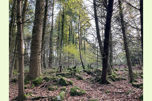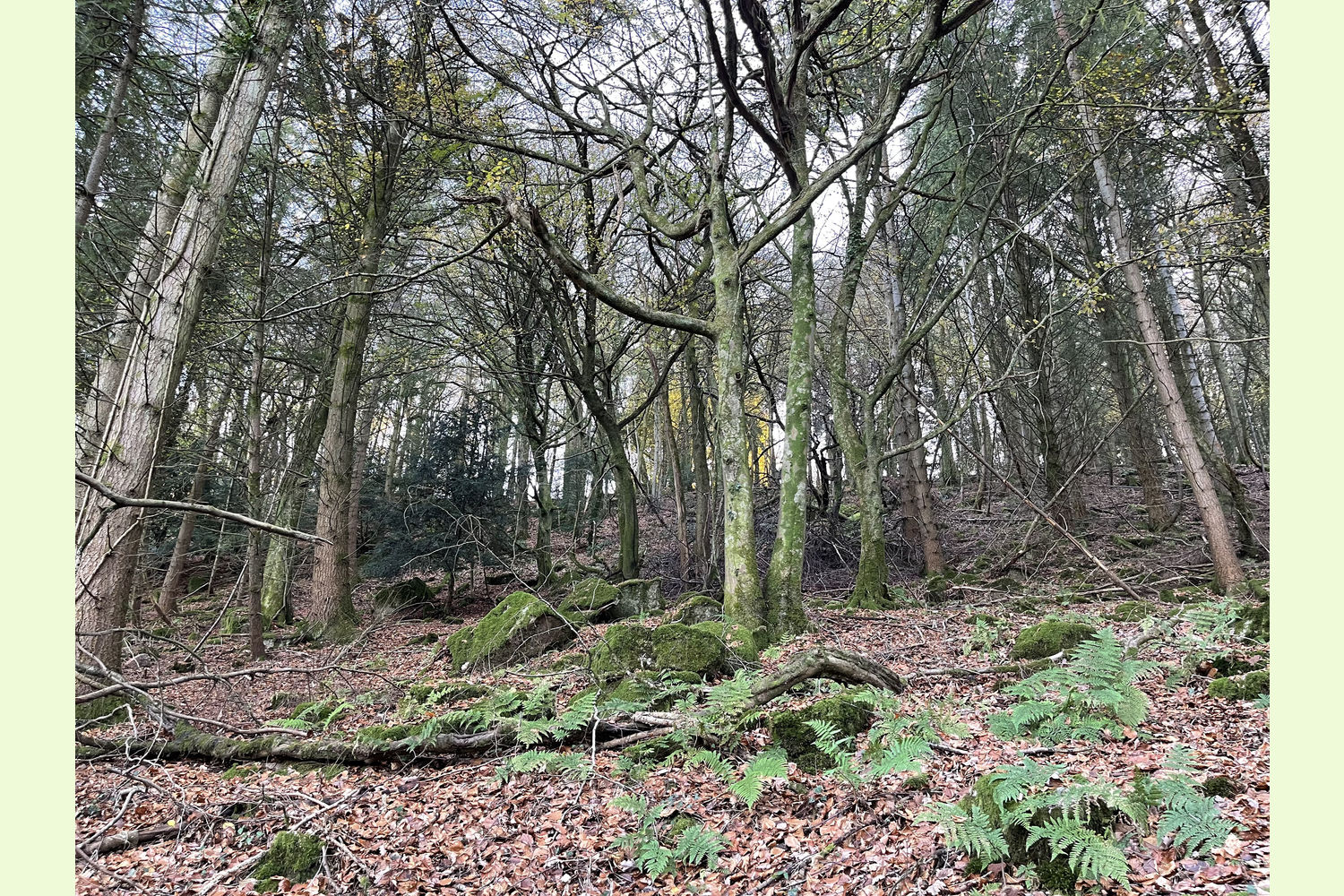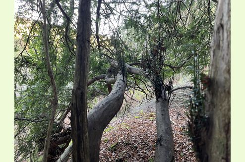 The Woodland: despite being designated as a plantation on an Ancient Woodland site, broadleaves are the major component. It has been planted with a mixture of more than 20% Oak, more than 20% Beech, over 20% Douglas Fir, over 20% Hybrid Larch, with the remaining 15% being birch and other broadleaves. (Note – these proportions are from a 2007 Management Plan, but are not believed to have changed significantly since.) There are also a number of yew trees to found around the wood, particularly at the eastern end.