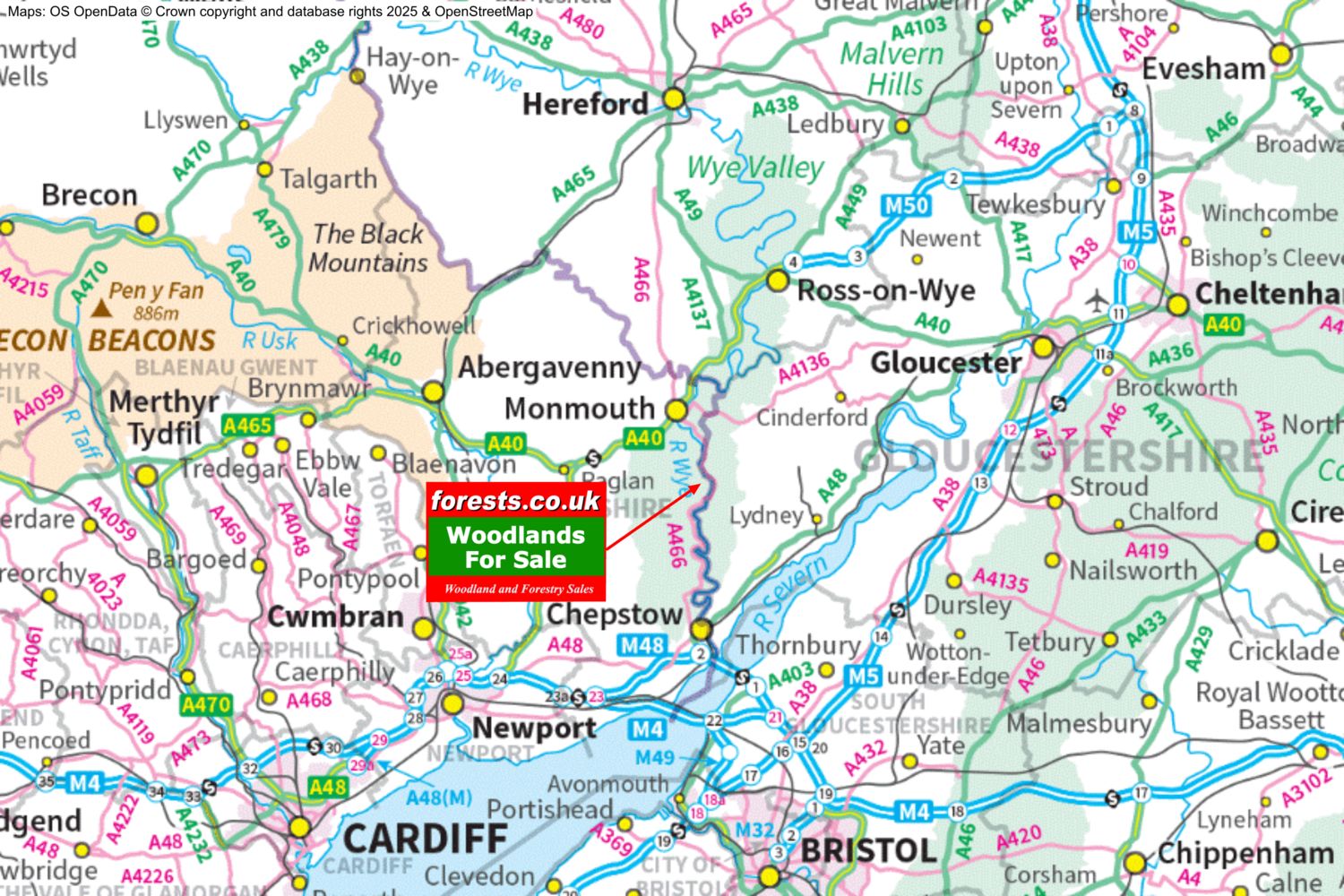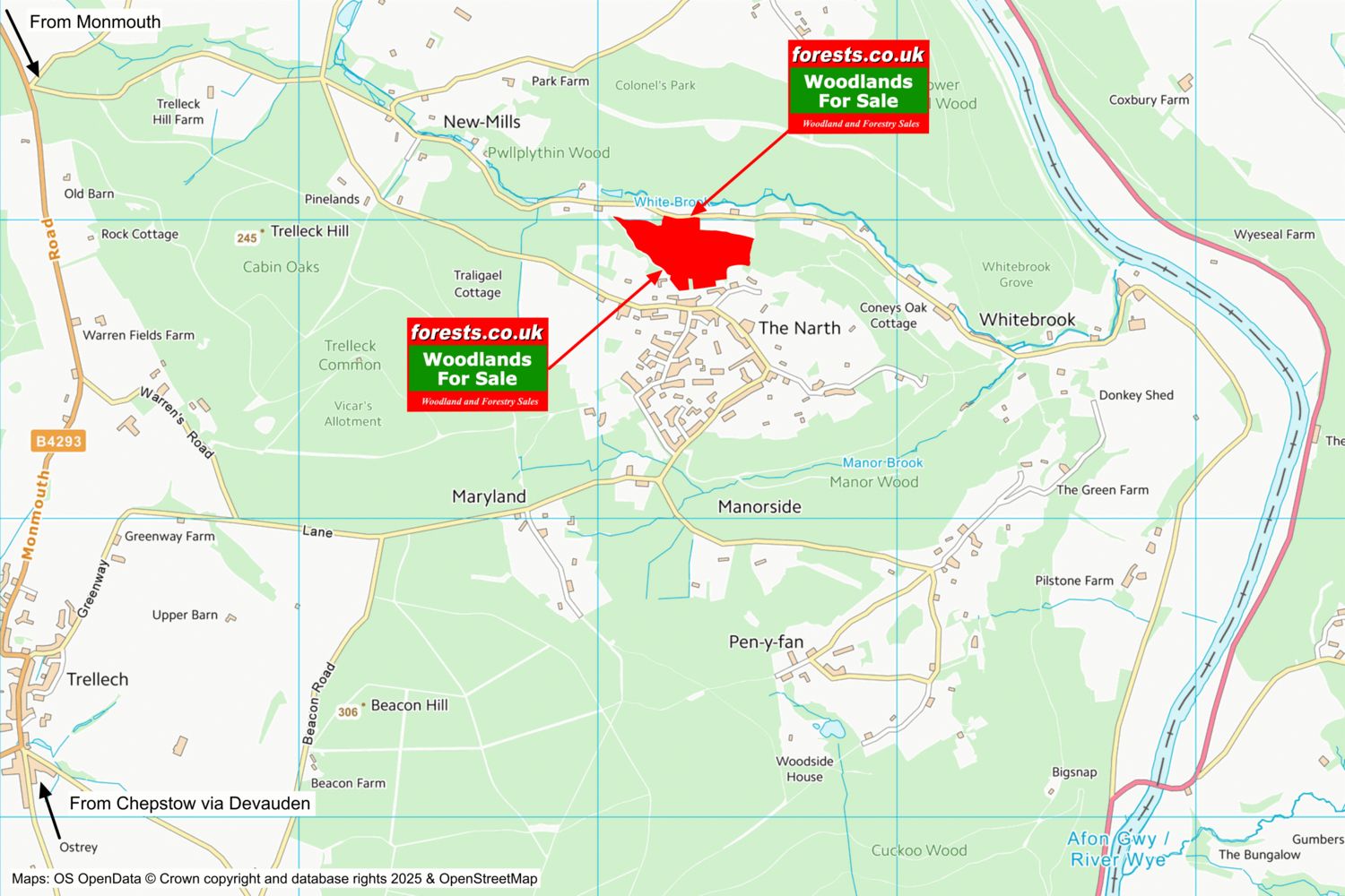 Follow the road for 1.5 miles, and just after you pass a house called Rosebank will see the Forests.co.uk For Sale sign on the right. If you reach Kinson Farm or the Whitebrook Restaurant, you have gone too far!