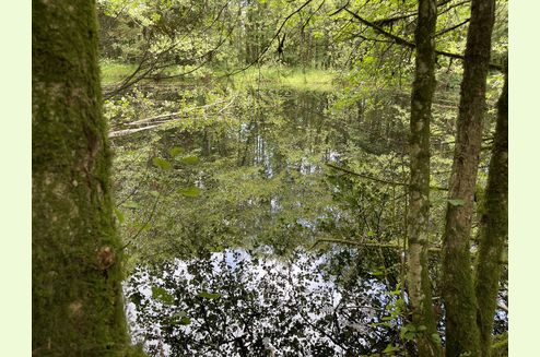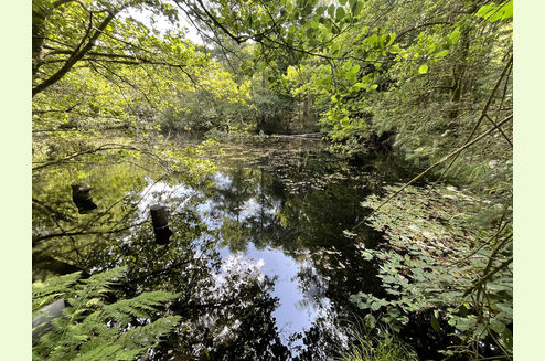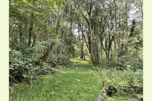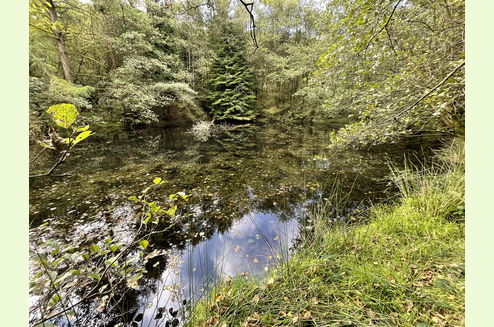 A mixed broadleaf woodland with a small stand of conifer, Douglas Fir, around the pond which gives this wood its Pond Wood nickname. The pond, estimated to be a quarter of acre, has previously been stocked with carp. There used to be a landing stage at the western end of the pond, but although some of the frame remains the deck itself has gone. The wood is flat to gently sloping up from the minor road that forms its north-eastern boundary. A short level stoned track leads a short distance into the wood, and this could easily be improved or extended by a new owner. The rest of the wood is flat to gently sloping, and is easily accessible on foot as the undergrowth is kept in check by the canopy. There are some wetter areas in the wood, with a carpet of wood mint in the more open clearings; the occasional red fruit of Lords-and-ladies provide a splash of colour around the pond.