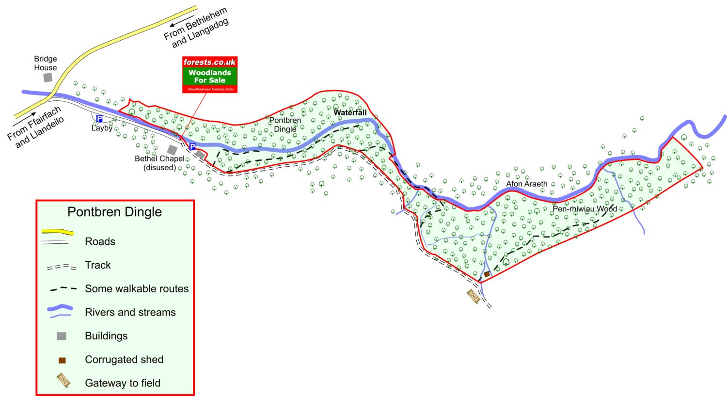 Boundaries: The western end of the wood, Pontbren Dingle itself, spans both sides of the valley, The northern boundary is fenced from adjoining farmland. Most of the southern boundary is the track, with a short section at the western end (as far as the end of the road), where the river is the boundary.