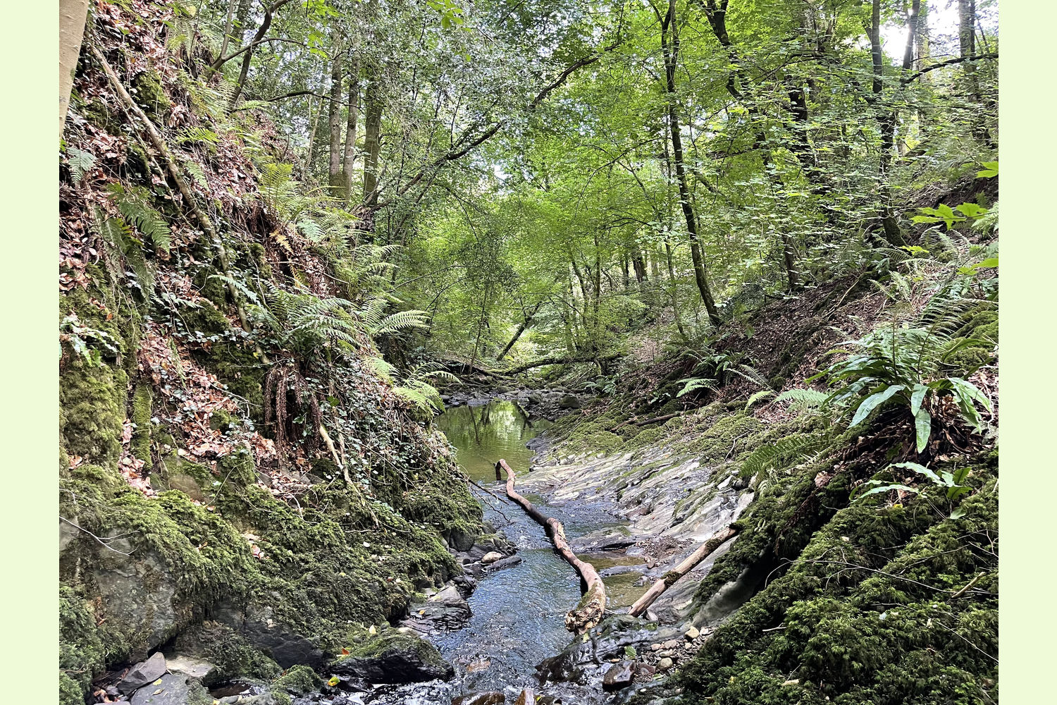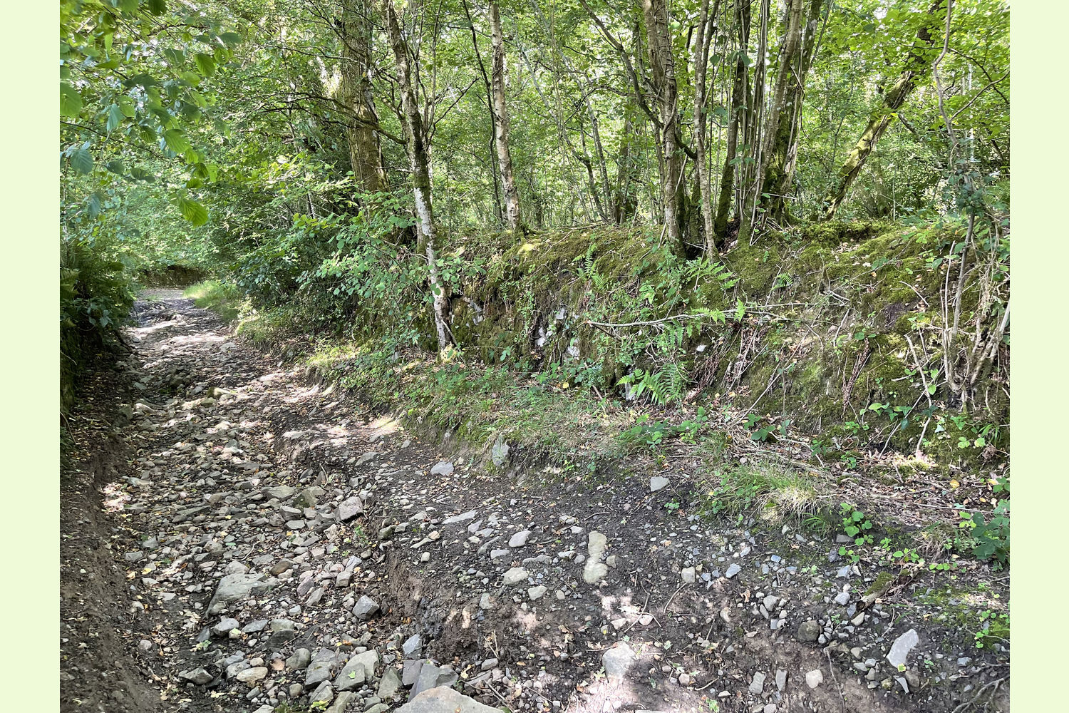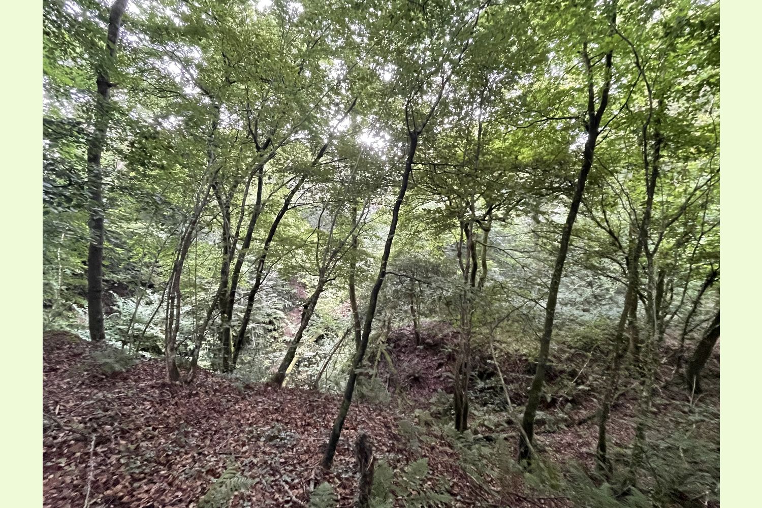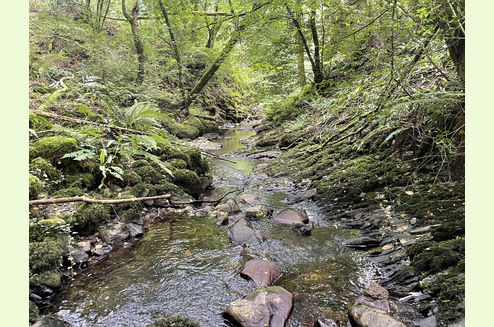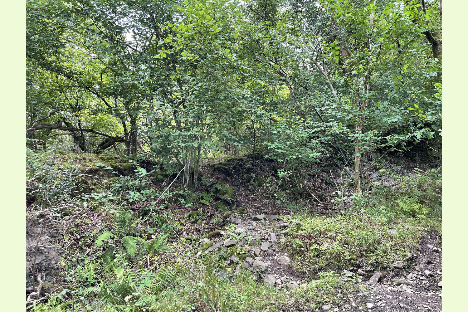 The eastern end of the wood, Pen-rhiwiau Wood, has the Afon Araeth as its northern boundary, a tiny stream as its eastern boundary, and an earthbank, fenced in places, as its southern boundary. As is usual where a river is a boundary, the owner of this woodland is deemed to own to the mid-point of the river.