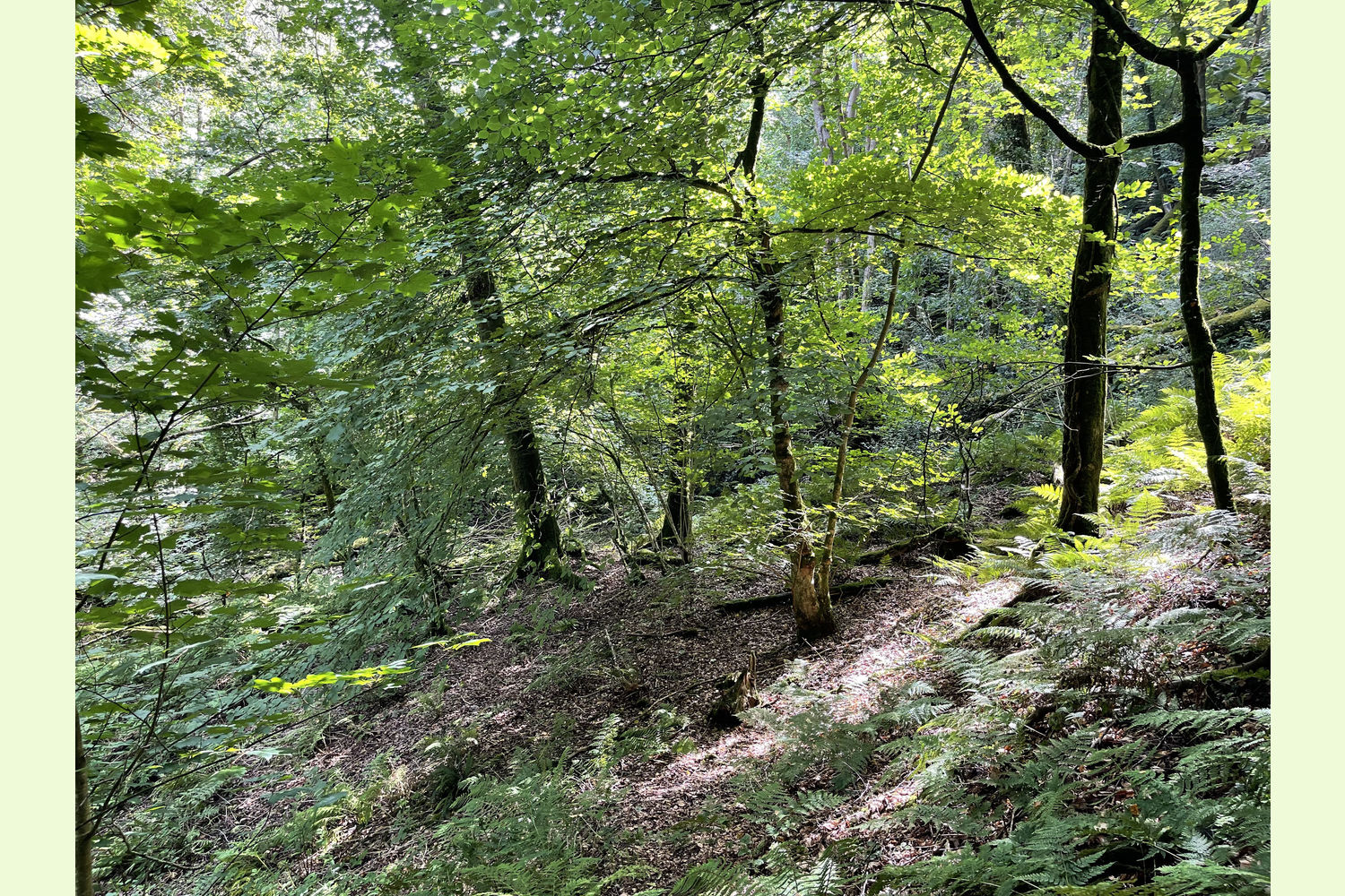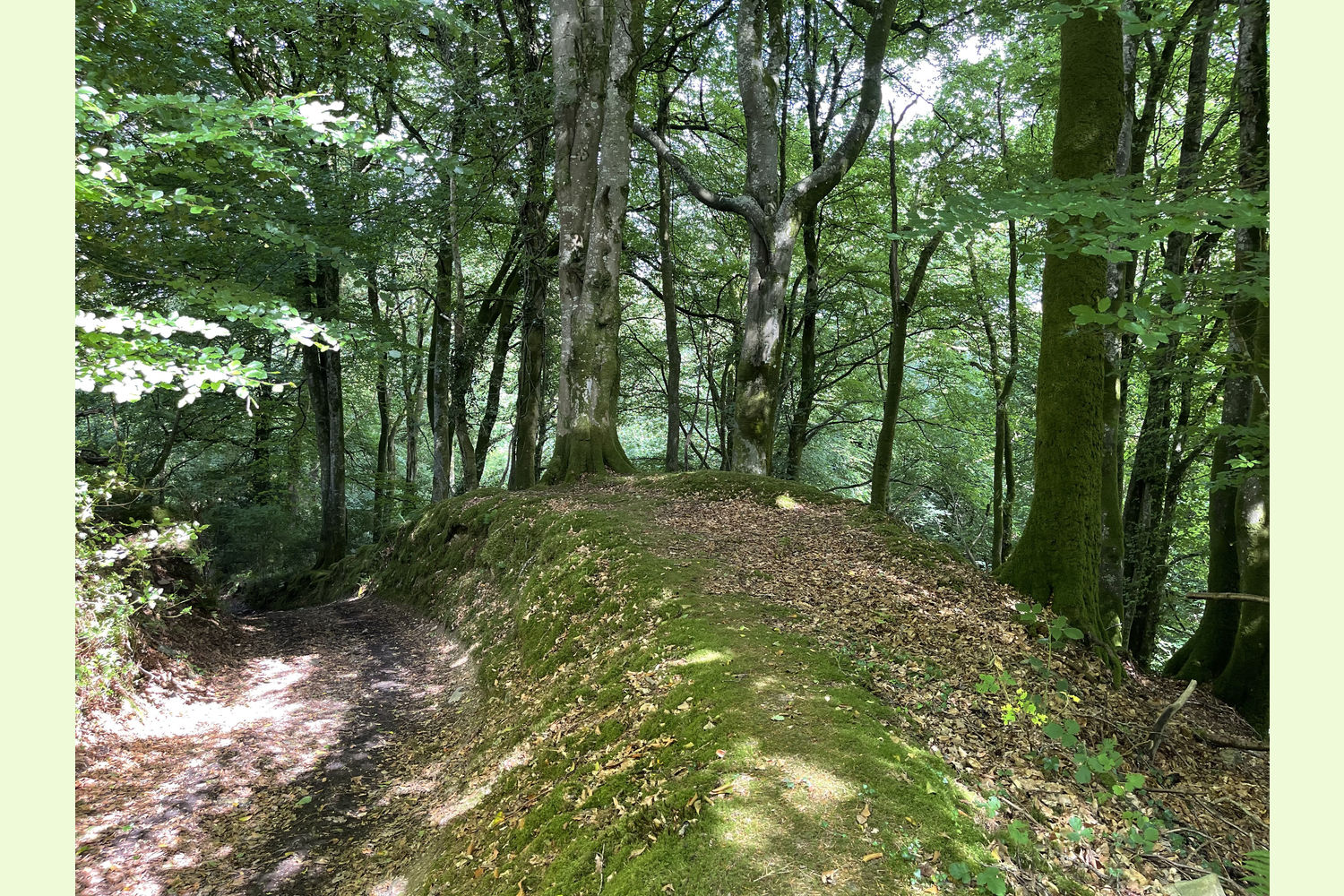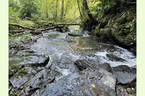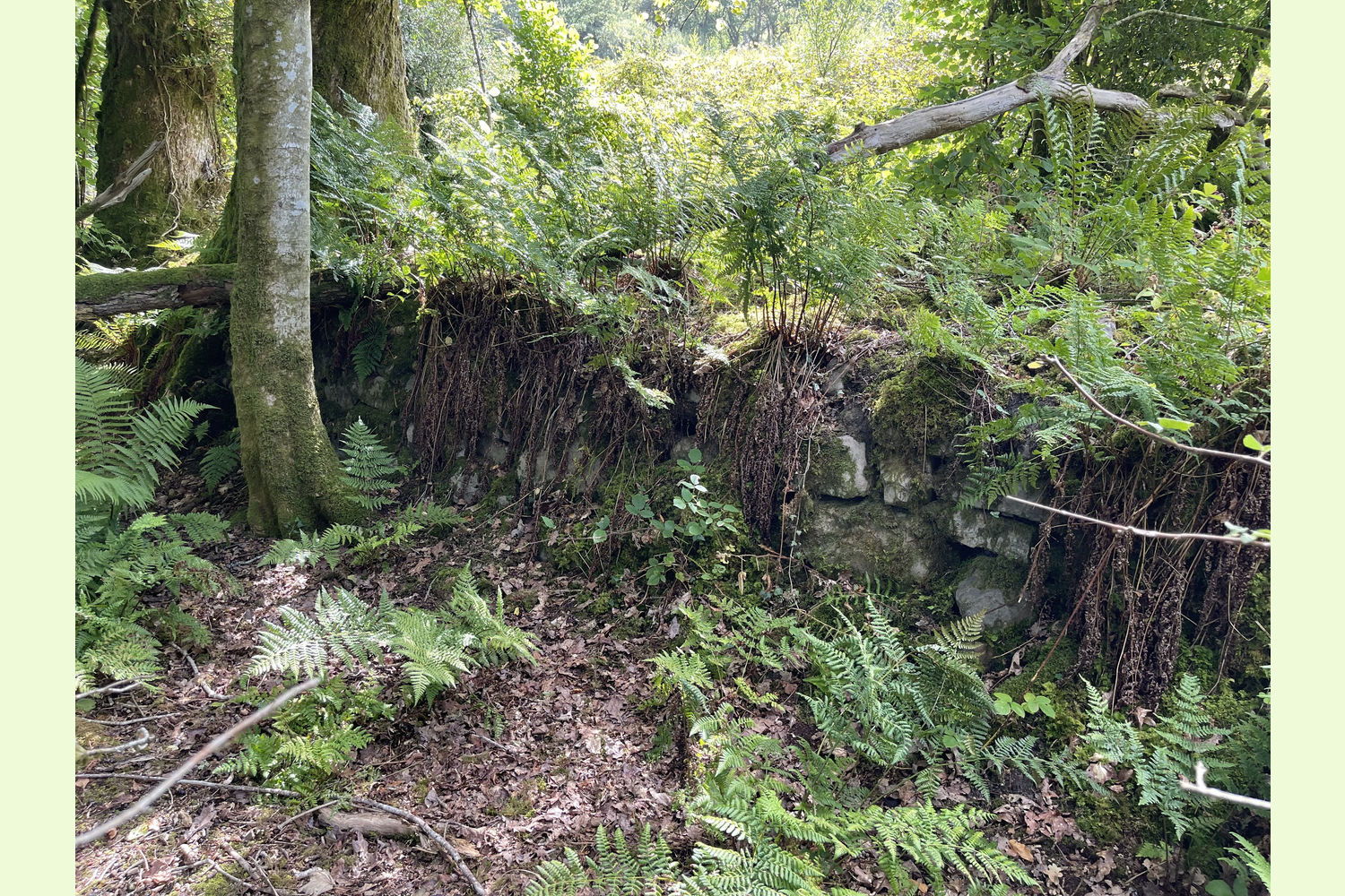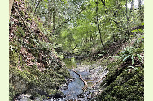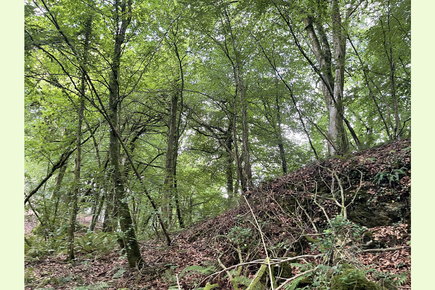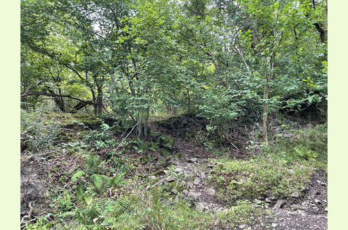 The eastern end of the wood, Pen-rhiwiau Wood, has the Afon Araeth as its northern boundary, a tiny stream as its eastern boundary, and an earthbank, fenced in places, as its southern boundary. As is usual where a river is a boundary, the owner of this woodland is deemed to own to the mid-point of the river.