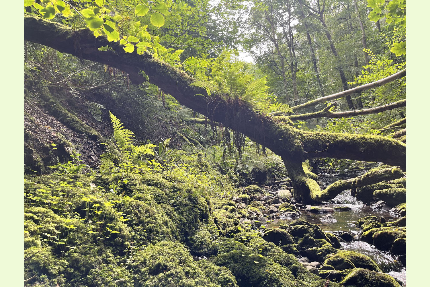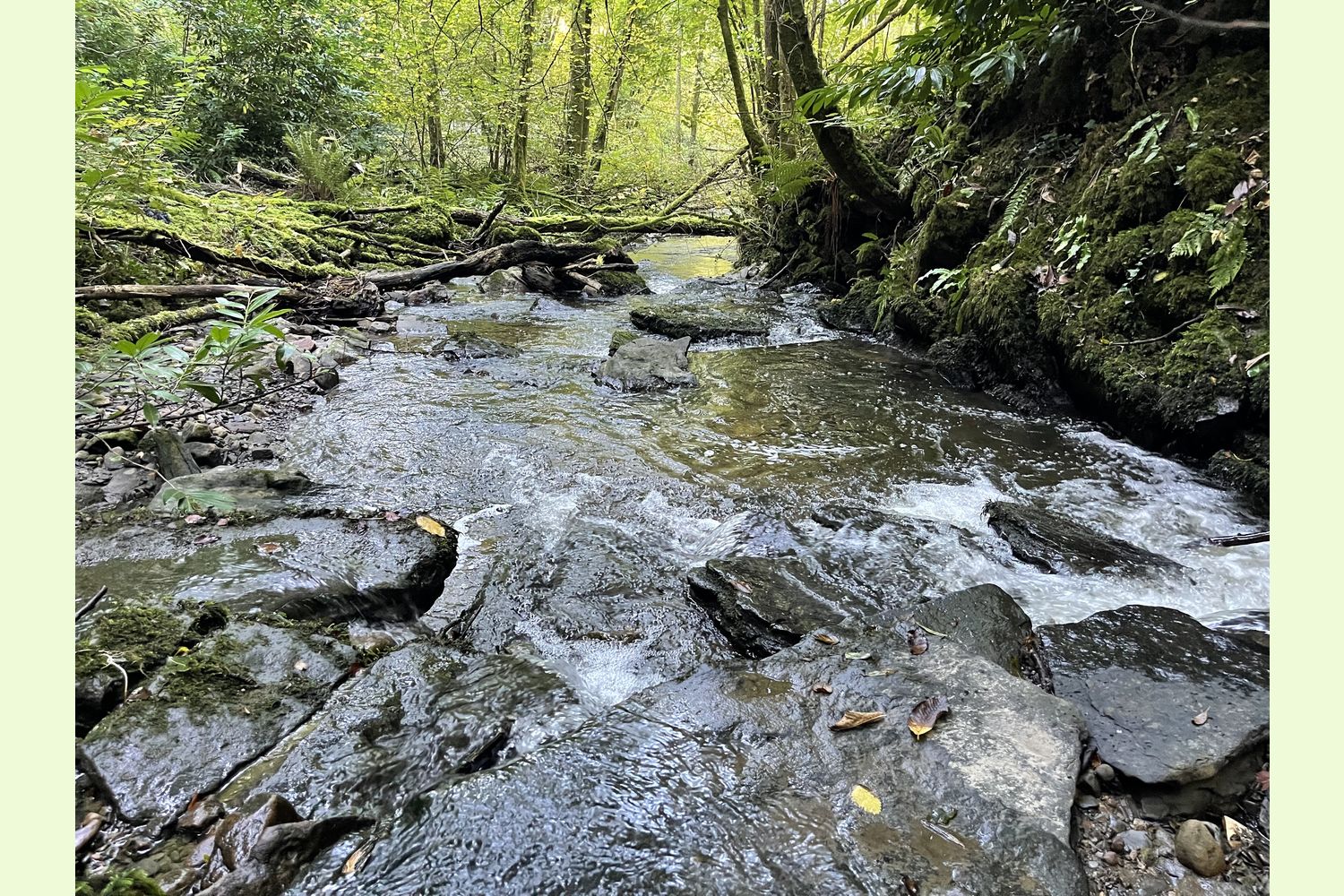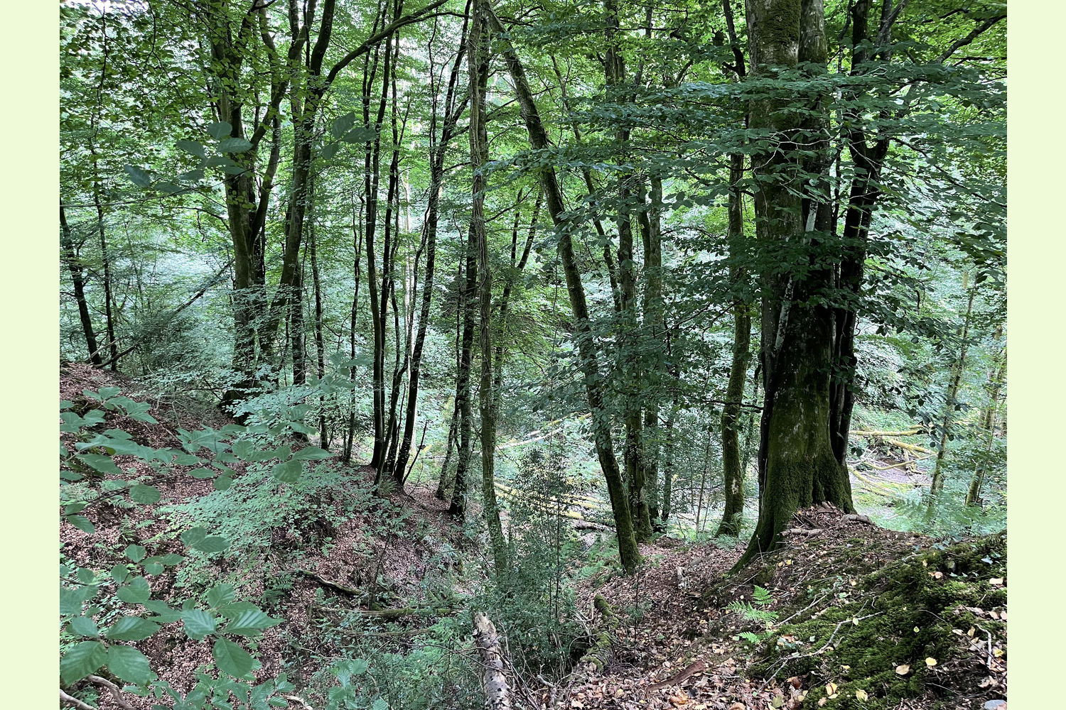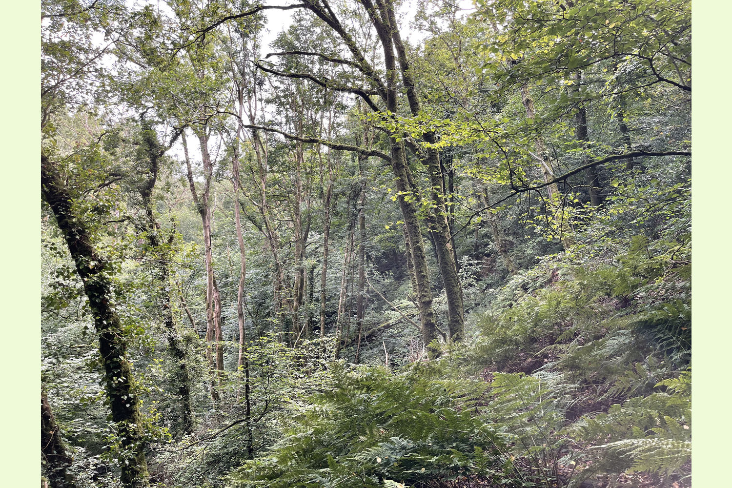The eastern end of the wood, Pen-rhiwiau Wood, has the Afon Araeth as its northern boundary, a tiny stream as its eastern boundary, and an earthbank, fenced in places, as its southern boundary. As is usual where a river is a boundary, the owner of this woodland is deemed to own to the mid-point of the river.