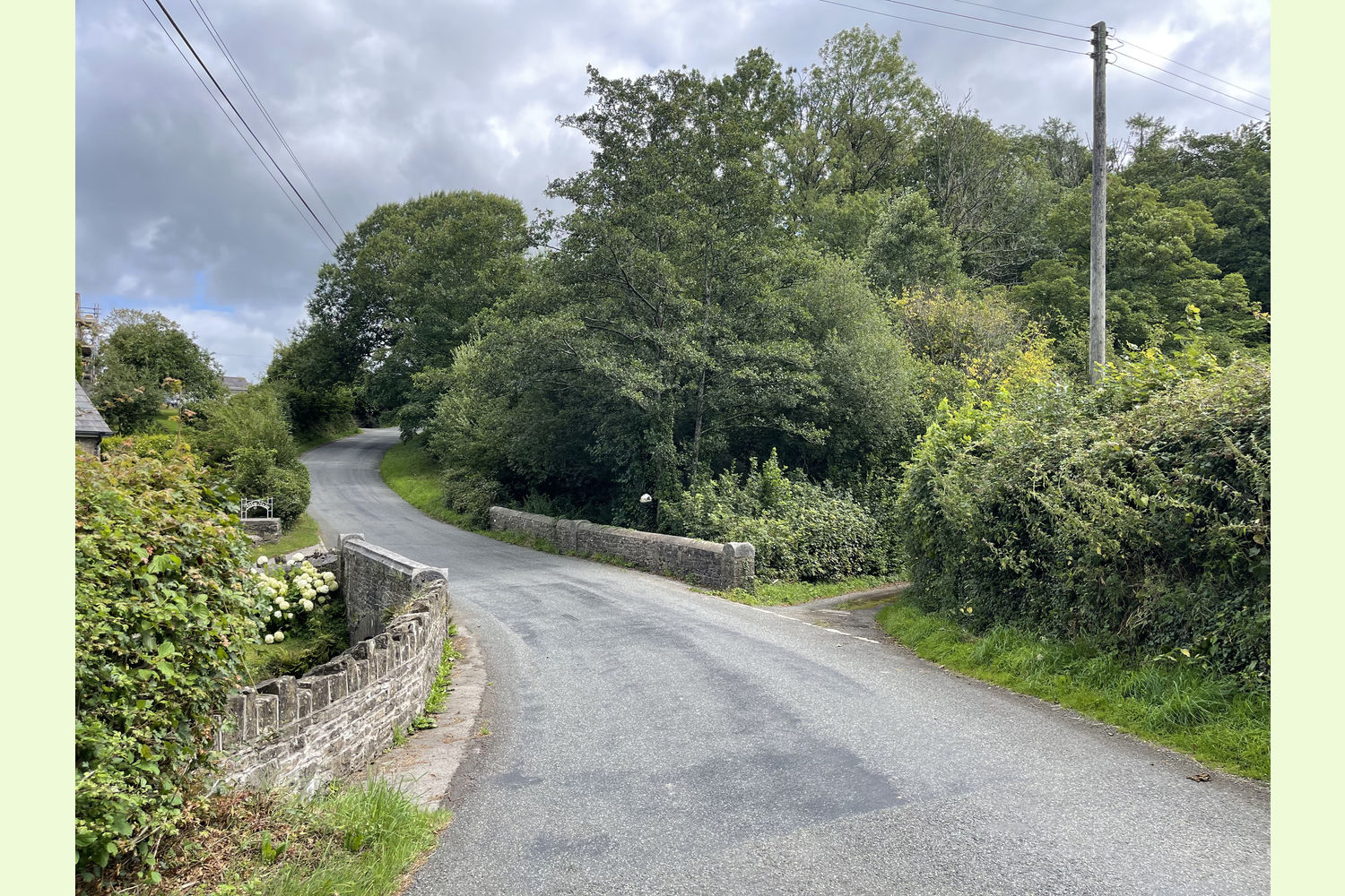 Follow this road to two and a half miles, then just before Bridge House (an imposing house on the left with three dormer windows), turn right onto a narrow road just before the bridge (see the last photograph).