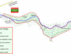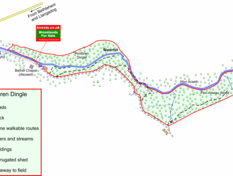 Boundaries: The western end of the wood, Pontbren Dingle itself, spans both sides of the valley, The northern boundary is fenced from adjoining farmland. Most of the southern boundary is the track, with a short section at the western end (as far as the end of the road), where the river is the boundary.
