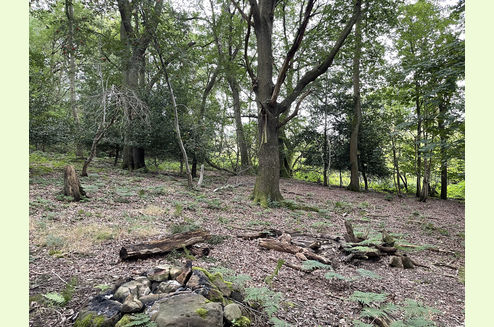 The path continues under the power lines until it comes to an end in a very secluded part of Strethill Wood. This area has some large broadleaf trees that are well spaced and provide an impressive high canopy. Underneath, the woodland floor is clear and flat providing a perfect spot for camping.
